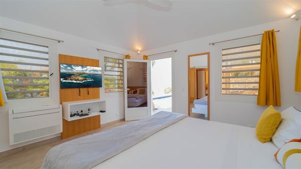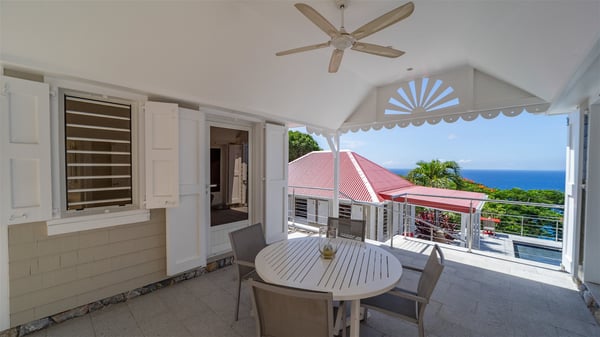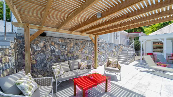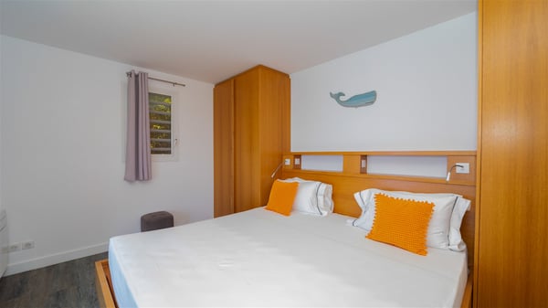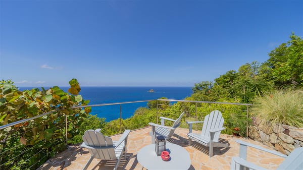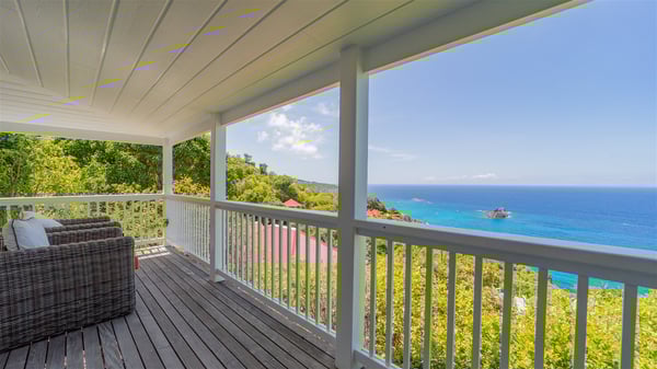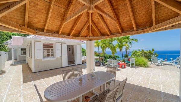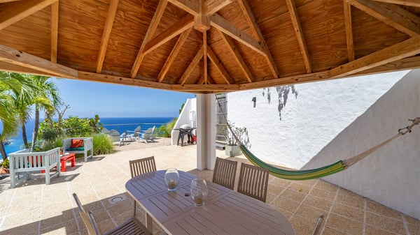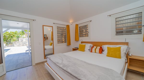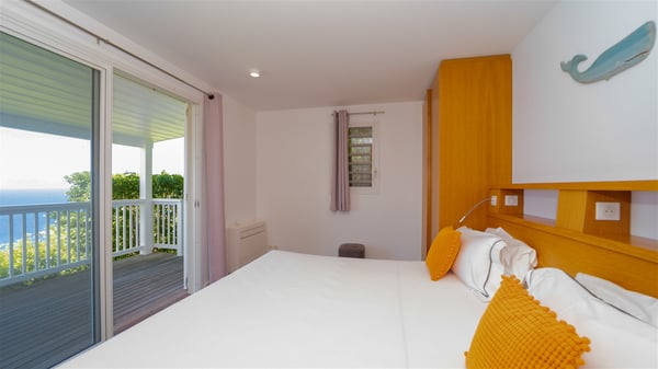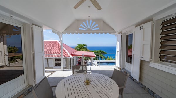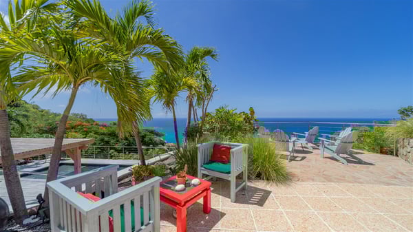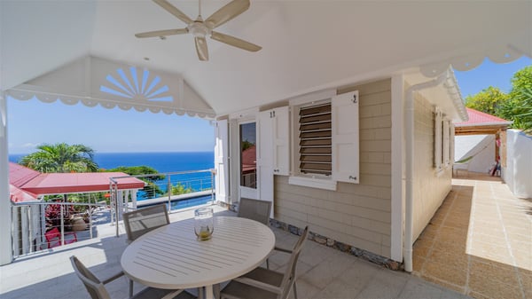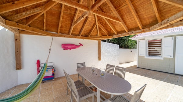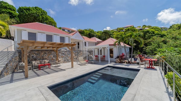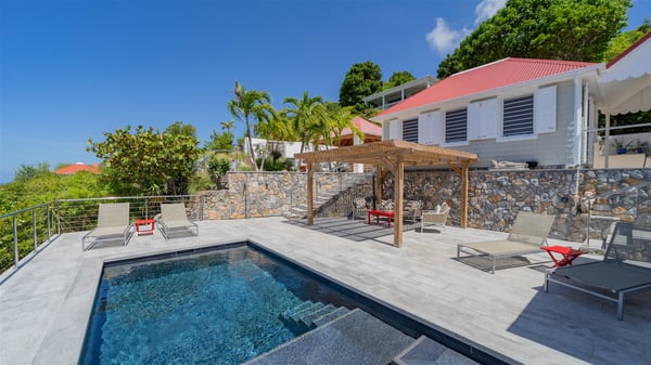 The villa rental La Baleine is a charming property ideally located in Colombier, facing a breathtaking ocean view. Built on the hillside, it opens onto a splendid panorama over the ocean, the glowing sunsets and the neighboring islets. Spacious and equipped with upscale amenities, this three-bedroom villa with swimming pool is the perfect place for a stay with family or friends in St-Barths. Designed over two levels facing the sparkling waters of the Caribbean, the holiday rental La Baleine offers the majestic spectacle of the deep-blue ocean, illuminated in the evening by the golden glow of sunsets. On the upper level, the living room welcomes guests around a lounge with cushion-covered sofas with shades of orange and gray, opening onto the well-equipped kitchen with central island. From there, you can access the terrace with al fresco dining area and barbecue, sheltered under a charming gazebo. Here, you'll enjoy the quiet ambience on the hammock in the mild air. A second dining room welcomes guests for meals or coffee breaks, for unforgettable moments of relaxation. Villa La Baleine offers many outdoor spaces opening onto breathtaking ocean views. On the main level, a vast space opens onto the ocean view over the hillside, offering a unique view over the sparkling waters of St-Barths, until the golden hour when the sky shows stunning golden colors. A few steps down from the gray stone wall is the terrace with swimming pool, surrounded by comfortable deckchairs in a very private atmosphere. There is also a lovely outdoor lounge sheltered by a sun-filtering pergola , the perfect spot to sip a cocktail in utmost calm. Villa La Baleine consists of three en-suite bedrooms with king or queen beds. They are spread over the property's two levels, one downstairs in a bungalow, and two on the main level above, and all open onto well-appointed private terraces. The wood and orange tones create a peaceful, comfortable atmosphere, as the trade winds gently blow across the island. What’s more, an office with a library is at your disposal during your dream stay in this luxurious, cozy villa. Opening onto breathtaking ocean and sunset views, villa La Baleine is the perfect location for an unforgettable six-person getaway in St-Barths.
