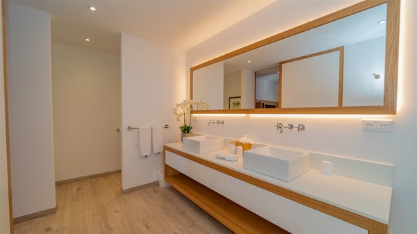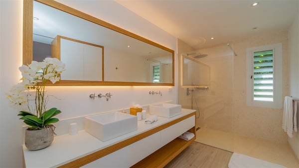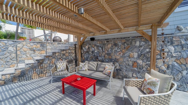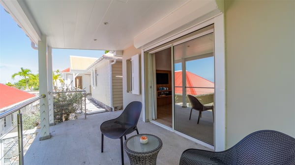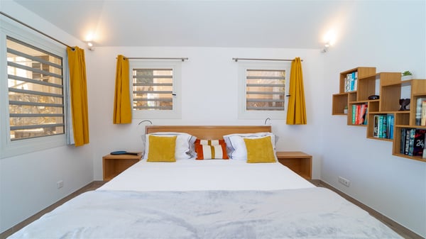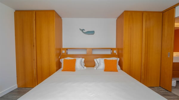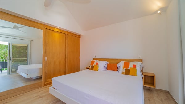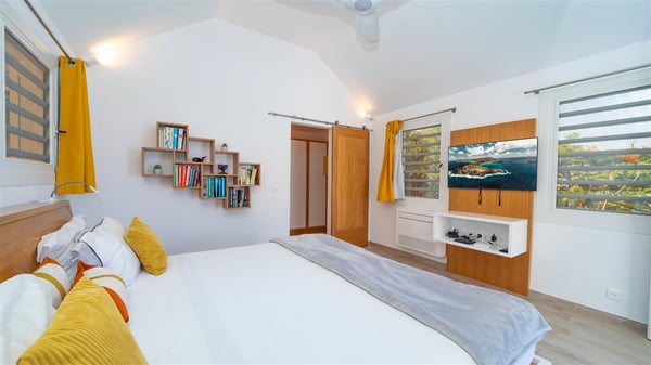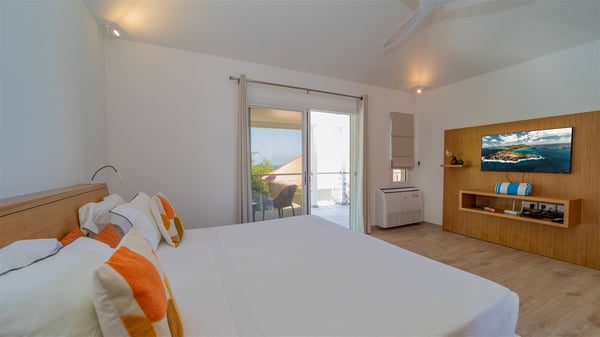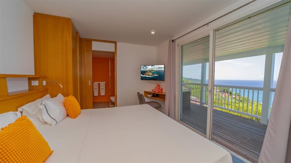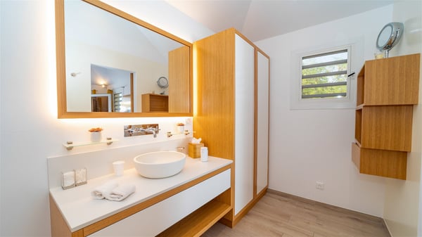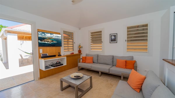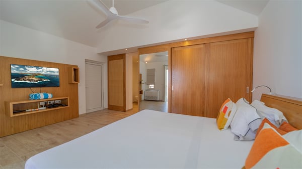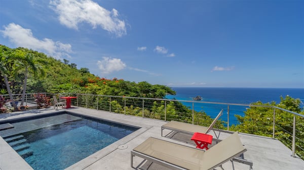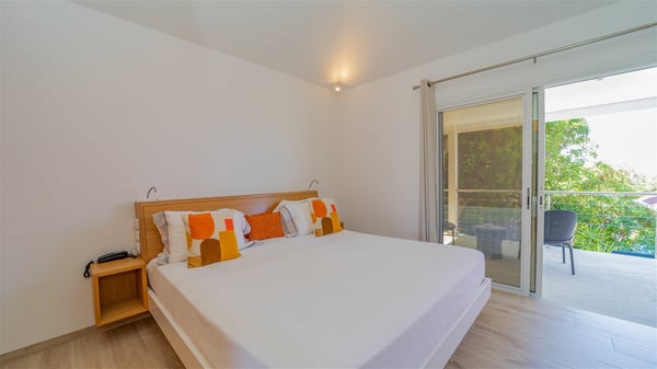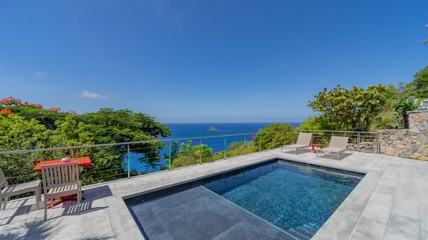 The villa rental La Baleine is a charming property ideally located in Colombier, facing a breathtaking ocean view. Built on the hillside, it opens onto a splendid panorama over the ocean, the glowing sunsets and the neighboring islets. Spacious and equipped with upscale amenities, this three-bedroom villa with swimming pool is the perfect place for a stay with family or friends in St-Barths. Designed over two levels facing the sparkling waters of the Caribbean, the holiday rental La Baleine offers the majestic spectacle of the deep-blue ocean, illuminated in the evening by the golden glow of sunsets. On the upper level, the living room welcomes guests around a lounge with cushion-covered sofas with shades of orange and gray, opening onto the well-equipped kitchen with central island. From there, you can access the terrace with al fresco dining area and barbecue, sheltered under a charming gazebo. Here, you'll enjoy the quiet ambience on the hammock in the mild air. A second dining room welcomes guests for meals or coffee breaks, for unforgettable moments of relaxation. Villa La Baleine offers many outdoor spaces opening onto breathtaking ocean views. On the main level, a vast space opens onto the ocean view over the hillside, offering a unique view over the sparkling waters of St-Barths, until the golden hour when the sky shows stunning golden colors. A few steps down from the gray stone wall is the terrace with swimming pool, surrounded by comfortable deckchairs in a very private atmosphere. There is also a lovely outdoor lounge sheltered by a sun-filtering pergola , the perfect spot to sip a cocktail in utmost calm. Villa La Baleine consists of three en-suite bedrooms with king or queen beds. They are spread over the property's two levels, one downstairs in a bungalow, and two on the main level above, and all open onto well-appointed private terraces. The wood and orange tones create a peaceful, comfortable atmosphere, as the trade winds gently blow across the island. What’s more, an office with a library is at your disposal during your dream stay in this luxurious, cozy villa. Opening onto breathtaking ocean and sunset views, villa La Baleine is the perfect location for an unforgettable six-person getaway in St-Barths.