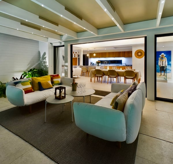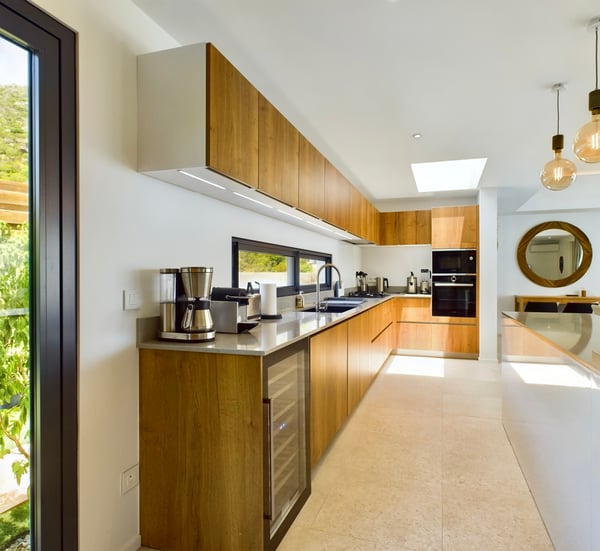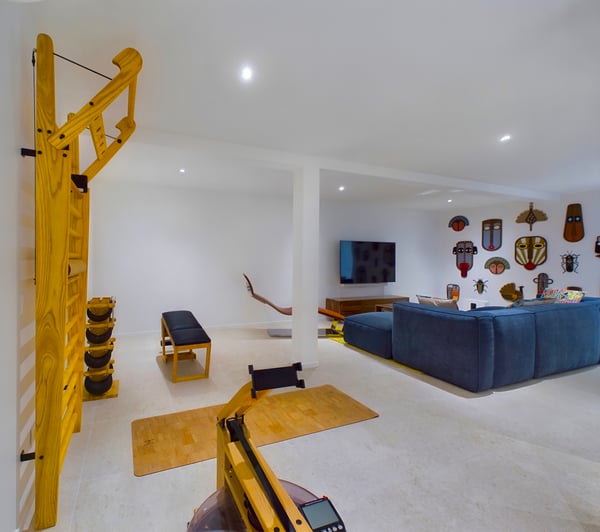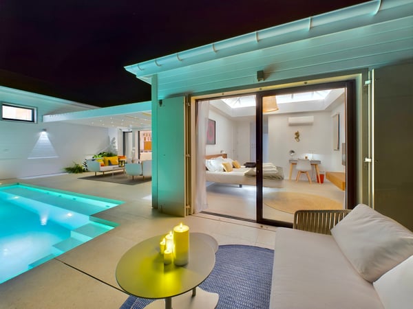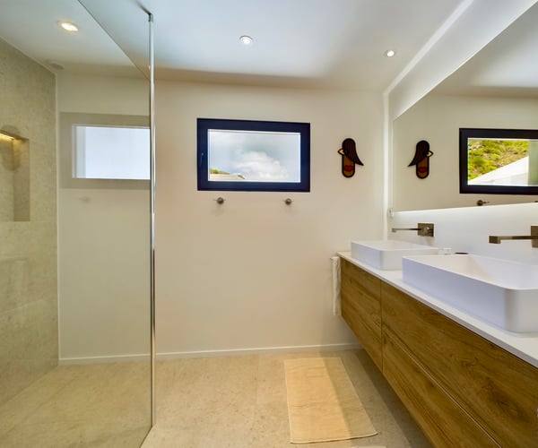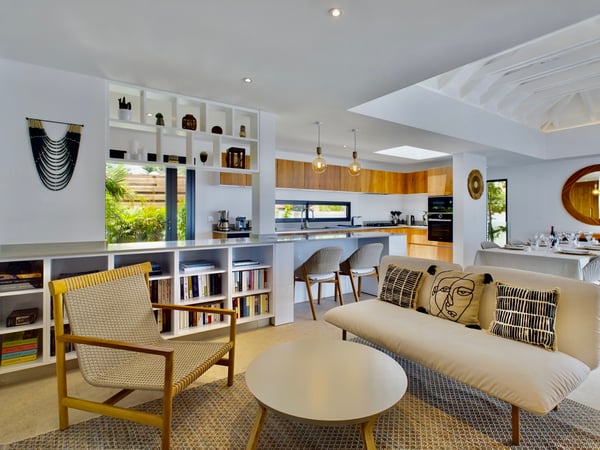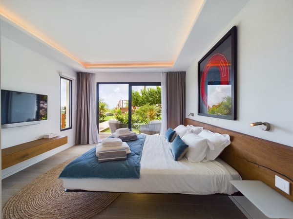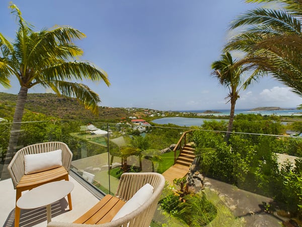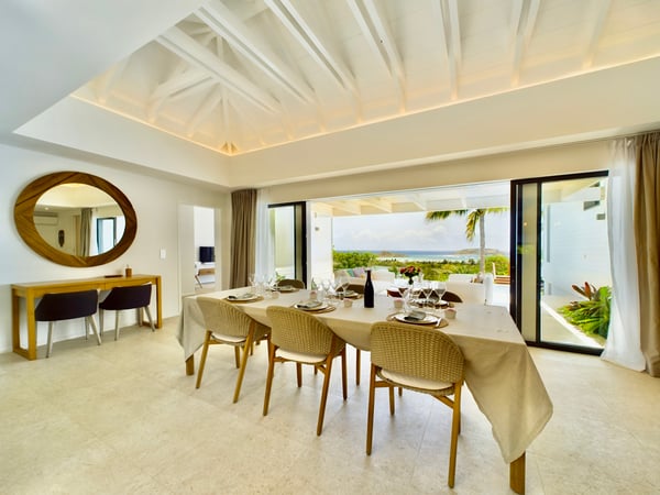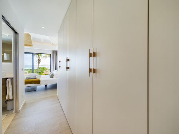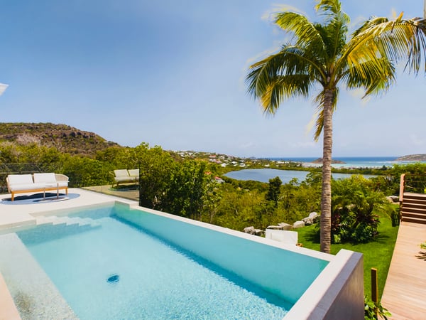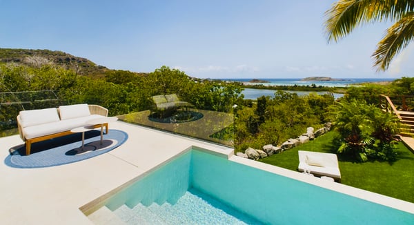 Near the water sports and beach restaurants of Grand Cul de Sac, the newly built Villa Ty Bihan is an oasis for people who look for modern, comfortable, and simple ways of living while on their St. Barth holiday. At the same time, the luxury rental property is a haven for aquatic sports enthusiasts, as Grand Cul de Sac is one of the island’s prime spots for kayaking, paddle boarding, and kiting. Inside, Villa Ty Bihan is decorated in an unpretentious style, with an emphasis on natural materials and soft colours. Its hillside location is high enough to afford it pleasing views over the lagoon but still low enough for a short drive to the beach and its many seaside restaurants. Guests arrive at the house by way of the garden, and then they enter the large open-plan living room on the main floor of the villa. This space blends seamlessly into the fully equipped kitchen and onto the terrace, which has covered and sunny areas, as well as a heated infinity pool. While the villa’s architecture and design are understated, its views of the lagoon and the ocean are impressive. The two main bedrooms are similar in size and located on opposite sides of the living area. Each one has a king-size bed, an ensuite bathroom with a shower, a Smart TV, a dressing area, a sea view, and a small outdoor living space. One of them is a few steps above the main area, while the third bedroom is a full flight of stairs below. This room has the same amenities, except for a partial ocean view and an outdoor space that faces the garden. Downstairs, there is also a family room with large couches facing a television, a fitness room, and an additional bathroom. The entire villa is fully air-conditioned.