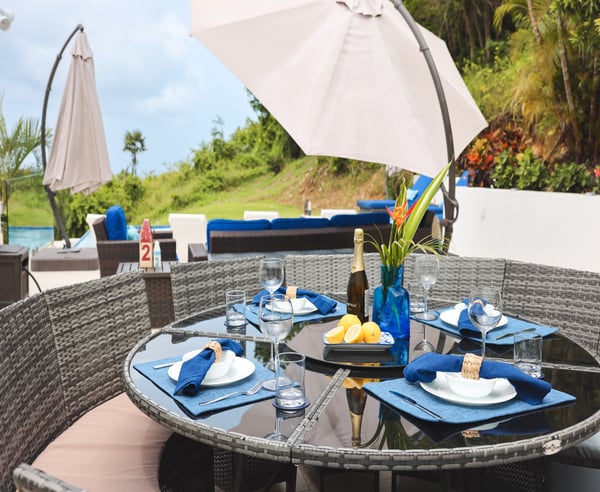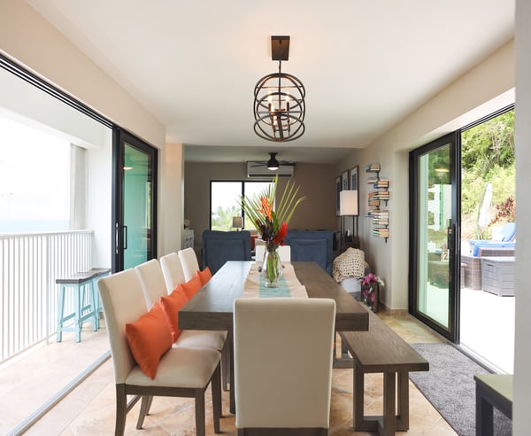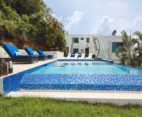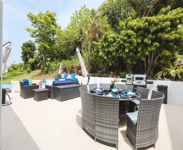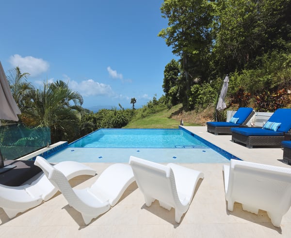 Nestled in the heart of Wintberg Estate, this stunning island pad is ready for its grand debut, and it's a true showstopper. The new owners have spared no detail, leaving no stone unturned as they meticulously transform this residence. If you’ve ever wished a rental had something, this property probably delivers it. Three cozy bedrooms await you in the main villa, including the primary. Two additional retreats on located outside on the lower level, each with their own exclusive entrance. Five, impeccably remodeled bathrooms are ready to pamper you. The kitchen is a stunner, and the living room is an invitation for good times with your favorite people. But the real treasures are the double patios just off the dining room. One leads to an infinity pool that'll have you feeling like you're in your own slice of paradise. The second patio is your front-row ticket to savoring those epic 180-degree views from high up on Winteberg Estates. If you're visiting during the breezier months of December - May, make sure to inquire about the rate to have the pool heater turned on during your stay!
