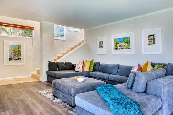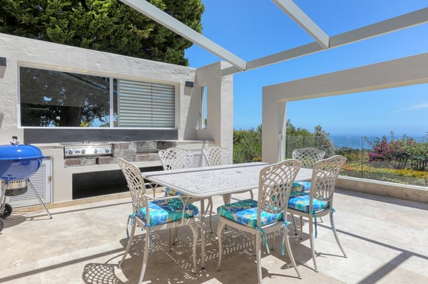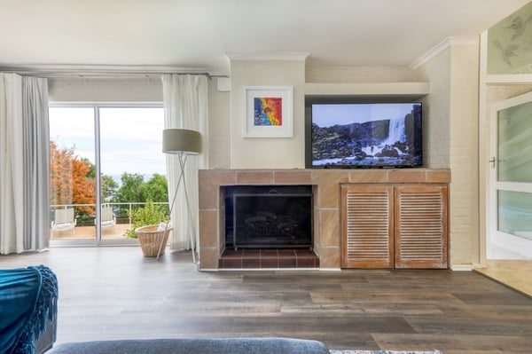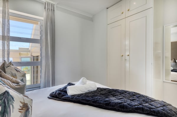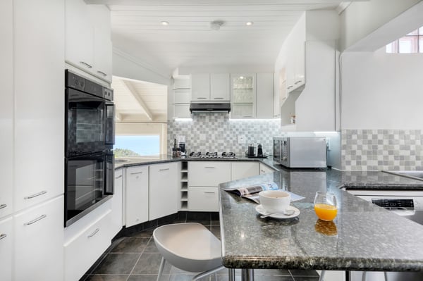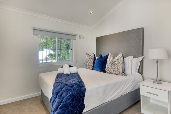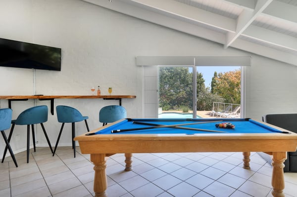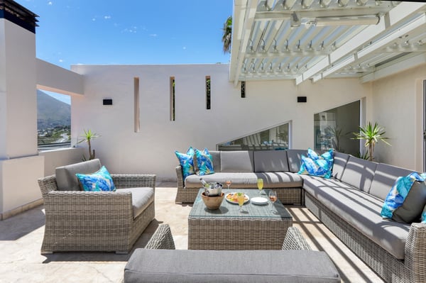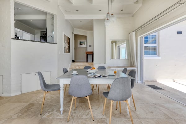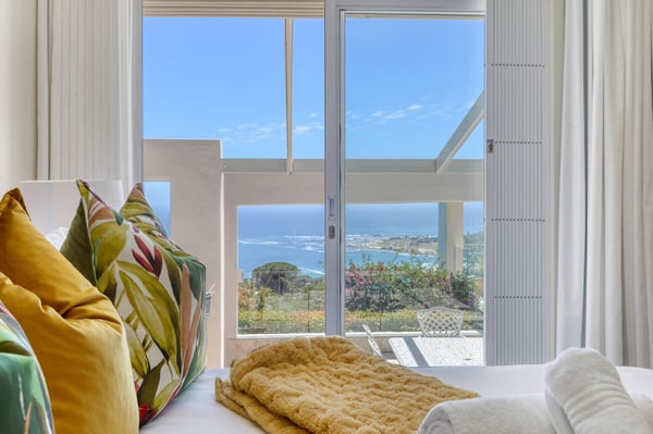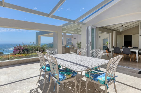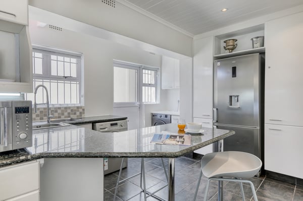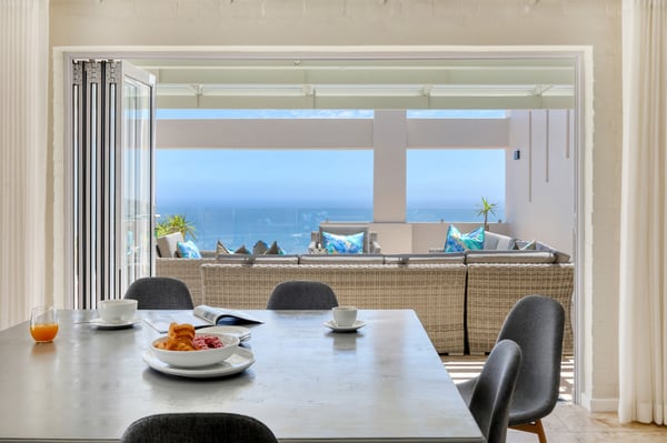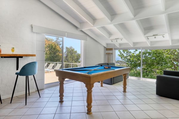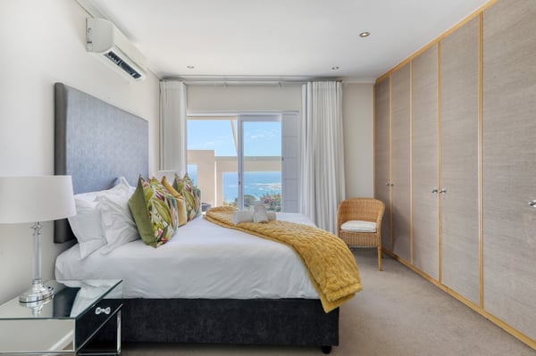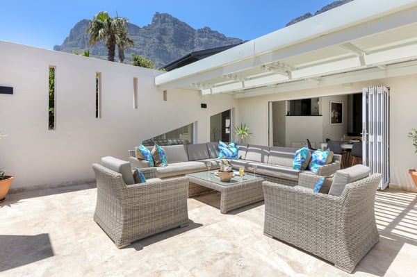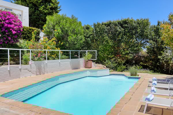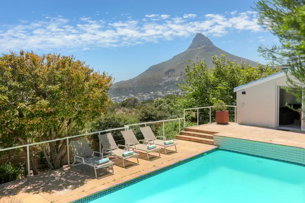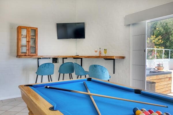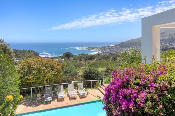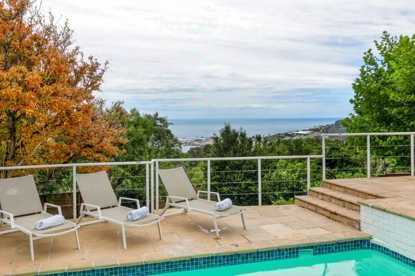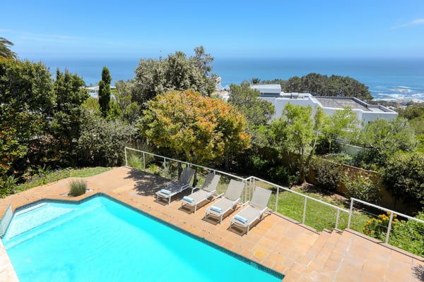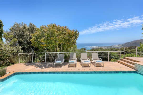 Bella Riposa is a beautiful 5-bedroom, three-storey holiday villa located in the heart of Camps Bay with views of the Atlantic Ocean and Lions Head. There is ample entertainment space on the upstairs and downstairs terraces, with a private garden at the bottom of the property, a large swimming pool and a wood-fired hot tub - perfect for a summer stay in Camps Bay. Natural sunlight floods the whole house, giving it a beautifully warm summer feel. The decor is neutral, fresh and white, adding to the ambience of space and tranquillity. On the first level, you'll find 4 comfortable bedrooms and 2 bathrooms - 1 en-suite and 1 family bathroom. The primary bedroom has a beautiful view of the Atlantic Ocean and a large en-suite bathroom. Bedrooms 2, 3 and 4 share a family bathroom. The 5th bedroom is situated just off the dining area and boasts its own en-suite bathroom. The upstairs living area offers guests a fully equipped kitchen and a comfortable dining area with glass stacking doors that open out onto the top patio. Here guests can enjoy an alfresco meal and or sundowner while marvelling at the spectacular sea views. The middle level has a spacious lounge area with a TV and a wood-burning fireplace. The ground floor is the entertainment area with its own full bathroom and shower. There is a pool table, comfy couches, and bar counter plus stackable doors that lead out to the pool and a wood-fired hot tub. Please keep in mind this is an older Camps Bay home, lending itself to larger outdoor spaces which is a rarity in the area. This house is best suited to the unfussed traveller who would like a central base in Camps Bay with beautiful views from which to spend their days exploring the Mother City.