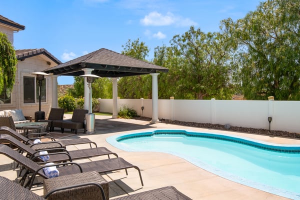 Welcome to Hollowbrook Estate! This elegant wine country estate is perfectly located within walking distance of award-winning wineries and vineyards. The main house offers high ceilings, ornate wood trimmings, and plenty of space for large groups. Guests will rejoice when they step into the fully equipped chef’s kitchen, 26 seat private movie theater, and beautiful two-story guest house– complete with a full kitchen, billiards table, and 82-inch screen TV. Outside, there’s never a dull moment with amenities for all ages, including a private pool and lounge, outdoor kitchen and built-in grill, and a fully-equipped playhouse. With a beautiful gazebo on the property, this home is an ideal place to watch the sunset over the hills with your favorite people, wine glass in hand. Nearby Attractions: Akash Winery & Vineyard, Villa De Amore Temecula Wedding Venue, South Coast Winery Resort & Spa, Wilson Creek Winery, GrapeSeed Spa, Lorenzi Estate Vineyards, Van’N Boozy Wine Tours, California Dreamin’ Balloon Adventures (Hot Air Balloon). Only a short drive from Los Angeles and San Diego, Temecula is a charming town with lots of character. Known for its upscale wineries and extensive vineyards, Temecula offers plenty of unique opportunities for those who appreciate the art of the grape and delicious food. Not a fan of wine? Worry not, this town has plenty of other attractions such as golf, hot air ballooning, farmers markets, and shopping. At the heart of Temecula lies Old Town, where visitors can take a step back in time as they meander through wooden boardwalks lined with western-inspired buildings. Parking Details: - The garage can accommodate 2 cars. - The driveway can accommodate a total of 6 cars. 8 cars is the maximum number of cars allowed at the property - No parking is allowed on Calle Contento or the service driveway, only within the property main gate. - Guests must maintain a fire lane to the house for emergency vehicles. - Street Parking is not allowed. STR Permit No: RVC-913