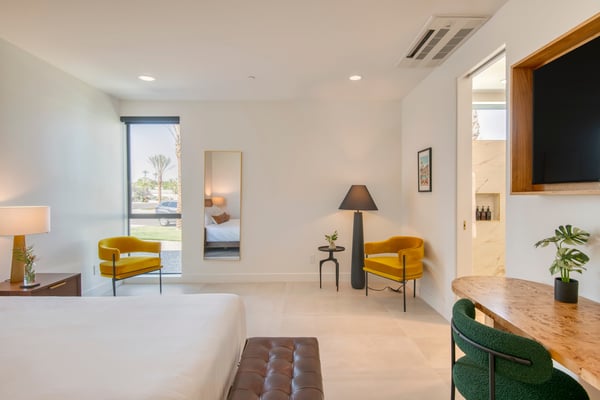 • The Murphy bed available in our Media room can be prepared ahead of your arrival upon request. Once installed by our local team, the bed is not designed to be moved by guests. You won't be able to raise or lower the bed yourself during your stay. • The rates for this property are dynamic and are constantly changing. The price listed above is only a starting rate and does not necessarily reflect the price for your travel dates. Please contact a Villa Specialist for exact pricing details. • Please be aware that during festivals like Coachella, although the Villas are within walking distance of the polo grounds, road closures and specific access points can extend the walking distance to the festival entrance to approximately 1.4 miles. While some guests choose to walk and walking is possible, we strongly recommend purchasing golf cart services for easier access. • Pets may be permitted upon request, at an additional fee. Please note that the backyard gates are wide enough for a small dog to get through, so we recommend supervising pets when outdoors. • Pool heat is available at this home at an extra cost and needs to be requested at least 48 hours before your stay (maximum temperature of 86). Spa Heat is complimentary for guests. • Pool heat is not available between May 1st and October 1st. • 2 twin rollaway beds with pillows and bedding can be provided upon request and are included as part of your nightly rate. • You must be at least 21 years old to book this property. • This is a smoke-free home. Violation of the no-smoking policy will result in a $500 fee for additional cleaning and other related costs, in addition to the Guest being responsible for any damages attributable to smoking beyond said fee. • Please be considerate of your neighbors and mindful of noise levels. Noise violations may result in fines. Please also note we do not provide speakers or sound systems.