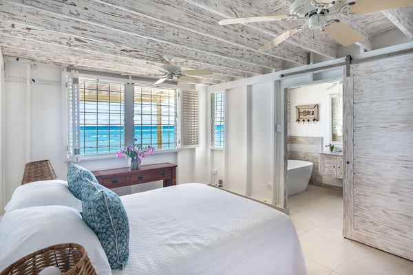 Please note the beach experiences seasonal fluctuations in its accessibility. A gorgeous little family friendly-villa awaits you in paradise. Sunset Reach is a charming beachfront three-bedroom, vacation bungalow located on the soft white sands of Mullins Beach in St. Peter, famously part of the Platinum Coast of Barbados. Designed with the "less is more" philosophy of beach life, crisp white interiors blend with cool white wood vaulted ceilings, eye-catching art and a blend of sea and woody tones. Perfectly positioned on the northern tip of the beach with a private stairway to the calm shores below, the villa is open plan, very bright and airy with a modern kitchen, spacious sunbathing deck, and covered patio for outdoor dining and chasing sunsets. The Bay is well known for water sports, snorkeling and the occasional visiting sea turtle. The master bedroom is en suite with a king bed, the second bedroom has a double size bed whilst the third bedroom has twin beds. All bedrooms have air-conditioning and ceiling fans. Mullins Bay is positioned between the two main West Coast towns of Speightstown and Holetown, both of which offer a plethora of choices for casual oceanfront dining and evenings on the town at the many bustling hot spots. Sunset Reach may be rented separately or with its sister villa Easy Reach.