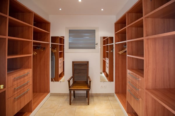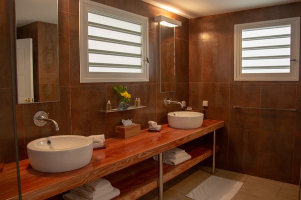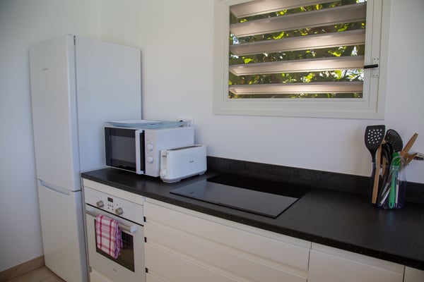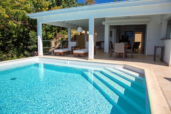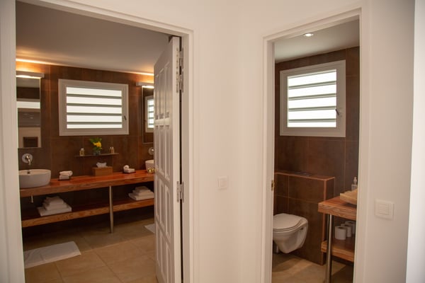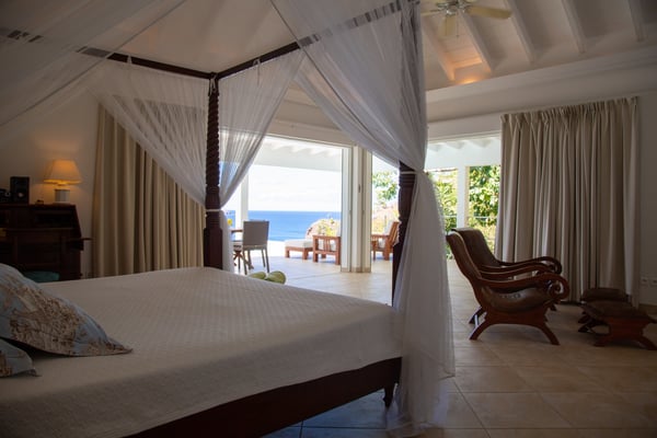 Located on the heights of Lorient, vacation rental Tortue is the perfect and very private home for a romantic stay in Saint Barths. Only a few minutes from the beach, facing a beautiful panorama, this one-bedroom air-conditioned vacation house offers the utmost comfort and high-end amenities for your next Caribbean stay. With a spectacular view over the ocean and the surrounding islands, vacation villa Tortue welcomes you in a modern and elegant design. The living room and dining room are located under the covered terrace gently swept by trade winds. In an open space ideal for relaxing and resting, there are armchairs with soft footrests facing the view near the dining table which can accommodate four guests. The kitchen opens onto this covered terrace and is well-equipped with all appliances for the preparation of meals and drinks. On the sunny terrace located at the front of the villa, comfortable lounge chairs covered with cushions are set up around the lovely infinity swimming pool with steps in front of the perfect horizon view. In a setting of green hills and tropical trees, the atmosphere is peaceful and quiet. As the kitchen opens onto the terrace, this is a perfect setup to sip a cocktail in front of the breathtaking beauty of lush nature. A barbecue is also available for cooking grilled meats that you’ll enjoy when dining alfresco. The luxurious villa Tortue welcomes you in its spacious and air-conditioned bedroom. It is furnished with a king-size four-poster bed decorated with light curtains, as well as a single bed and a sitting area with armchairs and a television. There is a large and comfortable closet in a decor of dark wood, contrasting with the striking whiteness on the walls. The charming vacation rental Tortue is the perfect place for a very private retreat in St. Barts. It can be rented individually or with the villa next-door Sucrier for a total of three bedrooms. When rented separately, both villas are very private.