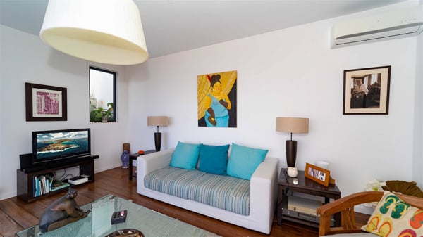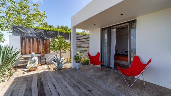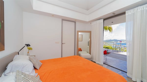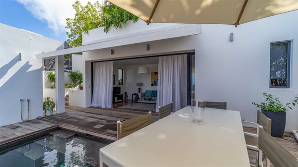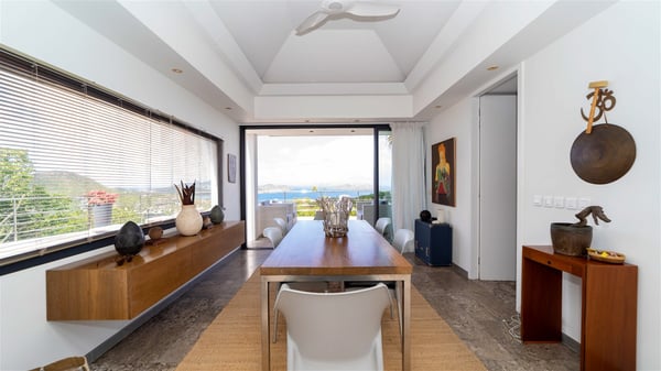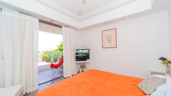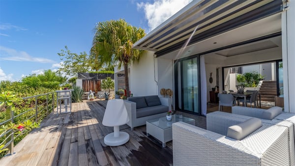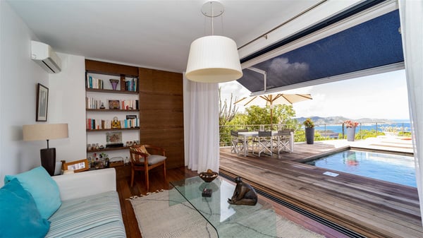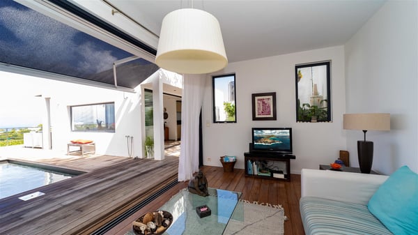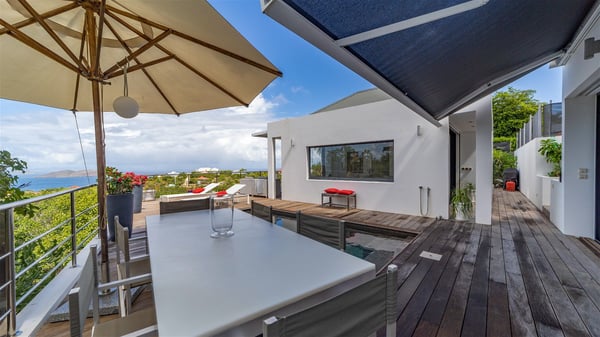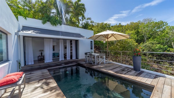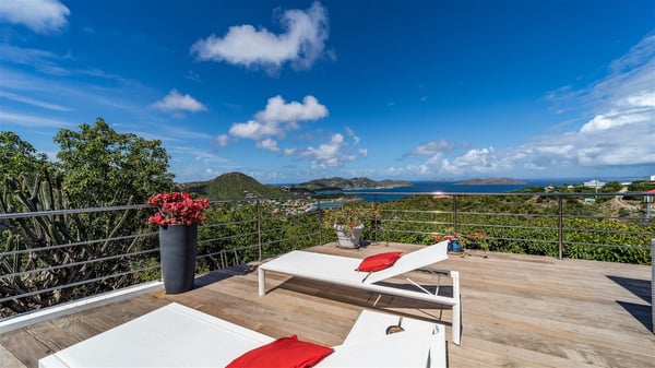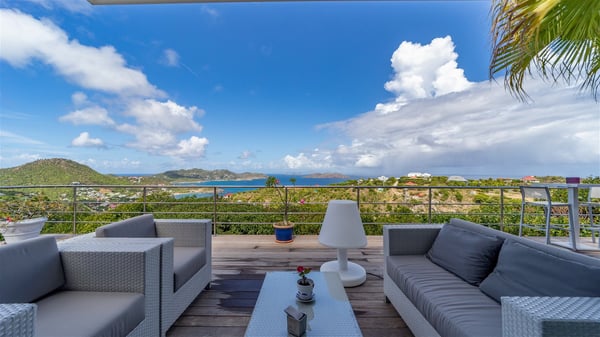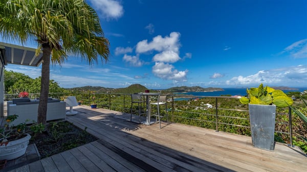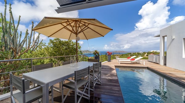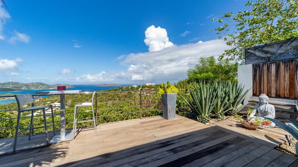 The holiday rental villa Ti Agave is a charming property nestled on the heights of Camaruche in Vitet. Ideal for a couple on a romantic getaway in St. Barths, it offers a spectacular ocean view and upscale services. Luxurious and most comfortable, villa Ti Agave is the perfect haven of peace for a stay for two in the Caribbean. Built over two buildings, after a few stairs, villa Ti Agave welcomes guests in its air-conditioned lounge widely open onto the terrace with a swimming pool. From there, the view over the ocean and the islands of St. Martin, Fourchue, Bonhomme and Fregate is breathtakingly beautiful. Close to the sofa, the atmosphere is soothing and warm as the trade winds gently blow. In the second bungalow, the indoor dining room can accommodate up to six guests near the well-equipped kitchen. In the heart of the rolling hills, the paradisiacal environment is truly relaxing as the sparkling waters of St. Barths shine bright. At the front of villa Ti Agave, the large sunny terrace with a parquet floor features a lovely swimming pool. There are comfortable loungers sheltered by umbrellas around the pool, the perfect place to relax in an idyllic scenery, as well as a dining room for six guests in front of the view for pleasant al fresco dining in the mild Caribbean air. Near the palm trees with chiselled foliage, a pleasant outdoor lounge with a sofa and comfy armchairs is set up in the shade, the perfect place to sip a cocktail or read in a peaceful and quiet ambience. And in the evening, the glowing sunsets create an even stunnier view with their bright reflections in the golden sky. Villa Ti Agave consists of one beautiful air-conditioned bedroom with en suite bathroom. It is located close to the living room in the separate bungalow and opens onto the terrace with a breathtaking ocean view. Furnished with soft cushions and fine fabrics, this bedroom is calm and quiet, the right place to rest after beautiful days exploring the island, or sunbathing by the pool in a very private atmosphere. The bedroom opens directly onto the terrace swept by the Caribbean softness. Comfortable and spacious, villa Ti Agave is the perfect place for a stay for two in St-Barths in front of an amazing panorama.