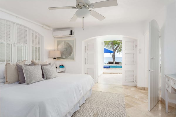 Eden on the Sea is a part of the sought-after Merlin Bay estate within the private, serene and secure Merlin Bay community, located within the exclusive area of The Garden, St. James. A gorgeous three-bedroom semi-detached townhouse, set on three levels with unobstructed, magnificent and breathtaking ocean views. Guests have direct access to the beach via steps leading from the villas’ private sun terrace, complimented by a large communal lagoon-style swimming pool and barbecue, a private plunge pool, ocean-side showers and gorgeous gardens and grounds. The living room, formal dining room and well-equipped kitchen which includes, (a fridge/freezer, toaster, coffee machine, mixer, blender, and electric kettle) are located on the first floor, opening onto the private rooftop terrace with great views out to sea. Guests can relax in the tastefully decorated sitting room and entertain in the formal dining area. There is also a second dining area on the terrace, with views across the central pool. One of the ensuite guest bedrooms is located on the ground floor, while the second ensuite guest bedroom and the ensuite master bedroom are located on the third floor. The primary suite benefits from a private balcony, with beautiful sea views. The amenities of the West Coast are within a few minutes' drive, including restaurants, shops and services.