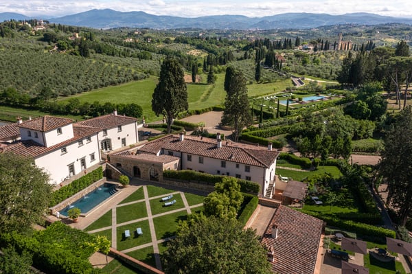 In ancient mythology, Feronia is an Italic goddess associated with wildlife, fertility, and abundance. Villa Feronia, a stunning luxury villa set majestically on the outskirts of Florence, fully embodies those associations thanks to its rich grounds that include a pond, oak and cypress trees, bountiful olive groves, generous vineyards, and endless breathtaking views of the Renaissance city and its magnificent cathedral, The Duomo. Villa Feronia, which dates back to 14th century and is known to have been the residence of one of the most renowned Renaissance painters, is composed of five buildings on the same estate. It can accommodate up to 37 guests, making it one of the largest villas to rent in Tuscany. There are many treasures to discover in the surrounding areas: the famous Chianti wine region is within easy reach; the art city of Florence with its rich history, architecture and cuisine is just a 15-minute drive away; and Lucca and Siena are each less than one hour away. Villa Feronia is the place where you can feel the energies of the past and the present come together, from where you can start your day exploring Tuscany's main attractions, and where you can relax during the evening over a great glass of wine and a scrumptious local meal. The only thing you will not like is having to leave this little slice of heaven.