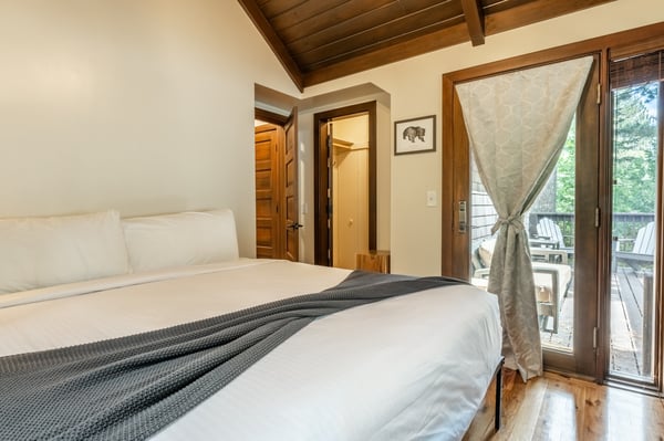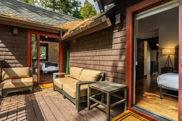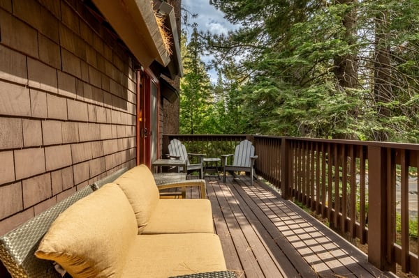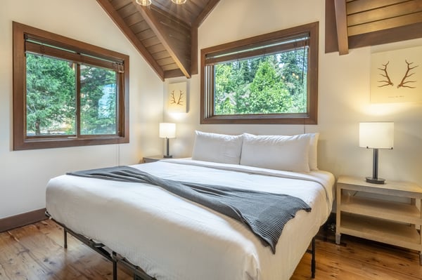Escape to Owl Cottage 9 for a mountain getaway on Lake Tahoe’s West Shore! Nestled among a forest of majestic cedar trees—and only a quick stroll from the beach—this 4-bedroom, 2.5-bathroom cottage sleeps 8 guests and is the perfect retreat for outdoor adventures. Part of the historic Cedar Crest Cottages, enjoy grilling on the community BBQ, sharing drinks around the firepit, or carving the slopes at nearby Homewood Mountain Resort and Palisades Tahoe. Guests will love starting each morning relaxing on the porches and ending the night by the flickering gas fireplace. A cozy foyer with stone floors and coat hooks welcomes guests upon arrival. Discard ski boots or beach gear before venturing into the spacious great room, where hardwood floors, beamed ceilings, and built-in wooden bookshelves create the feeling of a refined mountain lodge. The living space’s plush sofa, matching loveseat, and 2 leather armchairs—all set before an impressive stone fireplace—invite guests to settle in for a comfy night of conversation, board games, or reminiscing about the day’s adventures. A wall-mounted Smart TV offers entertainment options for unwinding. Crafting homemade meals is easy thanks to the fully equipped kitchen, boasting cutting-board countertops and high-end appliances. A dining table overlooking the woods offers seating for 6, with additional space for 2 at the breakfast bar. Guests mixing work and play can take advantage of the office’s 2 desks, 3 chairs, and Mac monitor. Off the living space, a covered porch with a 4-seat dining table calls for alfresco meals—or curl up on the soft outdoor furniture for a nightcap in the relaxing atmosphere. All the home’s sleeping accommodations are on the upper level, starting with 2 guest bedrooms featuring king beds that can be turned into 2 twins—both of the bedrooms boast a Smart TV and 1 has access to the furnished upper-level deck. The third guest bedroom features an inviting king bed and deck access, while a light-filled guest bedroom with a full bed completes the floor. Owl Cottage 9 has everything guests need for a charmed Lake Tahoe vacation. Easily explore the area with on-site parking for 1 vehicle. For the nearest public beach access, turn left out of the driveway, walk to Fern Street, cross the street, and follow the braided cement path to the beach. Book today! Please be advised that the fire pit is seasonal and is not operational during the winter months due to the heavy snowfall. Placer County STVR Compliance Requirements. Daytime Occupancy: 12 Nighttime Occupancy (begins at 9pm): 8 Parking: 1 assigned parking spot TOT # 84629