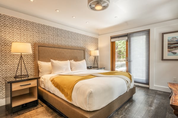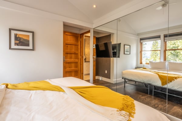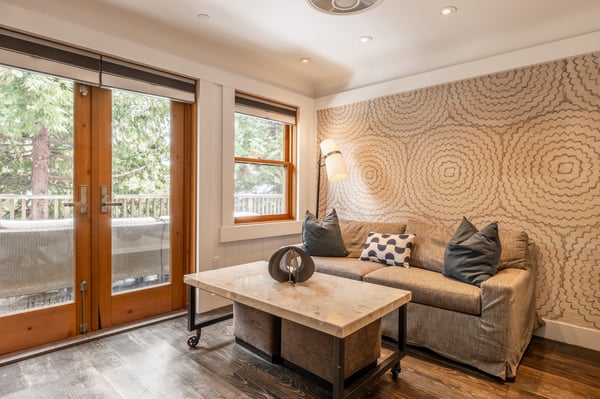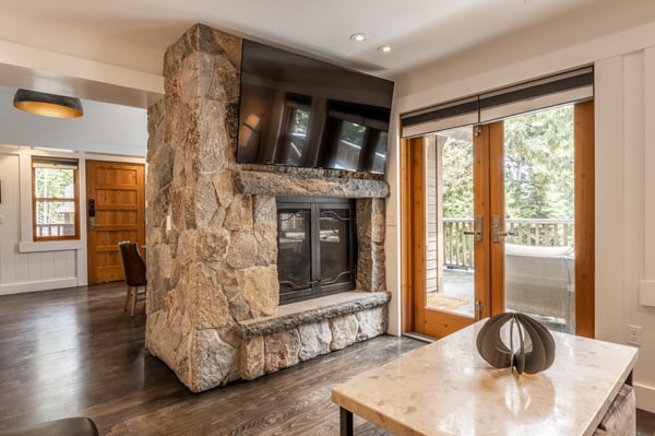 Designed for privacy with space to entertain, Eagle Cottage is an ideal retreat for a family or group of friends. The 3-bedroom home is part of Cedar Crest Cottages, a historic vacation retreat nestled on forested grounds with filtered lake and mountain views. Tastefully designed with hardwood floors and ambient light, the two-level home easily accommodates up to 6 guests with a spacious master suite on the main level and two bedrooms upstairs. Combined with neighboring Cedar Crest Cottages, this spacious home is also an ideal “home base” for groups. The living area, located on the main level, centers around a two-way fireplace with an impressive floor-to-ceiling stone mantel. On one side, a comfy leather sofa faces a large-screen TV; on the other, a 10-seat dining table allows for large family dinners. Three stools at the breakfast bar add a “kids’ table.” Outside, a sweeping private deck with stone flooring provides an option to dine al fresco with an 8-seat dining table overlooking the surrounding forest. The galley kitchen is fully equipped to serve groups, complete with stainless steel appliances and ample counter space. Each bedroom in Eagle Cottage offers a king-sized bed that can be converted to two extra-long twins upon request. Each bedroom is uniquely styled with mountain modern decor. Upstairs guests share a luxurious full bath with a deep tub shower. A separate powder room on the main level adds convenience. Eagle Cottage also has a private washer and dryer to keep ski clothes toasty and bathing suits dry for each new day of adventure. Please be advised that this home does not have air conditioning. As a guest of Cedar Crest Cottages, you’ll enjoy access to the community BBQ grill and oversized fire pit with filtered lake and mountain views. In the summer, stroll to the beach across the street for swimming, sailing and boating on the lake, or hike through the surrounding mountains. In the winter, drive less than two minutes to the family-friendly Homestead Mountain Resort, or just 25 minutes to the varied terrain of Squaw Valley. The restaurants, shops and entertainment of Tahoe City are just 10 minutes away. With flexible accommodations, space to entertain, and a convenient location in the heart of Tahoe’s year-round recreation, Eagle Cottage is an ideal place to host family gatherings or small reunions of friends. Placer County STVR Compliance Requirements. Daytime Occupancy: 9 Nighttime Occupancy (begins at 9pm): 5 Parking: 1 assigned parking spot and 1 car in garage TOT # 84629 Please note: • The garage is not accessible during winter months. • Please be advised that the firepit is seasonal and is not operational during the winter months due to the heavy snowfall. • This home does not have air conditioning.