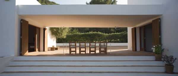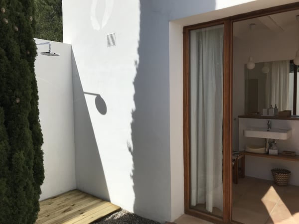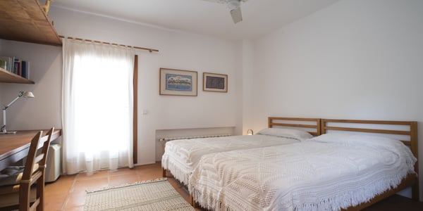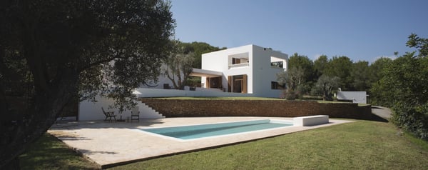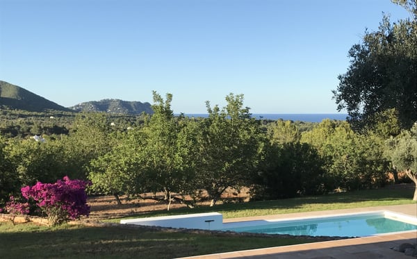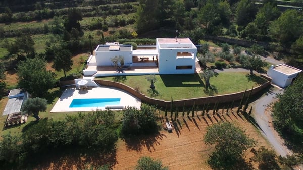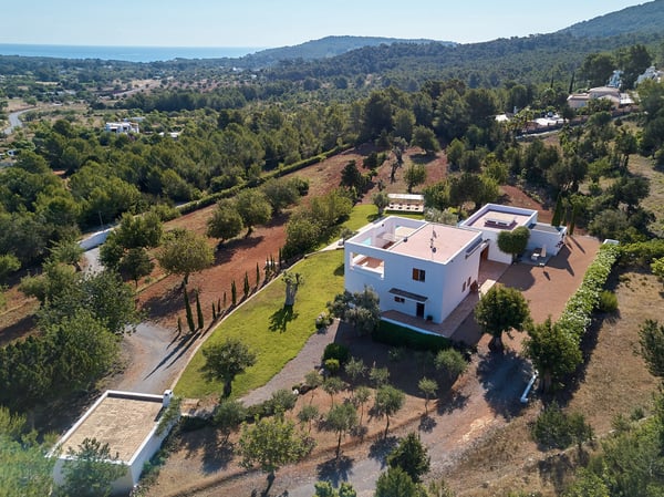 Located just 1km away from San Carlos by the road of Es Figueral, Can Perez nestles amongst ancient olive trees, consisting of 2 sections joined by a large covered porch with beautiful sea views. There are numerous beaches nearby, including Es Figueral, Aguas Blancas, Cala Nova, and Cala Leña. The orientation of the property is excellent as you can enjoy the sun all day, either relaxing by the pool or spending time in the vast outdoor areas where you will find perfectly manicured lawns, an array of chill-out areas, gardens, etc. In the evenings, enjoy a cocktail or Al Fresco dining under the large covered porch area. The house has been furnished to a very high standard and mixes the traditional style with all modern comforts and finishes, including, air conditioning, central heating, and WiFi. Surrounding the house, you will find spacious terraces and when illuminated, they are a delight to enjoy on summer's nights. Children will have a great time at Can Perez, with numerous activities outside in the gardens, swimming pool, ping pong, and ball games. On the ground floor of the main building, you will find the large living room with fireplace, kitchen, laundry, guest w/c, and dining room. The first floor hosts the primary bedroom and a further double bedroom, each with its own bathroom and terrace with sea views. The adjacent building hosts a further 2 double rooms each with its own bathroom and terrace, and a study. License Number: ET-0502-E