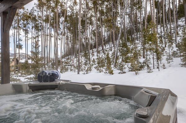 Mountain chalet with hot tub and deck nestled in snow-covered alpine setting with ski slopes nearby.Mountain chalet with hot tub and deck nestled in snow-covered alpine setting with ski slopes nearby.