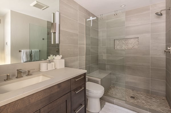 Step into your spa-like bathroom retreat with sleek gray tiles, spacious walk-in shower, and modern Step into your spa-like bathroom retreat with sleek gray tiles, spacious walk-in shower, and modern