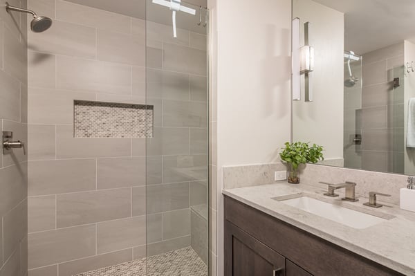 Your modern bathroom's sleek bronze fixtures and elegant stone tiles create a spa-like retreat whereYour modern bathroom's sleek bronze fixtures and elegant stone tiles create a spa-like retreat where