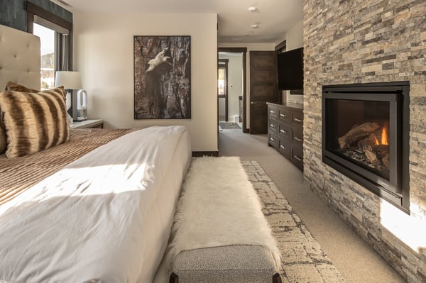 Unwind in your cozy bedroom sanctuary with a crackling fireplace and peaceful forest views from yourUnwind in your cozy bedroom sanctuary with a crackling fireplace and peaceful forest views from your