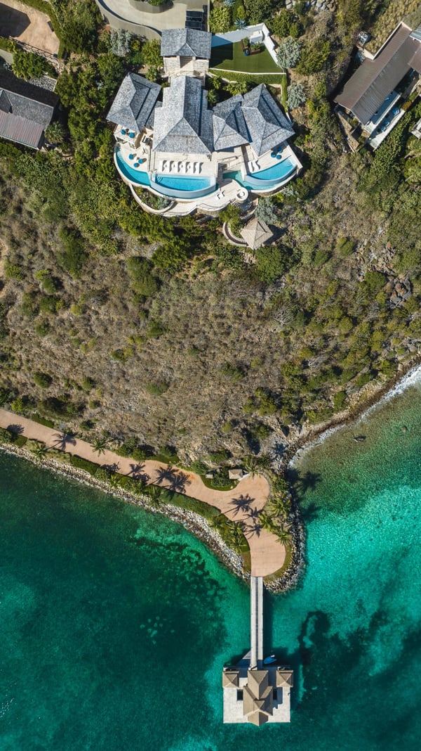 Nestled on a promontory on the northern rim of Virgin Gorda, the Edge of Paradise truly lives up to its name. Ideally situated to maximize the island’s sweeping sunrise views, and with both Anguilla and Sir Richard Branson’s private Necker Island visible in the distance, this dramatic four-bedroom villa is perfect for early risers who want to soak up every minute of their BVI escape. Boasting four distinct pools and expansive outdoor entertainment space, the villa provides an unmatched vantage point for gazing upon the waters of the Atlantic Ocean, the Caribbean Sea, and the stunning Eustatia Sound. Perched in the quiet hills of the Ridge neighborhood, the Edge of Paradise affords sweeping North- and East-facing views of the Bay and surrounding islands, with an open-plan living space that makes the most of the island’s cooling Easterly trade winds. The House was designed by Joseph Mosely Architects of Michigan, and was specifically designed for the topography and geometry of the lot. As a result, it offers the utmost privacy and is not visible from the road. Two master suites occupy the villa’s second floor, while two additional bedrooms round out the lower level, offering maximum privacy. Prepare meals in the elegant gourmet kitchen, relax in the private movie theater, or spend your days relaxing in the outdoor entertainment space, along with four separate pools and terraces. Interior design concepts and appointments were provided by Persia Designs of New York and Toronto, with fine features and finishings including travertine floors and decking from Nicaragua and Peru, antique French doors, custom Andiroba cabinetry with hardware supplied by Classic Brass Inc., and Wallaba hardwood roof. While the villa enjoys proximity to the beach club, it also comes with two golf carts to provide easy access to the marina, white-sand beaches, and the many other spoils of the property.