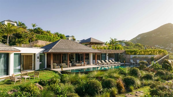Lazuli is a luxurious four-bedroom vacation rental with a heated swimming pool, ideally located facing the Grand-Cul-de-Sac lagoon. Boasting an exceptional location, this spacious and bright holiday rental welcomes up to eight guests in a stunning setting for a unique stay in St-Barths. Built over several levels, Villa Lazuli offers a majestic view of the crystal-clear waters of the lagoon and the infinite ocean. The large, air-conditioned living room lets the delightful light come in, creating a cozy indoor space perfect for relaxation sessions. There are sofas, armchairs, and coffee tables in the comfortable lounge, from which you can admire the view through the bay window. Close to it, you’ll find the fully-equipped kitchen with a dining area for eight, adjacent to the wine cellar. The dining room welcomes guests into a long space open at the front onto a second lounge with greige hints and raw wood under a perfectly designed framework, and at the back onto a lovely patio with charming vegetation and a barbecue. The pure, elegant, and soothing atmosphere provides a delightful feeling of calm and luxury for a highly privileged stay in St-Barths. At the front, the terrace of Villa Lazuli opens onto the crystal-clear lagoon of Grand-Cul-de-Sac and the property's lush vegetation. On the wooden deck, the long, 16-meter-long heated swimming pool with steps glistens under the Caribbean sun, the best place to enjoy delightful moments of relaxation, admiring the stunning view. There are sun loungers near the pool, along with a few driftwood tables, making it the perfect place to sip a cocktail in a very private atmosphere. On the side of the pool, a few stones set in the grass lead to a charming area furnished with a coffee table and four armchairs for private conversations in a paradisiacal setting. The vacation rental villa Lazuli consists of four air-conditioned bedrooms with en-suite bathrooms and dream lagoon views. Two of them are on one side of the lounge, the third is on the other side, and the fourth one is on a lower level accessible via a staircase, with a private terrace furnished with sun loungers. The decor is elegant, with wicker and fine pictures of colourful birds amidst the vegetation. Facing a breathtakingly beautiful view, villa Lazuli is a fantastic 8-person vacation rental with upscale amenities in utmost calm and luxury for an unforgettable stay in St-Barths.