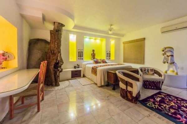 Welcome to the most exquisite and talked about luxury villa on Puerto Vallarta's exclusive south shore. This spectacular, new 8,000 square foot four master bedroom, five and a half bath Puerto Vallarta villa was designed for pure pleasure and comfort. The villa comes with a Chef, houseman, housekeeper and caretaker who will always greet you with smiles as warm as the Mexican sunshine. The staff is managed by Angela Sanchez, who will greet you upon your arrival and make your stay as comfortable and enjoyable as possible. Magnificent framed ocean views from every room and terrace. Sleeping capacity 12 guests, four bedroom suites a private studio for fifth bedroom and a sixth bedroom option. Three lavish master suites with king size beds and private terraces. Each suite has an oversize marble bathroom with raised Jacuzzi. Even the stone and marble showers have impressive views. Fourth lavish master suite offers king bed, oversize rock shower with sky light above. Private studio offers a queen bedroom, bathroom and a large sitting area with a TV. Fifth bedroom option is in our media room has queen bed and offers it's own private bathroom. Amazing views from your private gym. Spacious glassed-in living and dinning area under a soaring thatched palm roof.