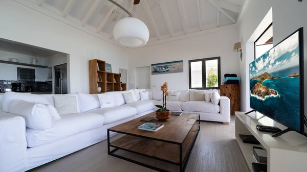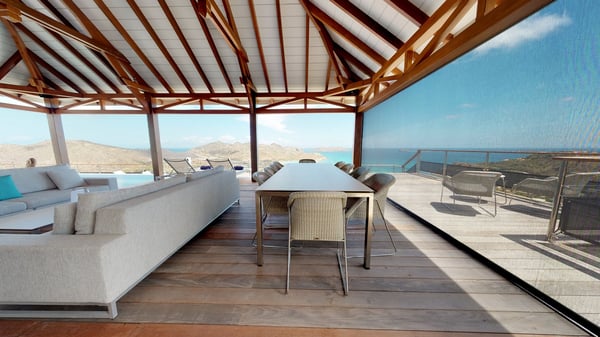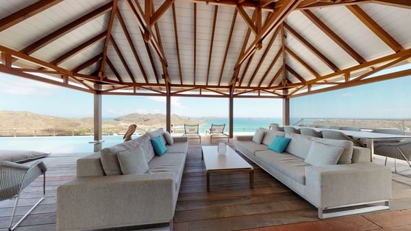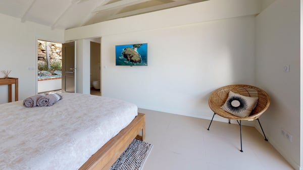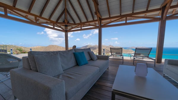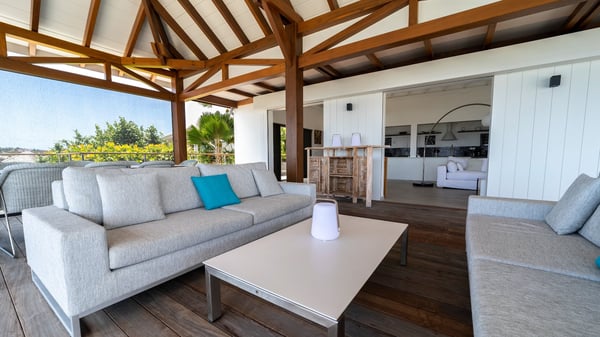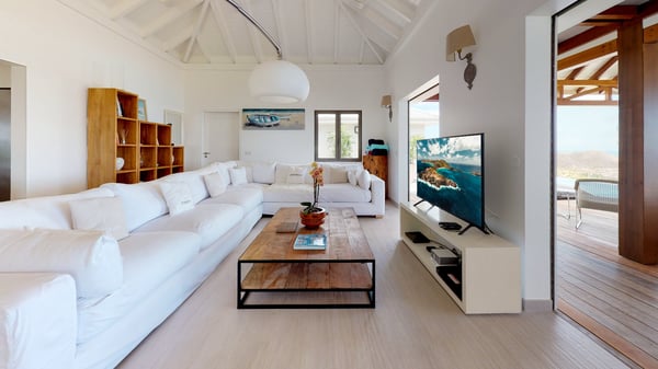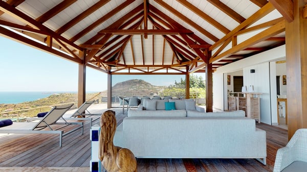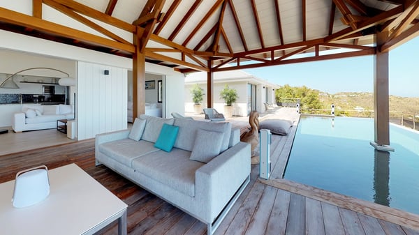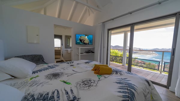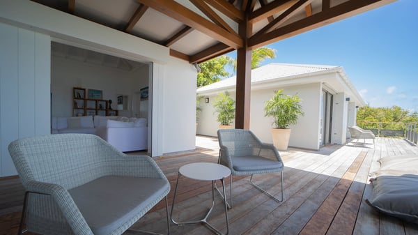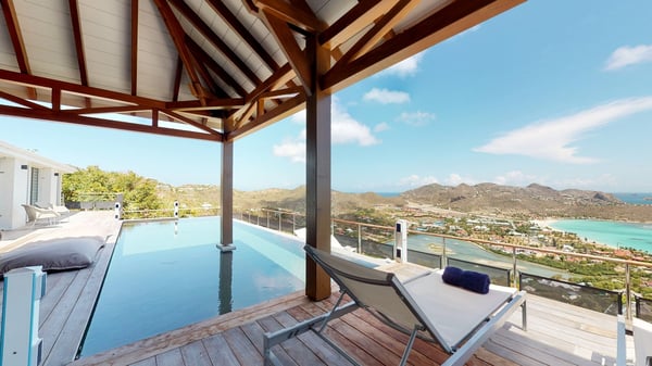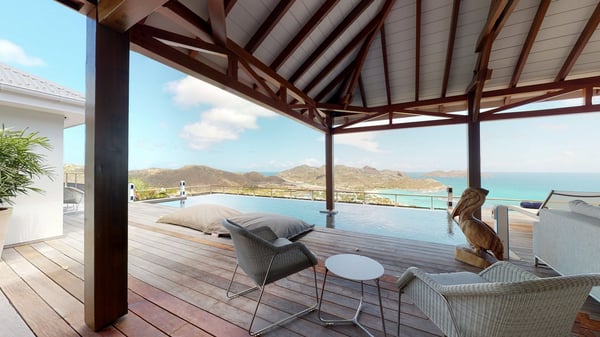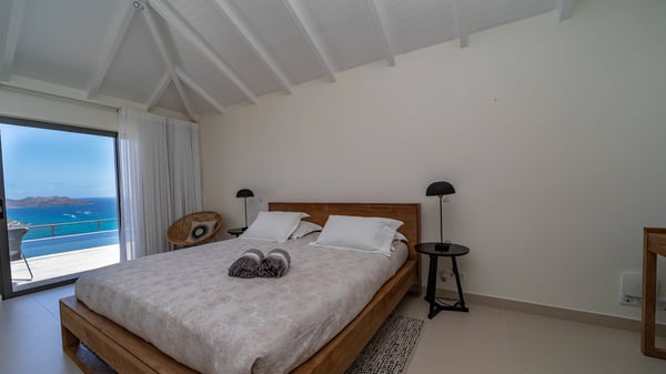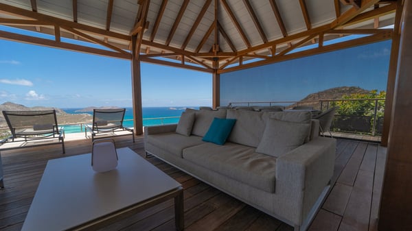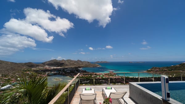 Nestled at the top of St. Jean’s hill, the vacation rental villa W View is a sumptuous four-bedroom property with spectacular views over the ocean, the rolling hills and the neighbouring islets. Perfect for a family or several couples travelling together, it is the perfect place for an unforgettable stay in St-Barths. Spacious and bright, the vacation villa W View is a true haven of peace and beauty. This very sunny vacation home is built on two levels spread over several bungalows, in the mild breeze of the trade winds that blow gently over St. Barths. Recently renovated, W View is designed with traditional weathered wooden floors, white walls and vaulted ceilings. The living space consists of an indoor dining room that can accommodate up to eight guests, as well as a fully-equipped kitchen opening onto the terrace. The warm and cozy living room is furnished with a beautiful white sofa and a coffee table. Large windows open onto the panoramic view over the ocean and St. Jean’s Bay, providing a pleasant sense of volume and space. At the front, the luxurious terrace welcomes you around comfortable outdoor furniture on a wooden deck. There is a second dining room ideal for alfresco dining under the covered area, as well as a spacious outdoor living room and a summer kitchen. The heated infinity swimming pool welcomes you for delightful moments of relaxing in front of the breathtakingly beautiful panorama. Deckchairs, daybeds and rattan armchairs are set up along the terrace, in the shade or under the sun as you wish. All around the house, the lush tropical garden provides an exotic touch of freshness for moments out of time. The vacation home in St. Barths W View has four beautiful air-conditioned bedrooms with private bathrooms. All are furnished with king-size beds or twin beds that can be converted into king-size, as well as spacious closets and dressing rooms. The master bedroom is in a separate pavilion, while two other bedrooms are in another separate bungalow. The fourth bedroom is located on the lower level. This is a perfect setup for a very private stay in Saint-Barth. A living room with a home cinema system as well as an equipped fitness room are also at your disposal.