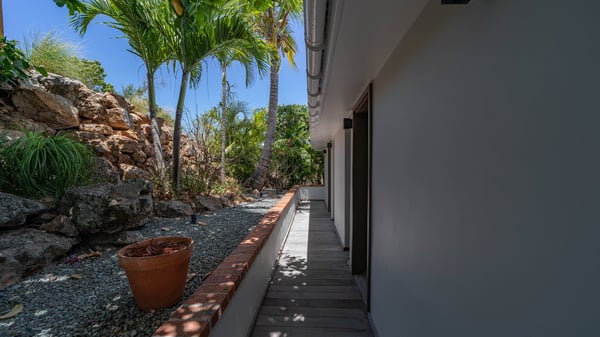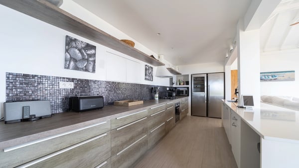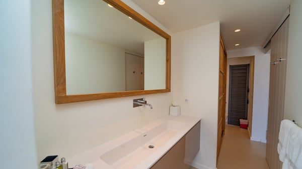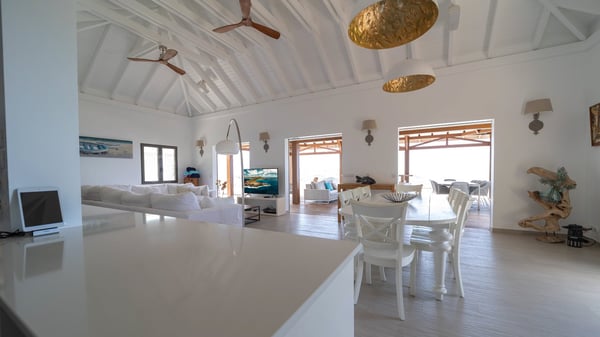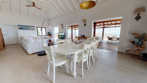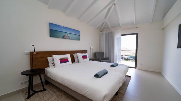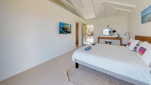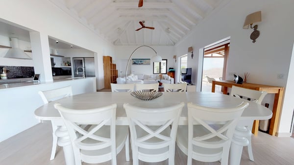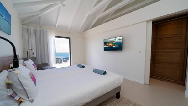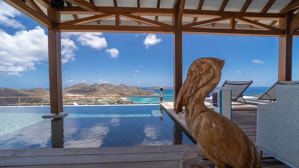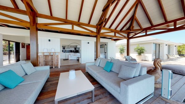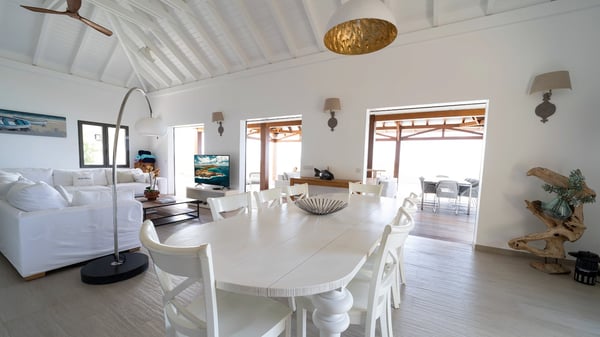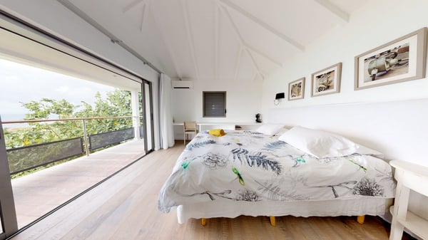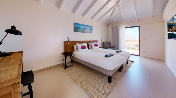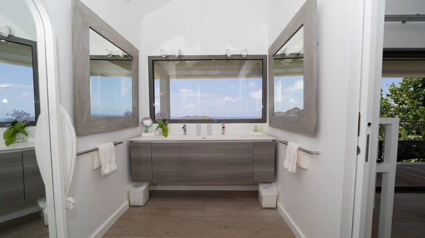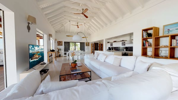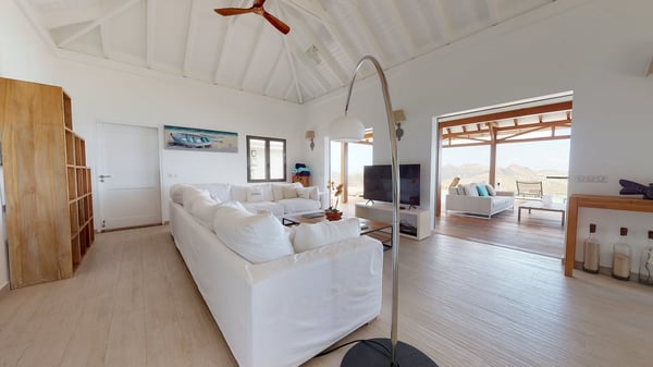 Nestled at the top of St. Jean’s hill, the vacation rental villa W View is a sumptuous four-bedroom property with spectacular views over the ocean, the rolling hills and the neighbouring islets. Perfect for a family or several couples travelling together, it is the perfect place for an unforgettable stay in St-Barths. Spacious and bright, the vacation villa W View is a true haven of peace and beauty. This very sunny vacation home is built on two levels spread over several bungalows, in the mild breeze of the trade winds that blow gently over St. Barths. Recently renovated, W View is designed with traditional weathered wooden floors, white walls and vaulted ceilings. The living space consists of an indoor dining room that can accommodate up to eight guests, as well as a fully-equipped kitchen opening onto the terrace. The warm and cozy living room is furnished with a beautiful white sofa and a coffee table. Large windows open onto the panoramic view over the ocean and St. Jean’s Bay, providing a pleasant sense of volume and space. At the front, the luxurious terrace welcomes you around comfortable outdoor furniture on a wooden deck. There is a second dining room ideal for alfresco dining under the covered area, as well as a spacious outdoor living room and a summer kitchen. The heated infinity swimming pool welcomes you for delightful moments of relaxing in front of the breathtakingly beautiful panorama. Deckchairs, daybeds and rattan armchairs are set up along the terrace, in the shade or under the sun as you wish. All around the house, the lush tropical garden provides an exotic touch of freshness for moments out of time. The vacation home in St. Barths W View has four beautiful air-conditioned bedrooms with private bathrooms. All are furnished with king-size beds or twin beds that can be converted into king-size, as well as spacious closets and dressing rooms. The master bedroom is in a separate pavilion, while two other bedrooms are in another separate bungalow. The fourth bedroom is located on the lower level. This is a perfect setup for a very private stay in Saint-Barth. A living room with a home cinema system as well as an equipped fitness room are also at your disposal.