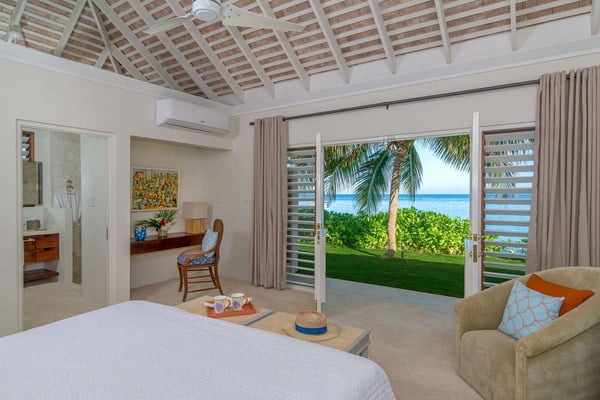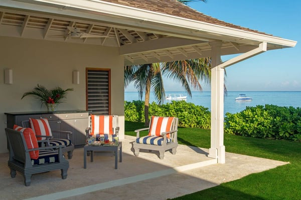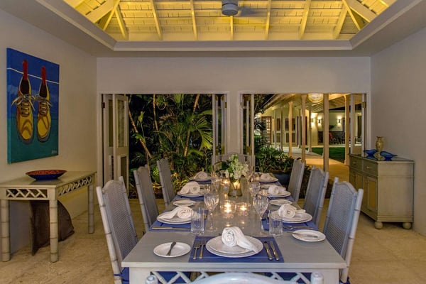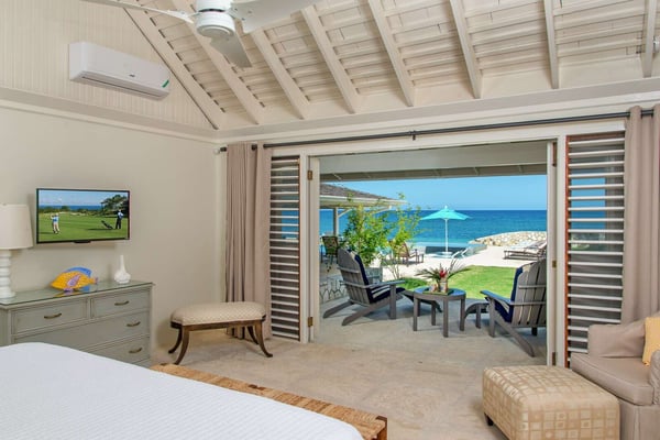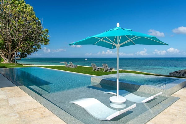 The Tryall Club requires all villa and condo guests to become members during their stay via a Temporary Membership Fee ($) (plus a 15% service charge). Children between the ages of 13 and 15 pay at a discounted rate (plus a 15% service charge). Guests can also pay per day, for guests ages 16 and older, who stay for one to four days. This can be either prepaid or upon arrival at the Club. For children 12 years of age and younger, our Temporary Memberships are complimentary. Please contact a Villa Specialist for exact pricing! Sunset is a stunning, contemporary-style five-bedroom villa on the edge of the Caribbean Sea. It offers a private beach and is the perfect escape for those who love luxurious, waterside living. Guests are treated to breathtaking views of Montego Bay and Jamaica’s stunning coastline from nearly every room. With a private beach, waterfront fire pit, and proximity to the championship golf course, Sunset boasts one of the best locations on the island. Completely remodeled, Sunset showcases modern Caribbean architecture with a spacious, open floor plan and a sophisticated beach house vibe. The villa’s airy design lets you fully embrace the island’s beauty and tranquility. Each of the five bedrooms is air-conditioned with its own en-suite bathroom. Four of the bathrooms feature private outdoor showers. The primary suite, which faces the sea and pool, has a king-sized bed. The remaining bedrooms offer twin beds that can be converted into kings, and two additional bedrooms are located in an ocean-facing cottage with views of Montego Bay. The spacious, brightly decorated living room opens to the veranda and offers stunning sea views. It includes a wet bar and cable TV. The large perimeter overflow pool features a lap lane, a baja ledge, and a hot tub. Dining can be enjoyed indoors or outside, by the ocean or on the covered veranda.