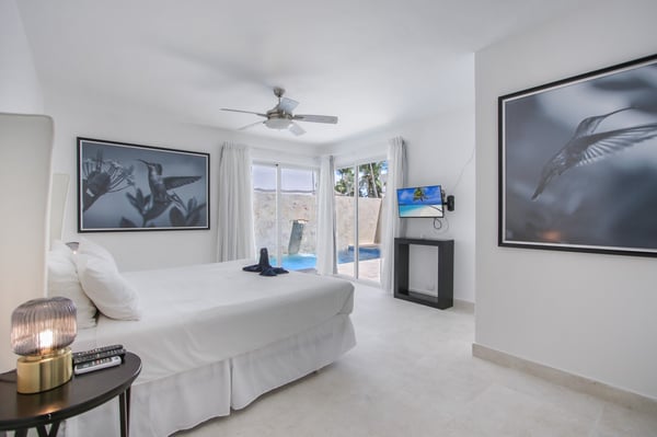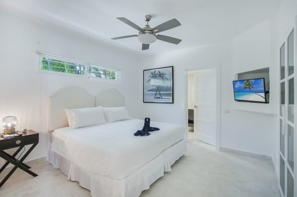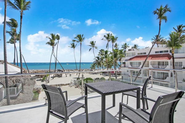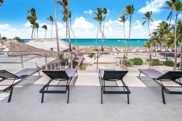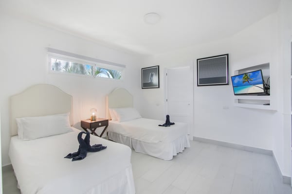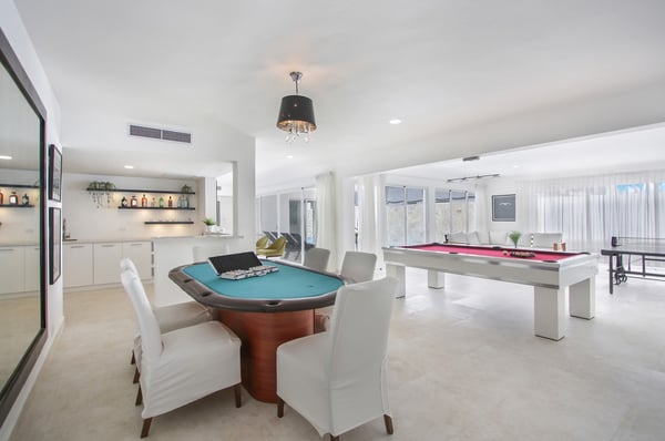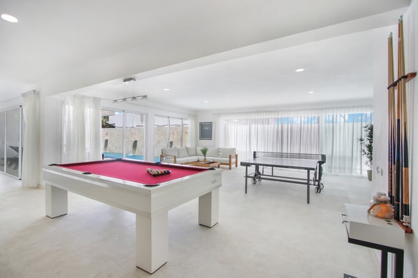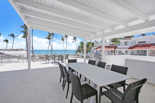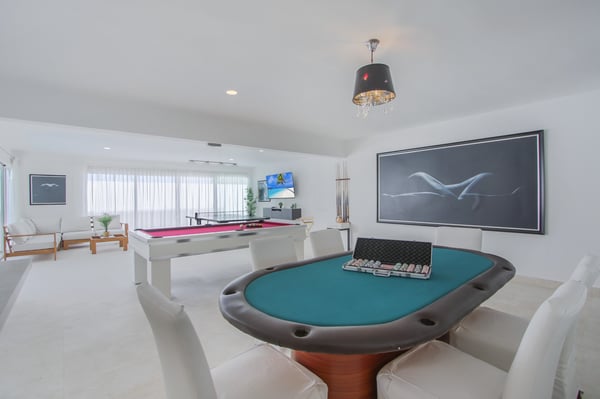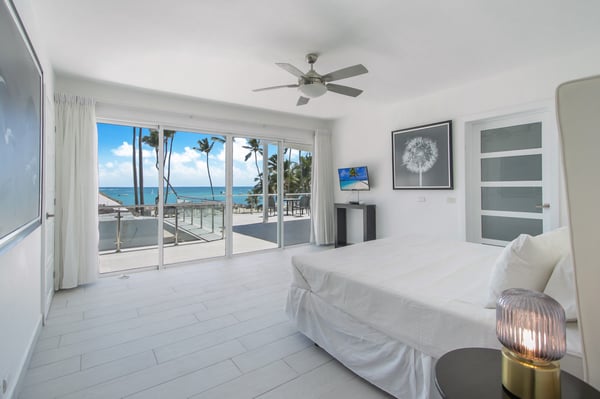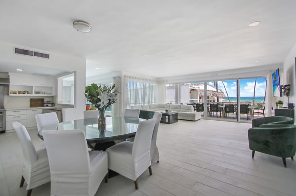 Modern Oasis is an 8-bedroom, 8 1/2 bath, 3-story, beachfront villa reminiscent of a Miami-style luxury mansion. This villa is the essence of modern minimalism paired with the most gorgeous ocean view! NOTE: Access to the 2nd and 3rd floors of the villa, requires climbing several flights of stairs, as there is no elevator available. The villa was fully renovated in the fall of 2023 – new bathrooms, bar, kitchen, furniture and covered rooftop terrace. Step into luxury as Modern Oasis beckons you with its grand black double front doors. The 1st floor (UK: ground floor) features a game room, bar, and a private pool, creating the ultimate entertainment zone. Challenge your friends to a game of poker, show off your skills at the pool table, or enjoy a lively round of ping-pong. Relax in the bar area (drinks are not included), sink into the sofa, and catch a game on TV. Step outside to your private courtyard-style swimming pool, complete with a cascading waterfall, pool deck, and lounge chairs. Ascend to the 2nd floor (UK: 1st floor) to discover the main living and dining area, designed with an open floor plan that seamlessly blends indoor and outdoor living. The open kitchen is fully equipped for cooking delicious meals, and for an extra touch of luxury, a private chef is included (food and beverages are not included). Dine al fresco on the large balcony overlooking the beach and ocean, or head up to the 3rd floor (UK: 2nd floor) for another outdoor dining area and kitchen/BBQ, offering even more breathtaking views. Modern Oasis is a sanctuary of luxury and relaxation, promising an unforgettable stay in paradise.
