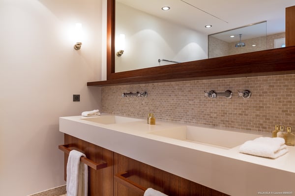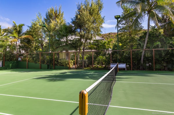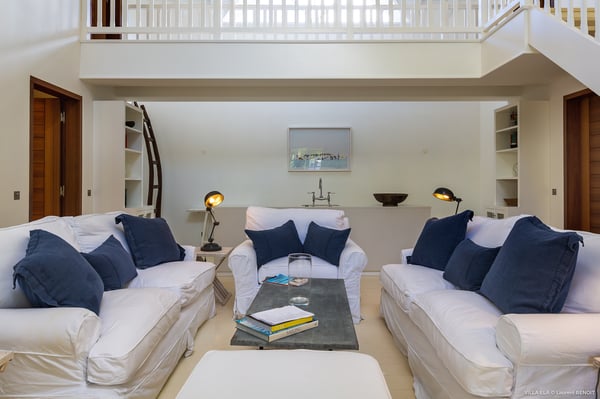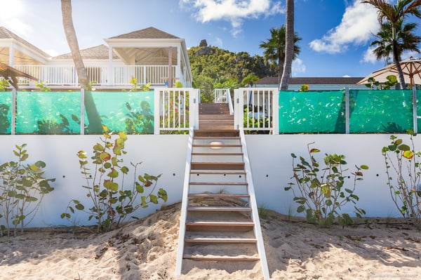 The magnificent vacation rental villa Ela is a luxury property located on the famous Flamands Beach in St-Barths. Coming with eight bedrooms and amazing ocean views, it is the perfect spot for a large family or group of friends wishing to share a beachfront villa in the Caribbean. Villa Ela was designed in a Caribbean style, blending the local architecture in multiple pavilions with a decor of white fabrics, dark and light wood floors and mahogany. This is one of the spacious beachfront properties in St-Barths that offer a subtle blend of modernity and authenticity, while always creating a peaceful and soothing atmosphere in every part of the house. In the main central building, the large air-conditioned living room is a pure delight, with white parquet floors, a white sofa and armchairs, under a superb high whitewashed vaulted ceiling. In the elegant and beguiling great room, time seems to pass more slowly. In the back, the modern kitchen is well-equipped for self-catering or private chef services. Open on three sides to the ocean breezes, this refined living room has an amazing view over the ocean and the magnetic Flamands beach. At the front, a beautiful two-level terrace faces the breathtaking view. There are large teak sofas, outdoor dining and a beautiful and azure-coloured heated pool for delightful outdoor moments. A covered swing and deck chairs are shaded by generous umbrellas. On the lower level, remote-controlled awnings provide additional shade. You can go to the beach a few steps from the terrace. Utmost luxury in St-Barths, there is also a private tennis court near the villa's garden. The elegance of this luxurious holiday rental villa in Saint Barth Ela is also in the decor of its eight air-conditioned suites. Four bedrooms are located in a separate, two-floor building, across the terrace from the main pavilion. They all have large mahogany beds, except for one suite with twin beds, and each bedroom has a terrace, an en-suite bathroom and spectacular ocean views. The other four rooms are located in a two-story guest house with its own living and kitchen areas. They all have a black mahogany four-poster bed and en-suite bathrooms. On the beachfront, materials and colours create a beautiful harmony between the traditional and the modern ways, making this fantastic St-Barts holiday home a true island gem.