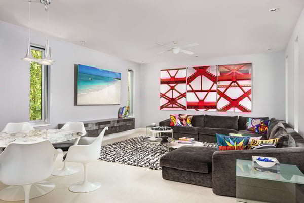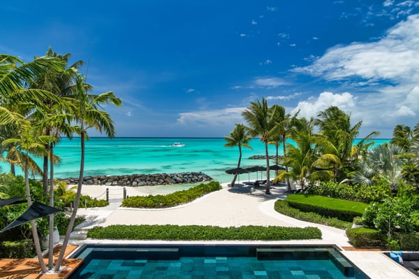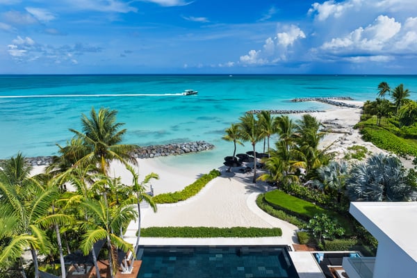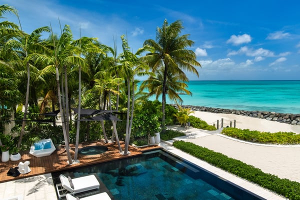 An irresistible fusion of sleek, contemporary architecture and enchanting outdoor spaces, designed to be savoured with friends and family. With fully pocketing glass doors that open the cool, white living space to the vivid views of Grace Bay beach, Villa Awa is a triumph of indoor-outdoor design. The lava stone-tiled negative edge pool, with loungers that appear to float on its inky surface, is the focal point of the exterior space. A cluster of armchairs and a hot tub shaded by coconut palms to one side invite daytime relaxation, and sunken fireside seating on the other is perfect for after-dinner drinks. Follow the winding flagstone path to discover a beach deck lined with sun beds and hammocks screened by swaying palms. Multiple shaded dining and lounging areas mean the majority of one’s time is likely to be spent revelling in the gentle breezes and warm sunshine. Clean lines and fresh tones dominate indoors, with natural stone, wood and metallic accents lending warmth and glamour to the shared spaces. An open-concept dining and living space frames exquisite views of sugar-white sand with an impossibly blue sea, and provides ample space to gather indoors. A playfully decorated media room gives younger guests an independent space, while for adults, a restful massage room awaits. Villa Awa features six bedrooms with ultra-modern ensuite bathrooms. The upper level features one principal suite with a king-size bed, outdoor shower and a private terrace plus three guest suites, each with two queen-size beds and sea-view balconies. A second principal suite and a further guest suite are situated on the lower level. With non-motorized water sports provided and a full staff, including a butler, chef and housekeeper, Villa Awa cannot fail to impress.