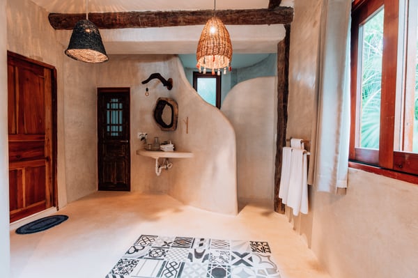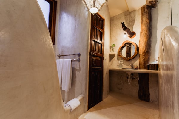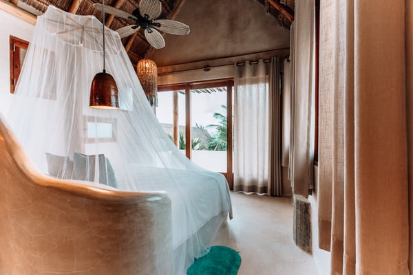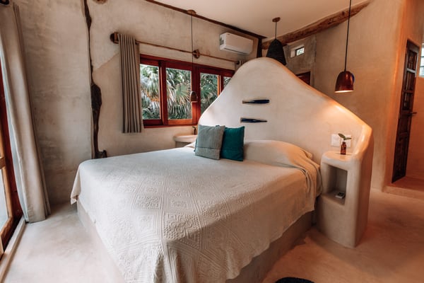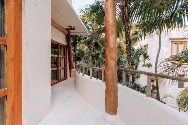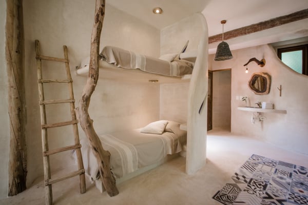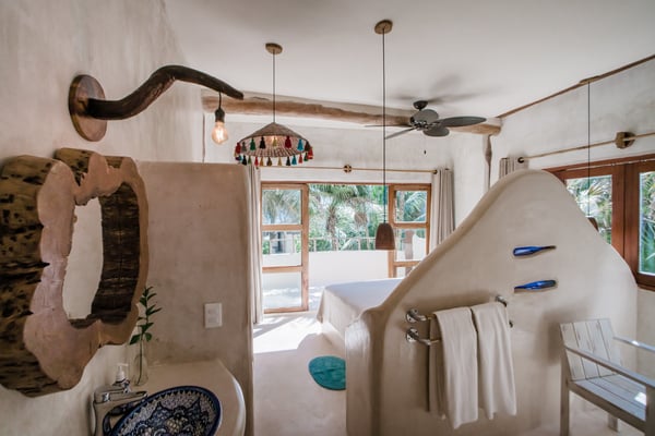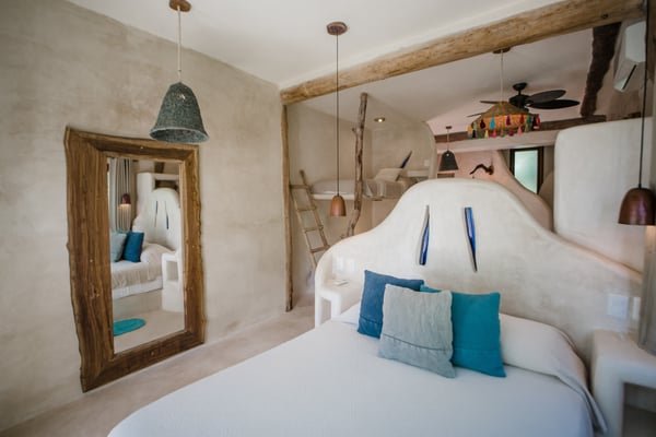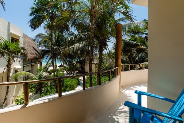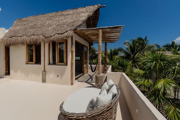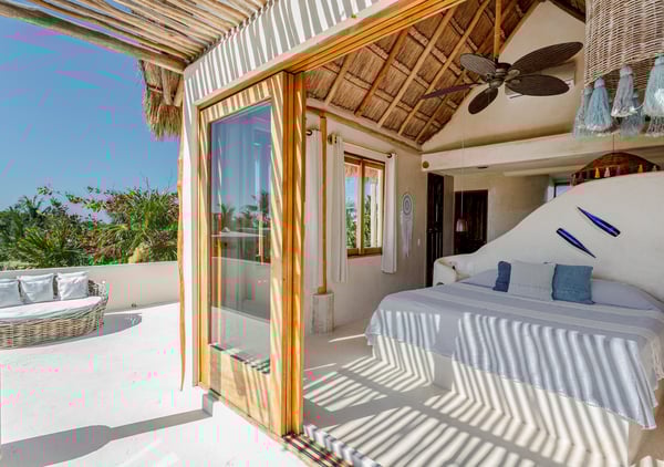 Casa de las Palmas is a stunning full-service vacation rental home on Tulum Beach. Enjoy a premium central location amidst the boutique hotels on a shared peaceful beachfront property. Casa de las Palmas is designed with natural elements and artistic touches that reflect the lovely laid back vibe and feel of Tulum. The main living area opens up to the soft white sand at your doorstep and a gorgeous pathway to your own spot of the beach with a shade palapas, day beds, and beach loungers. Boogie boards, SUP's and sea kayaks onsite for you to use as you wish. Guests also have access to the new seaside pool on the property. The primary bedroom is on the top story of the house immersed in the canopy of the palms with breathtaking views of the sea. It has a king size bed, en-suite bathroom, and private rooftop patio - the ultimate perch on the beach. Gather on the rooftop for stunning sunsets over the jungle, unparalleled views of the turquoise Caribbean Sea, or to gaze at the starry night time skies. The second floor has 2 bedrooms with sea views, breezes, a shared balcony and private en-suite bathrooms with showers. One bedroom has a king size bed and the second has a queen size bed and built in bunkbeds for the kids, or young at heart. The fourth bedroom is on the main floor and has a queen bed, en-suite bathroom and a juliette balcony to the garden area. A/C is available in the bedrooms and limited to night time use to promote energy conservation. We encourage opening windows and doors during the day to enjoy the tropical air. Families are more than welcome - the world's best sandbox is at your doorstep.