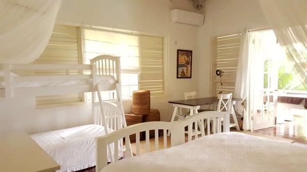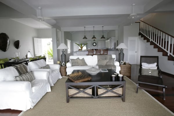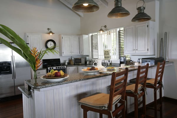 The two-storey, spacious Villa Kessi is located on South Hill, in Cap Estate high above the island’s only 18-hole golf course, with views of both the Caribbean Sea and the Atlantic Ocean. Its high location, open architectural design and unobstructed views capture the Atlantic breezes that sweep this part of the island. The house – designed and built by island-renowned architect Wayne Brown – incorporates traditional Caribbean style with wooden floors, a house-length veranda, jalousie shutters, wooden railings, and a wood-carving-detailed balcony while having a distinctly contemporary feel. French doors run the front length of the house and open onto the veranda and onto the spacious pool deck and infinity pool, creating an expansive indoor-outdoor common area. This space is designed with a purpose in mind with ample comfy outdoor seating, a billiards table & outdoor dining space perfect for enjoying the weather. The house is beautifully furnished and decorated in a Caribbean-colonial style, with four-poster beds, planter chairs, wicker chairs and tables, and sea turtle shells. The three large open bedrooms feature air-conditioning, ceiling fans, and traditional mosquito netting and all have en suite bathrooms. The main floor of the house is open and spacious with vaulted ceilings and has a combined dining room, living room and kitchen with a breakfast bar. Two bedrooms are on the ground floor and open out onto the veranda; the master bedroom encompasses the entire second floor. The master suite is beautifully furnished and features a four-poster super king-size bed and a balcony with a fantastic view of the Caribbean Sea and Atlantic Ocean and Martinique on a clear day.