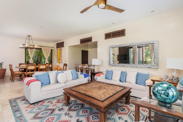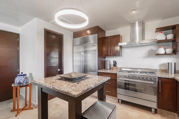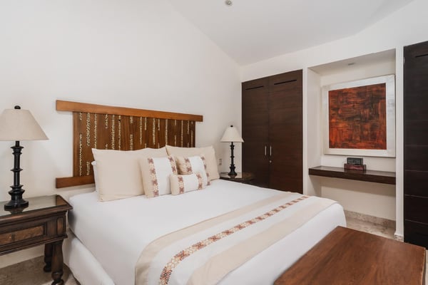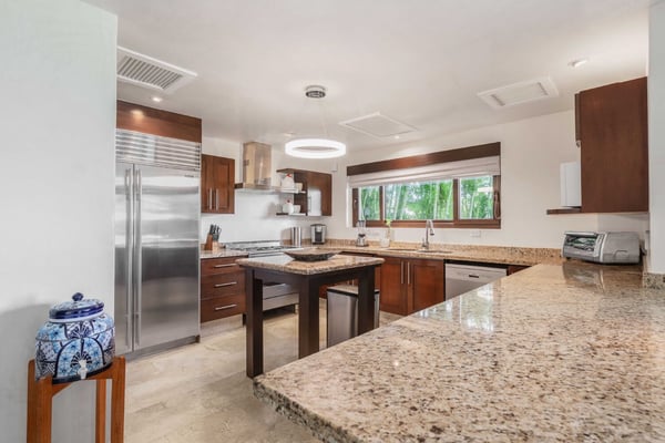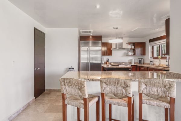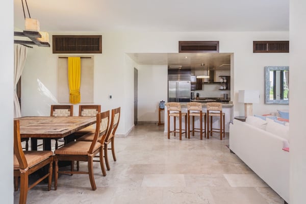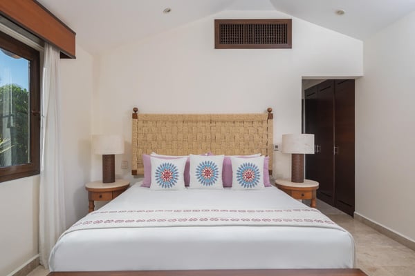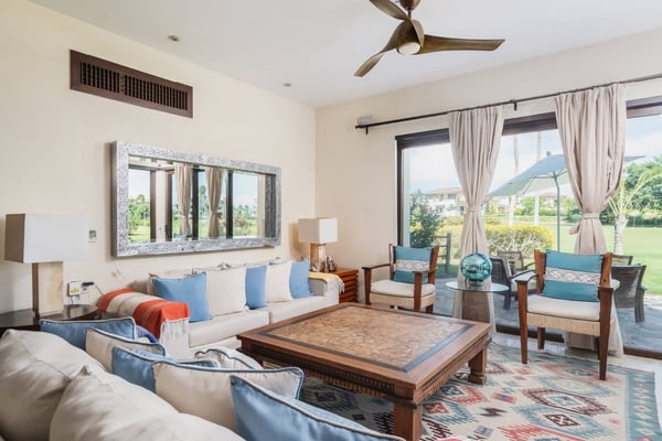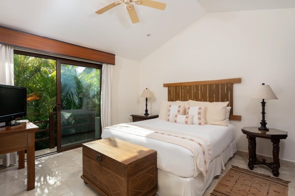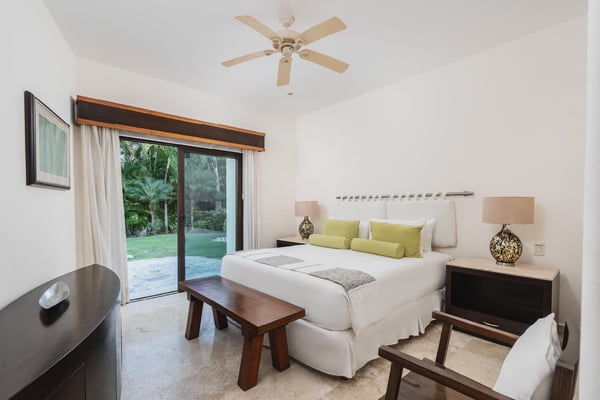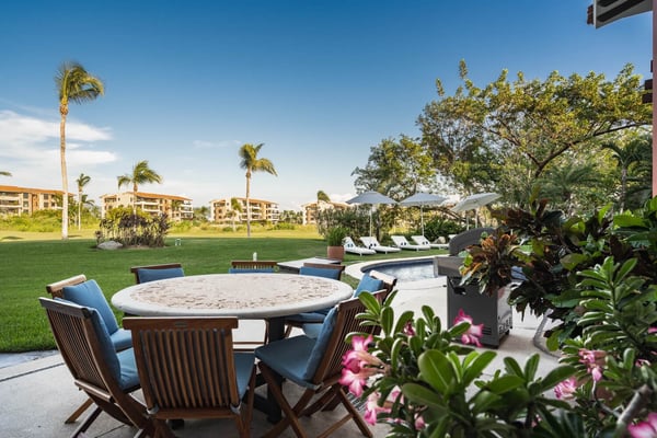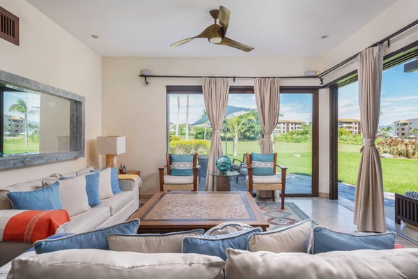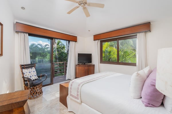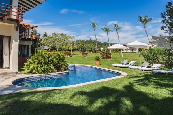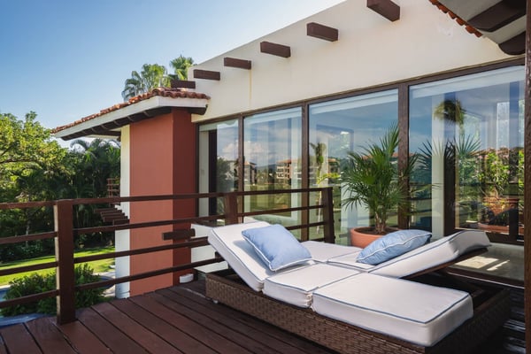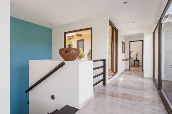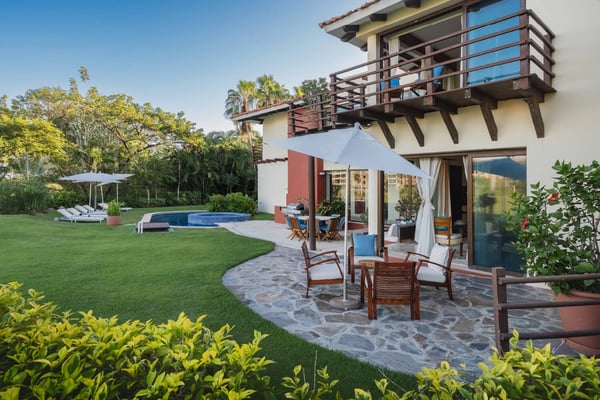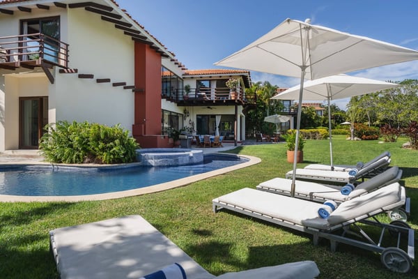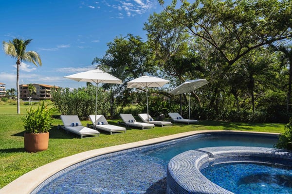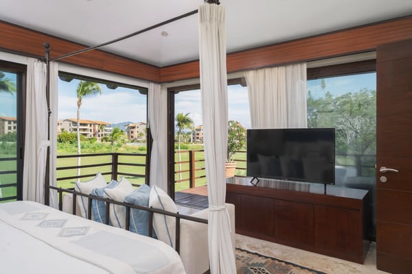 Guests of La Serenata will receive a complimentary Premier Golf Membership. Membership benefits include access to Pacifico Golf Course, Bahia Golf Course, the tennis center, the fitness centre, the Residents' Beach Club and Kupuri Beach Club. Located inside the world-class resort community of Punta Mita, our private villa is located on the 7th fairway of one of two Nicklaus signature golf courses. La Serenata features a private heated pool and hot tub, spacious yard with exceptional views, and premier membership to all of the resort amenities. Set into the hillside next to the golf course, the villa is centrally located for easy access to all activities, but feel free to use the six-person golf cart! The relaxed living and dining areas open to the beautiful pool deck and verdant yard. Relax in the outdoor lounge area that features a barbecue area for grilling the day's catch, an outdoor dining table that seats eight, a private heated pool, a spa and an outdoor covered bed. A completely furnished gourmet kitchen is ready for a professional chef or just your morning coffee. The main level king bedroom and three more king bedrooms on the upper level each have a private en-suite bathroom, cable television and wireless internet. An additional full bath and powder room are located on the main level. The primary suite offers lovely views from its private deck overlooking the Nicklaus golf course and enticing backyard.