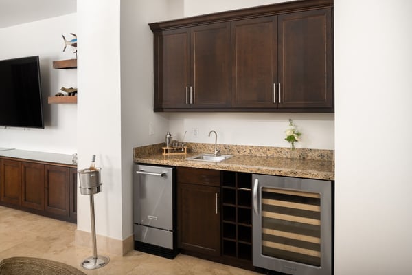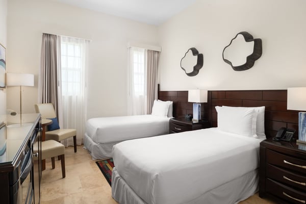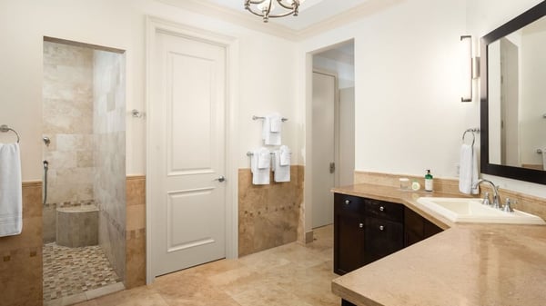 Luxurious living areas have pocketing glass doors that open on two sides to a spacious oceanfront patio with a circular staircase leading to a large roof terrace -- dramatically expanding the space and featuring a barbecue grill, outdoor kitchen, dining, lounge seating, and a six-person Jacuzzi. Unparalleled luxury and spacious accommodations for up to 10 guests make this four-bedroom penthouse suite a dream retreat. Guests enjoy spectacular water views from the main living area, the master bedroom and the rooftop terrace. Eleven-foot ceilings, Travertine marble floors, and an open design for the living room, dining, and gourmet kitchen -- complete with a floating bar, dual-zone wine cooler and an ice maker -- make this suite the perfect entertaining space for multi-generational families or groups of friends vacationing together. The master suite features a pillow-top king bed, an oceanfront terrace, a generous walk-in closet, a large, in-suite oceanview marble bath with a “body spray” shower, and a double vanity and bidet. The island view guest bedroom has a separate keyed entry from the suite entrance and features either a king, queen or twin pillow-top beds, an en-suite marble bathroom, as well as a convenient kitchenette. The second guest bedroom also features an island view and is furnished with either a pillow-top queen bed or twin beds and an en-suite marble bathroom with a walk-in shower or tub. The fourth bedroom offers either a queen bed or 2 twin beds and an adjacent bathroom. The 4 Bedroom Penthouse is located in buildings 1 & 2.