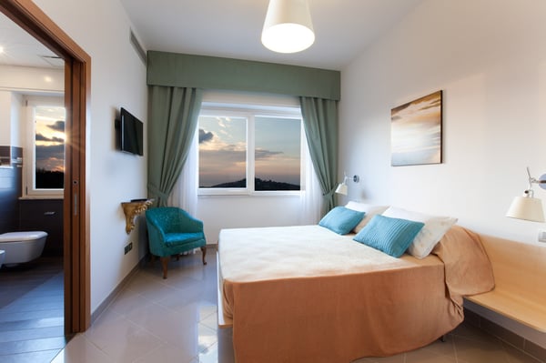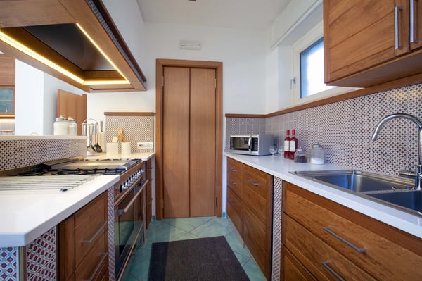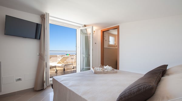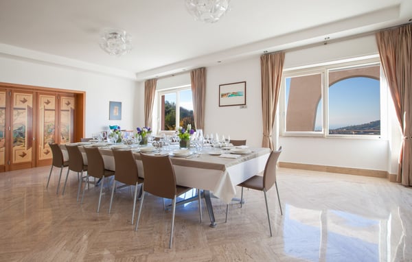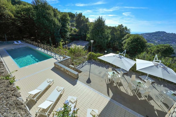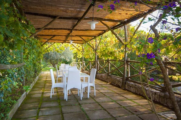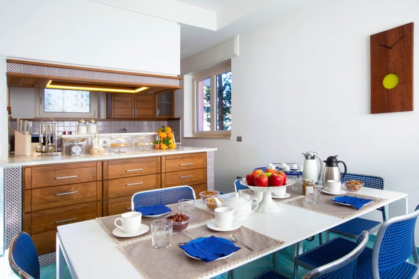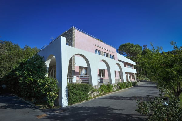 Set on a hilltop of the Sorrentino coast, Annia is a perfectly preserved 1950's luxury villa, showing its beauty with pride. It is located few kilometers from the lively and bustling Sorrento and at walking distance from the closest village. The modernist design of this property, with distinctive features such as large windows, exterior color accents, and open plan living, will please those who appreciate a minimalist look and great functionality of the space. From its terraces and from almost every room you can enjoy stunning sea views and unforgettable sunsets with the Bay of Naples and glitzy Capri in the distance. The quiet location of the villa is just what you need after a day of touring on the busy streets of the coast. Added bonuses for guests with limited mobility are the easy access from the road, no steps from the parking lot to the villa, and the internal elevator. During the summer months, the garden offers organic fruits and vegetables ready to be picked and enjoyed.
