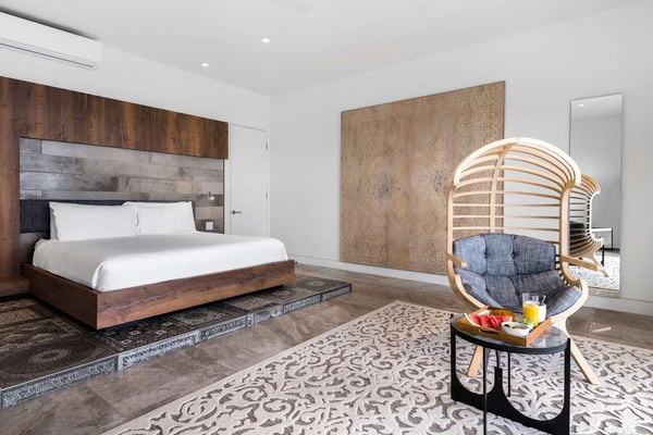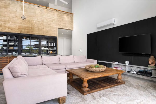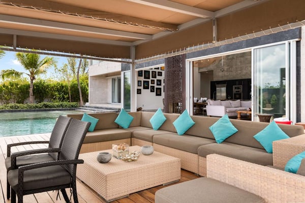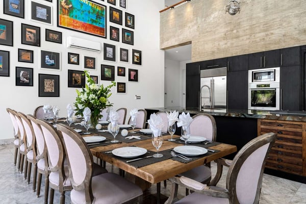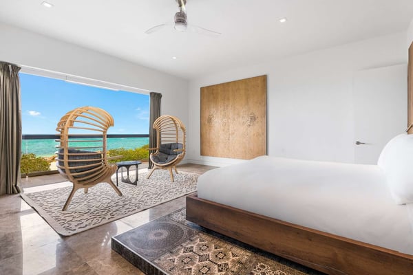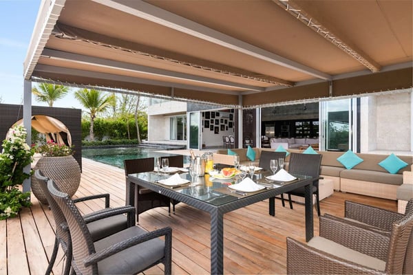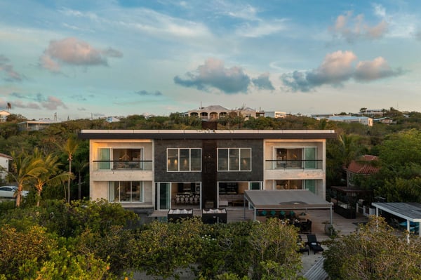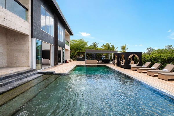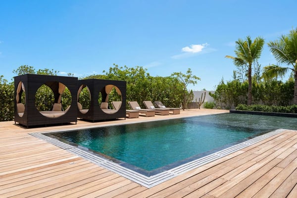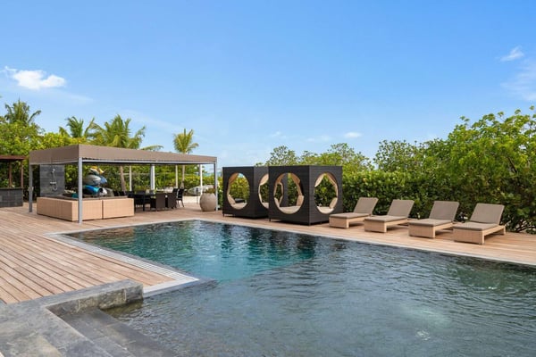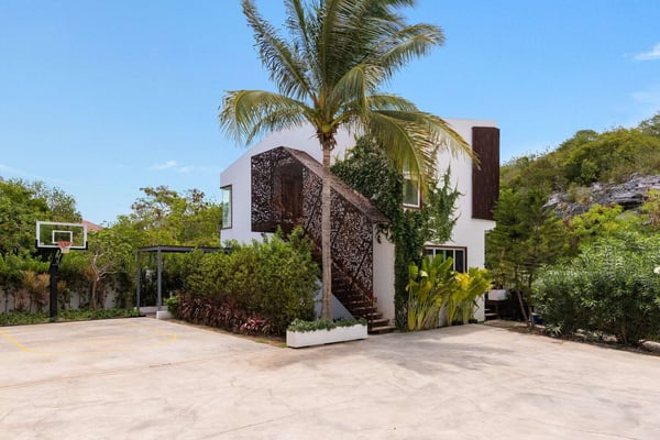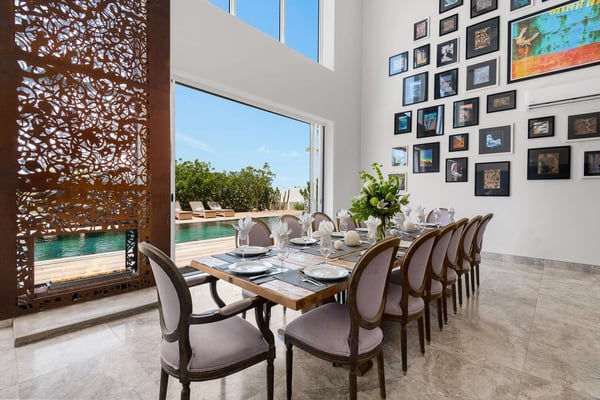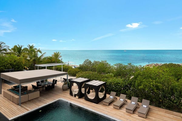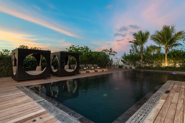 Villa Doma is an 8,000-square-foot, modern luxury villa situated on one of the most pristine beaches in the world. The oceanfront property offers a secluded escape, whether for vacation or company retreats, and a full-service staff for up to 18 guests. With a rich and elegant interior, Villa Doma has seven elegant bedrooms along with a game room that can be used as an additional bedroom. grandiose kitchen overlooking a modern deck and pool area, as well as al fresco dining, relaxing pool cabanas, outdoor basketball court and a separate 2,000 square foot Garden Villa that houses two queen-size en-suite bedrooms and an additional chef's kitchen. Crafted by the renowned Prototype Design Lab, no detail or amenity has been spared in the design and creation of this beachfront property. Whether used for a family getaway or a company retreat, Villa Dome offers the privacy you desire, with the convenience of being just 10 minutes from the airport.
