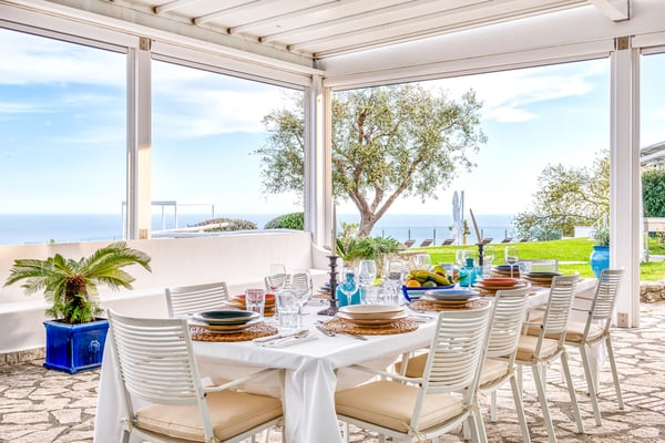 Elegantly sprawled on the hills on the south coast of the Sorrentino Peninsula, Aldana offers spectacular views of the Mediterranean sea. The villa is set in a private location, the ultimate luxury on the Amalfi Coast. With its relaxed and yet sophisticated ambiance where contemporary decor is mixed with few traditional pieces, this villa earns the highest reviews from the guests who stayed there. This property is characterized by spacious rooms and luxury amenities paired with a beautiful manicured extensive terraced garden, and a stunning panoramic infinity pool. Begin your day saluting the sun on the lawn and then end it enjoying the villa's whirlpool with the moon as your only audience. Fill in the remaining time with your favorite local activities. This will be the best vacation you will ever have!