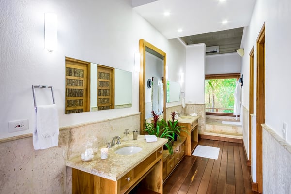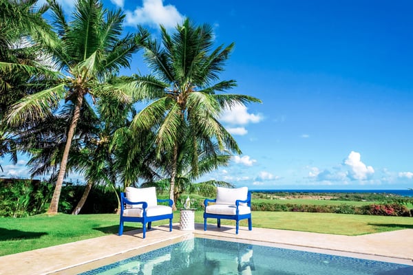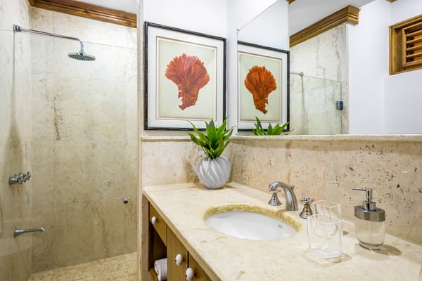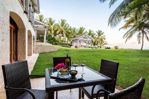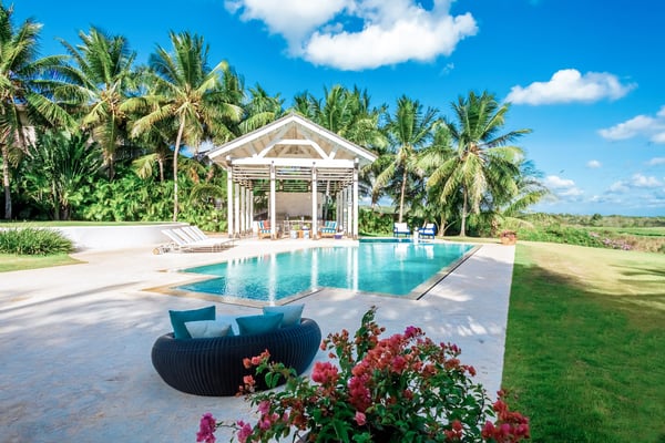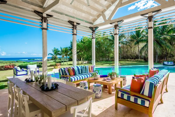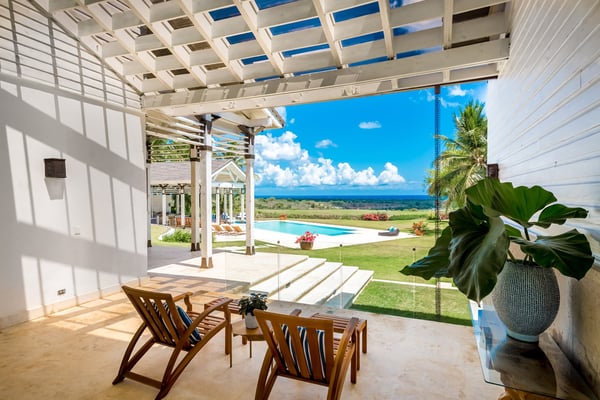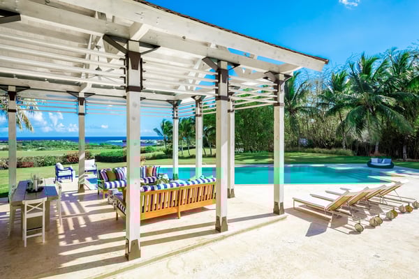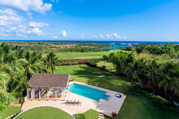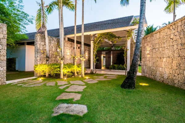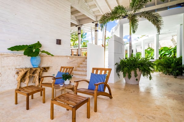 All guests must register with the Casa de Campo Concierge office, and for a small daily fee ($30 per adult per night & $15 per child per night), are granted access to resort areas and amenities. Casa de Campo Resort facilities and amenities include golf courses ($), the fitness centre ($), racquet center ($), restaurants ($) and bars ($). Contact Rental Escapes for more information about pricing. Welcome to River House, an extraordinary five-bedroom villa situated within the prestigious Casa de Campo Resort. Overlooking the pristine Caribbean Sea and the picturesque Chavon River, this property offers a serene and luxurious escape surrounded by breathtaking natural beauty. Designed with a harmonious blend of Caribbean architecture and open-air living, the villa invites the outdoors in with its flowing layout and expansive high ceilings. Warm stonework and rich wood accents enhance the villa’s sophisticated yet relaxed atmosphere, making it the perfect retreat for unwinding in style. Just a ten-minute drive from the villa, the tranquil Playa Minitas awaits, offering a pristine haven for sun and sea lovers. Back at River House, the terrace provides a lush sanctuary with tropical greenery, swaying palms, and two sparkling swimming pools. These inviting spaces are perfect for relaxation or entertaining, allowing guests to fully immerse themselves in the beauty and luxury of this remarkable estate.