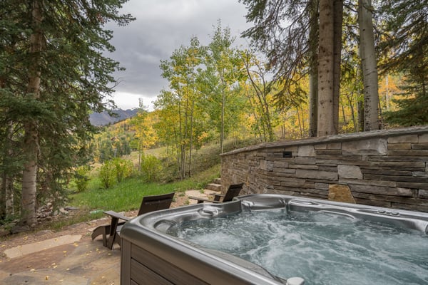Perfect for a getaway during any season of the year, this lovely private home is beautifully situated in the woods near a trail that leads guests straight to the Mountain Village core. Guests who choose this well-landscaped vacation residence are treated to an authentic cabin experience with all of the best modern amenities. As an added perk, both a small pond and a stream flow through this property, and guests may enjoy it with a trip over the wooden footbridge. Guests enter Yellow Brick Cabin from the front porch that stretches along the entire length of the home, and it opens to a space that features a wooden vaulted ceiling with skylights to allow the sunlight to stream right in. A wood-burning fireplace centers the living room and warms those who are seated on the surrounding tweed sofa and leather armchairs. A fully equipped gourmet kitchen is located near the living area, and it boasts high-end stainless steel appliances from Cuisinart, Viking, SubZero, and a Krups drip coffee maker, custom cabinetry, and rough granite countertops. Meals may be served at the breakfast bar that seats three or in the separate dining room at the lovely dining area that seats up to eight. Near the home's living area is the romantic primary suite, and it boasts an ultra-comfortable king size bed, a flat-screen television, and an en suite bath with granite countertops, dual vanity sinks, and a full glass shower. Another sleeping area may be found in the upstairs loft, and it includes a split king-size bed. This room is served by a bath at the bottom of the stairs that offers a full glass shower. The home's last sleeping area is situated in an impressive multifunctional media room, separated from the main living space by a large wooden sliding door, and it's perfect for the children or the teens in the group. This room boasts a gas fireplace that is surrounded by two leather armchairs, a leather sofa, and a flat-screen television. One wall is lined with four twin size beds that are stacked into bunk beds, and these come with a steel ladder to access the top bunks and a built-in reading light for each bed. Right across the room is a bath with a full glass shower. From this room, guests enjoy direct access to the private deck with a relaxing hot tub. TMV BL# 005208