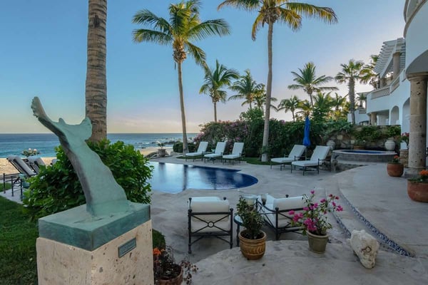 Experience the blend of relaxation and excitement at the beachfront Villa Costa Dorada at Del Mar, Los Cabos, an ideal haven for up to ten guests. This Cabo villa with a private chef boasts five charmingly designed bedrooms perfect for a diverse group. The villa’s standout features include colorful talavera tiling, travertine flooring, dark carved wood furnishings, and beachfront views. An infinity pool leads to a white sand beach along the Sea of Cortez, while a private fire pit and lavish lounging setup invite both day lounging and night bonfires. This beachfront villa offers proximity to the sea, where winter brings migrating whales and summer might spot seals and dolphins. The villa’s amenities, including a butler service and gourmet kitchen, ensure comfort and convenience. The open design of the dining, kitchen, and living spaces promote a smooth flow of interactions.