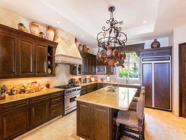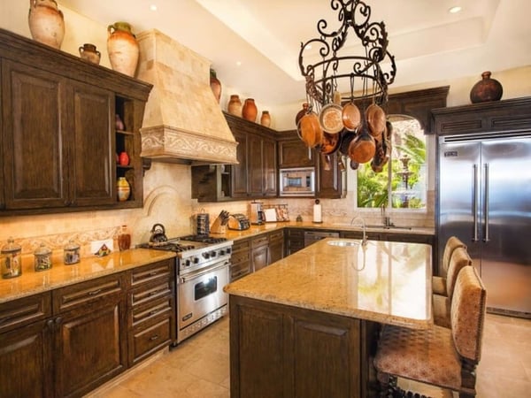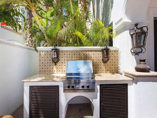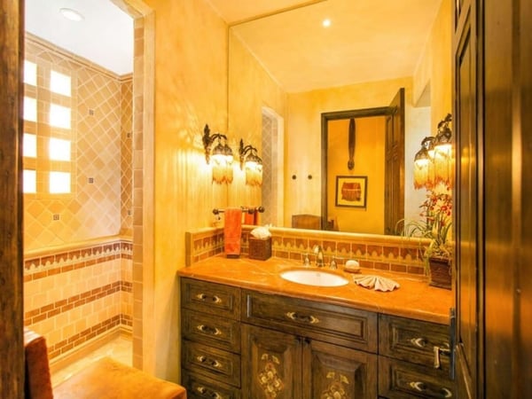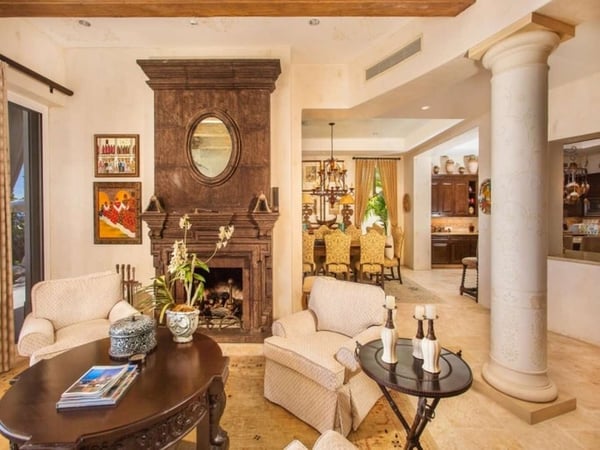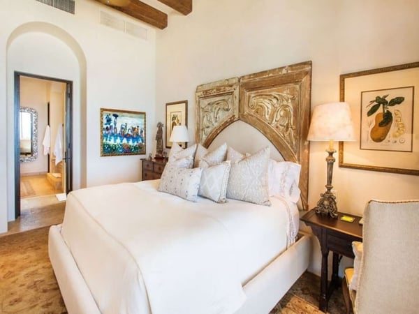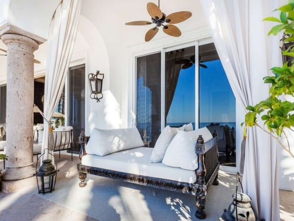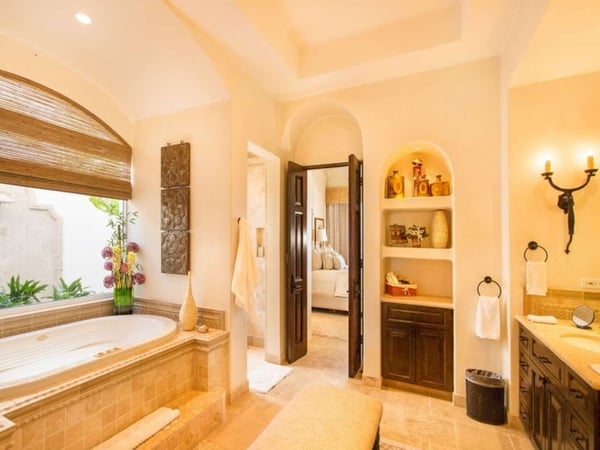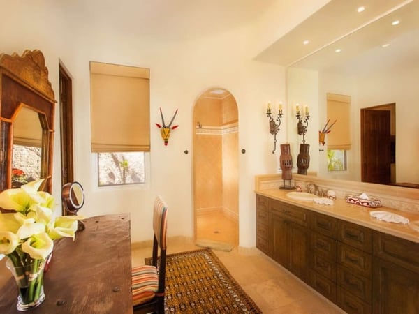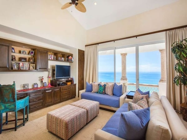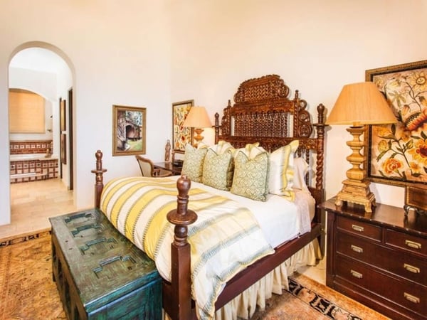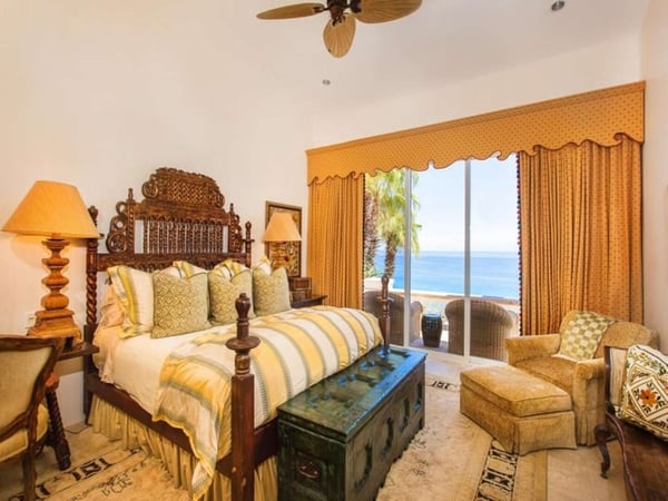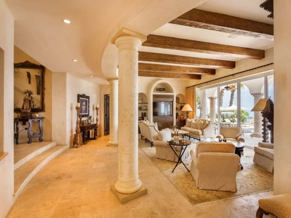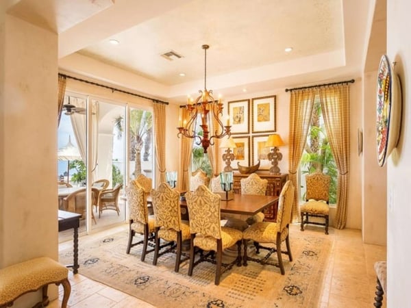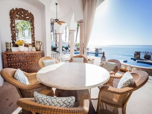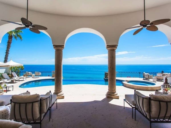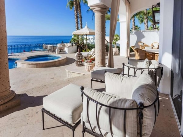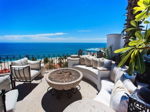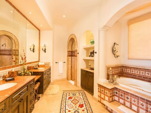 Experience a perfect blend of luxury and comfort at Casa Brisa Mediterránea, a picturesque seafront villa in Los Cabos, Mexico. This expansive villa, extending over 7,500 square feet of interior and exterior space, seamlessly combines the enchantment of Morocco, ancient Rome, and Spanish colonial aesthetics. Offering five spacious bedrooms, each with adjoining beautifully tiled bathrooms and terraces overlooking the pool and sea, this sun-drenched villa is an ideal getaway for large families or groups of friends. The villa’s open-air loggia, infinity pool, Jacuzzi, fire pit, and state-of-the-art grill create a serene and convivial atmosphere, while the stunning decor promotes a sense of contemporary casual elegance. Casa Brisa Mediterránea greets guests with a charming courtyard featuring a lapis-tiled fountain and Balinese meditation bench, leading to an impressive stone foyer and high society-style staircase. The living area, graced with Tuscan columns and two plush seating arrangements, sets the tone for a relaxed stay. The villa offers a dedicated butler service, with a spacious gourmet kitchen and a formal dining room at your disposal. For entertainment, head to the family room with its ornate fireplace and TV setup, or use the office-bedroom hybrid for work or play.