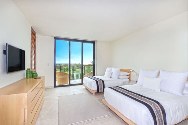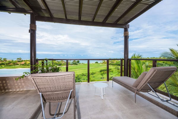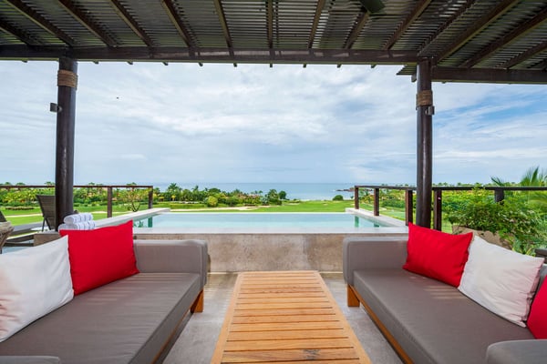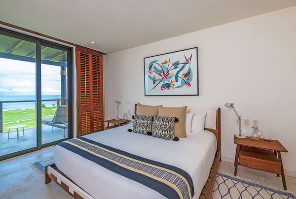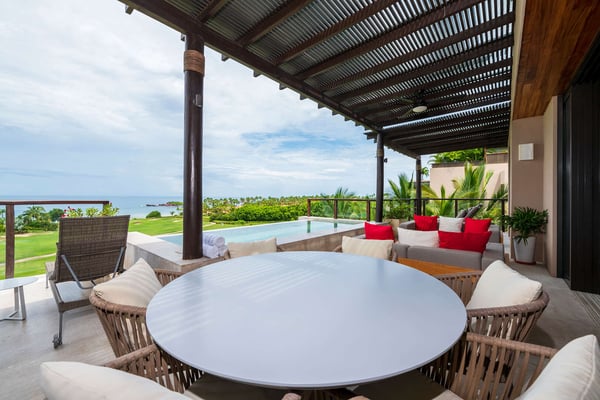 Condo Dalia is located along the 18th hole of the Jack Nicklaus Signature Bahía Golf Course within Punta Mita, offering a luxurious lifestyle with ocean views and contemporary design. The residence includes two ocean-facing primary bedrooms, each with en-suite bathrooms, an expansive terrace with a plunge pool, and separate living and dining areas.