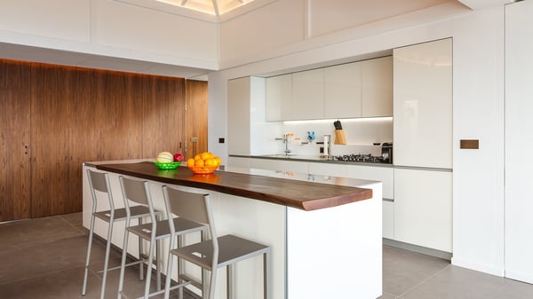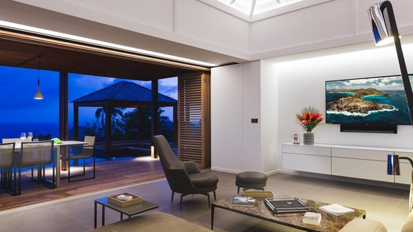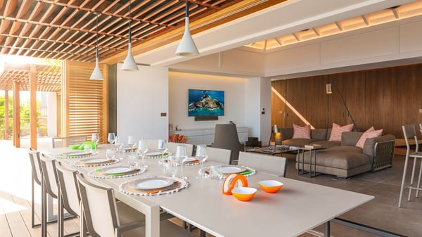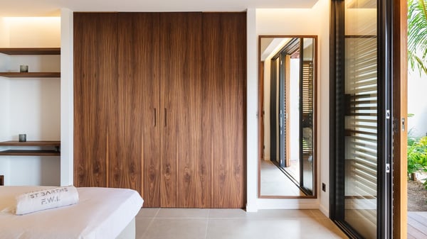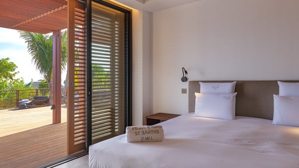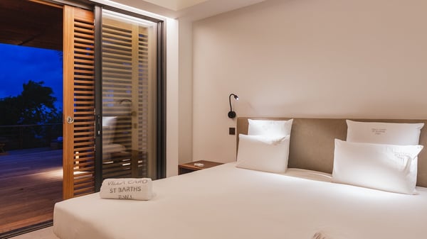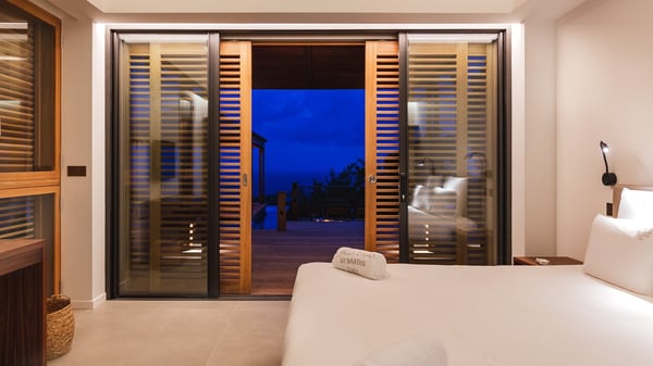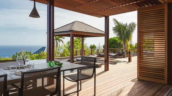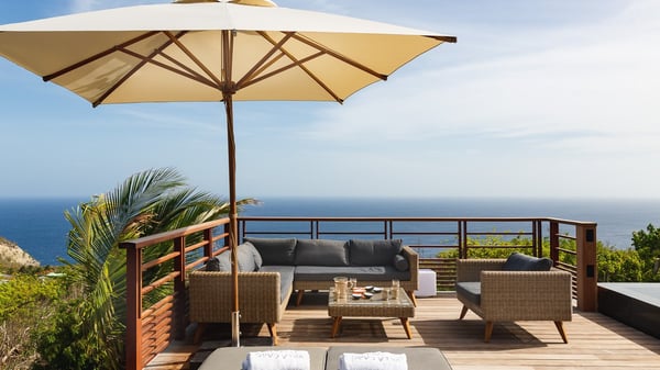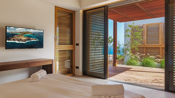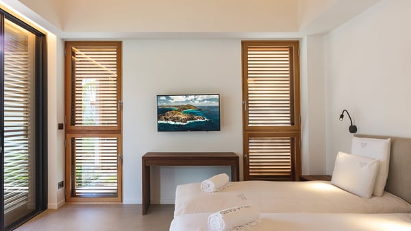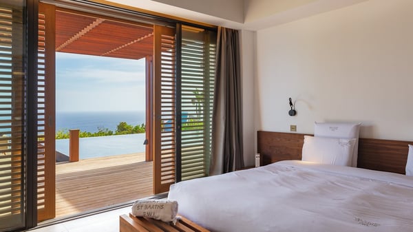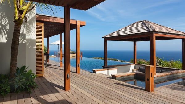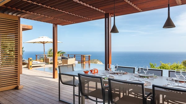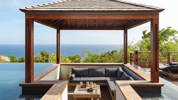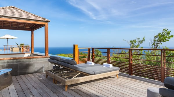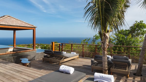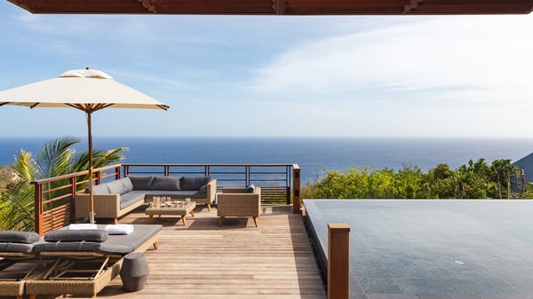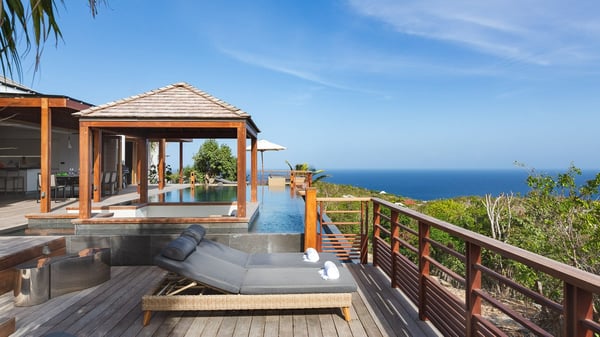 The newly built luxury rental villa Caro is located in the Lurin neighbourhood, close to Gouverneur and its famous beach. The panoramic ocean view offers magical sunset shows, while enjoying the calm and the high-standard comfort of this vacation home in St-Barthelemy. The convivial and inviting living room is entirely open to the outside and offers breathtaking views of the environment and the ocean. Cushions and sofas make guests feel the true and unique art of living in St-Barths. The main room is fully air-conditioned and can be closed off by the large glass doors. The nice wooden panelling in the back of the great room, discreetly hides the entrance door, and also an office, for guests looking for some quiet time to catch up on work. In a mineral atmosphere, the well-equipped kitchen with breakfast bar is the best place for cooking, complemented by the barbecue located outside. Facing the ocean and topped with sleek hanging lamps, the dining room features a table that can accommodate up to fourteen guests. The expansive wooden terrace features a splendid heated infinity edge pool with a breathtaking view over the infinite ocean in the distance. A gazebo with a corner sofa and coffee table is on the side of the pool, seeming to float unexpectedly on the water. A little further, deck chairs invite you to relax and contemplate the wonderful sunsets. On the other side of the terrace, a lounge area is set up with umbrellas and sofas for very private moments. Here is the place where guests have a true paradisiacal feeling of beauty and serenity in the heart of a luxuriant vegetation. This magnificent rental property Caro Villa welcomes you with your family or friends in five comfortable and similar bedrooms. Three of them are in the main building and open onto a beautiful ocean view; they have king-size beds and en-suite bathrooms. The other two rooms are located in bungalows, at the back and offer privacy and quietness. Twin beds that can be converted into king-size beds as well as private bathrooms are also available. To complete your stay at the villa Caro in St. Barthelemy, there is a well-equipped fitness room on the lower level.