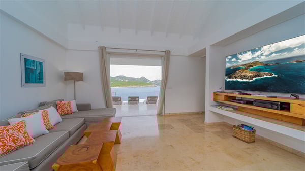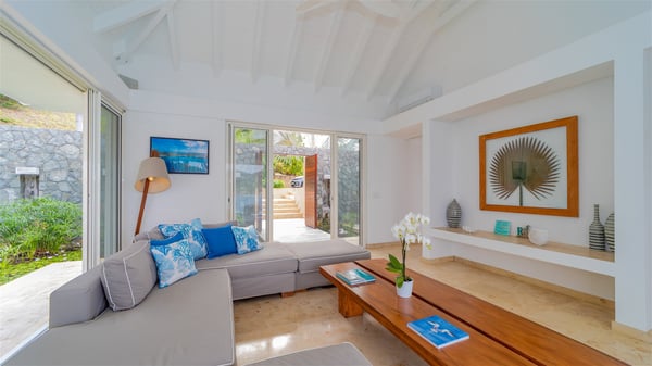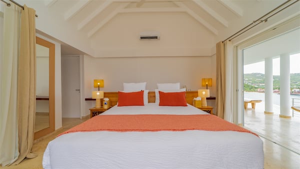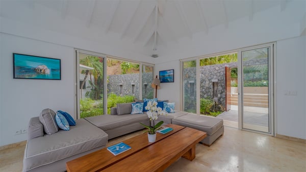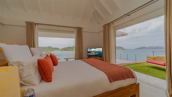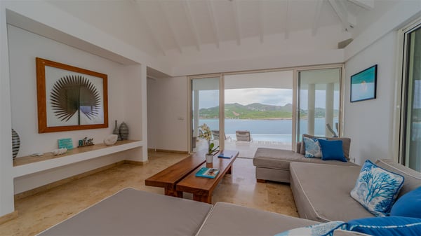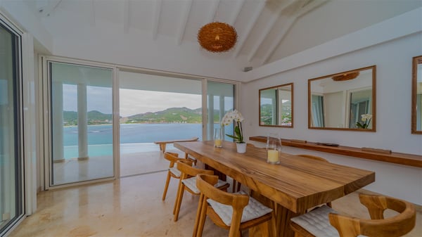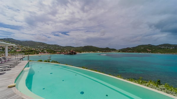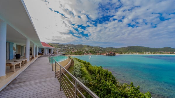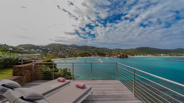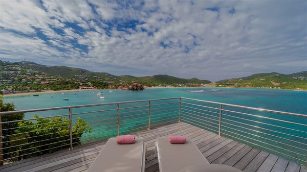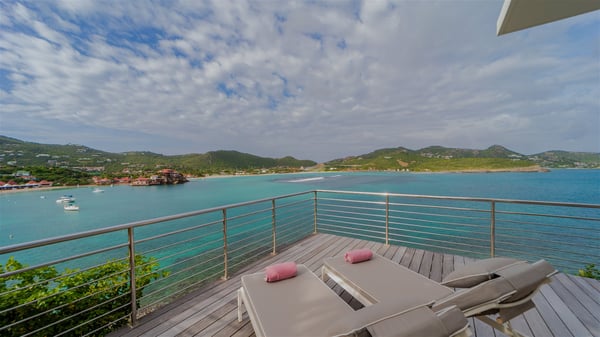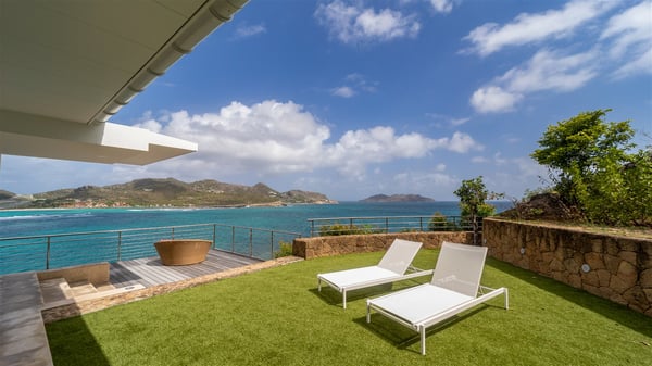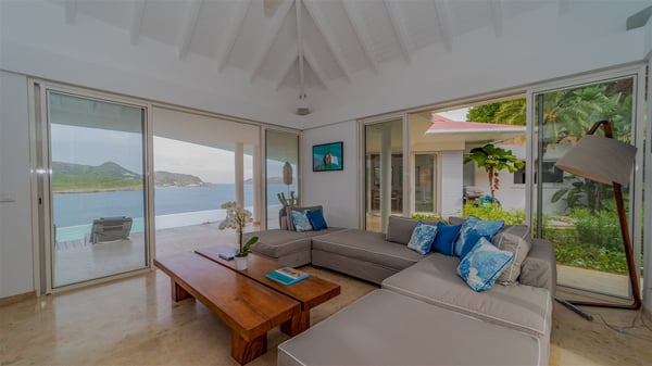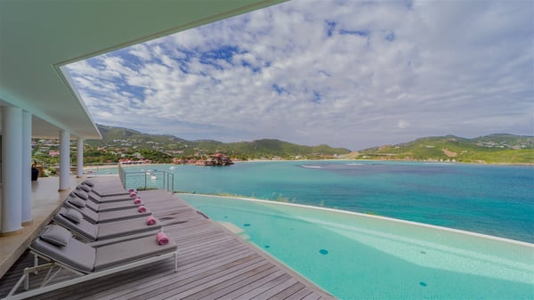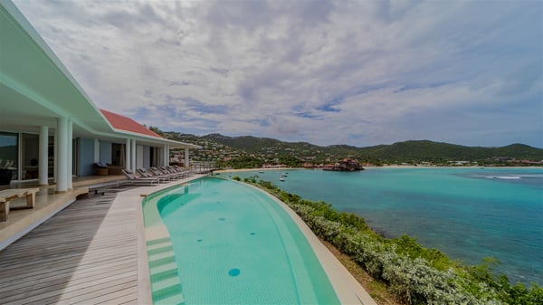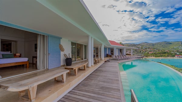 Nestled on a hillside at the quietest and farthest end of St.Jean Bay, the luxurious rental villa Reef Point is a superb property located in a private and very quiet domain. Built on a single level, Reef Point offers one of the most beautiful panoramic ocean views day and night, as you marvel at the Saint-Barth’s glorious sunsets. Tastefully decorated in a modern and sleek style, the vacation property Reef Point is a true private paradise in addition to the marvellous perspective. Its large and airy living room features two adjoining spaces opening onto the ocean and the back of the house, for a soft, natural ventilation. With comfortable sofas, cushions, benches and coffee tables, this space is very cozy and welcoming, between ocean and lush vegetation. Clean lines, neutral tones, and exotic furnishings create a contemporary atmosphere, also complemented by beautiful art photographs of the “old St-Barths”, giving a nice touch of authenticity to the indoor spaces. At the back of the villa, fountains are flowing into a pretty pond with aquatic plants, bringing freshness and romance to it all. In the next building, the spacious and well-equipped kitchen opens onto the dining area which can accommodate up to eight guests around an expansive dining table and mirrors, under suspensions bringing a soft light in the evening. On the terrace, there is a superb heated infinity swimming pool, seemingly blending with the turquoise waters of St. Barths. This is an idyllic scenery for sunbathing sessions, around the outdoor rattan lounge and wooden benches sheltered under the covered terrace set with columns. In a driftwood decor, all is designed to bring calm, relaxation and serenity, facing the outstanding view over the St-Jean bay. The rental villa Reef Point in St-barths has three beautiful air-conditioned bedrooms for a dream vacation with family or friends. Under the whitewashed mansard ceilings, each room is spacious and has a king-size bed, an en-suite bathroom and breathtaking ocean views. The rooms provide easy access to the terrace and ocean views beyond, for a full enjoyment of the island’s beauty at any time of the day or night, under the St-Barths’ stars.