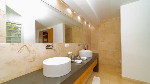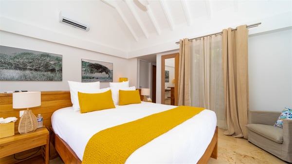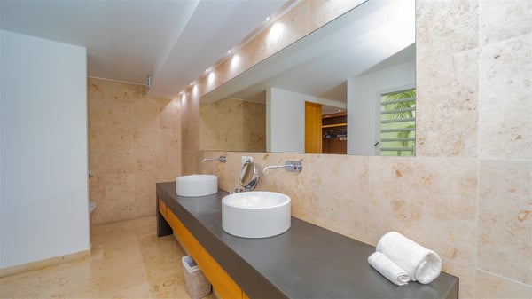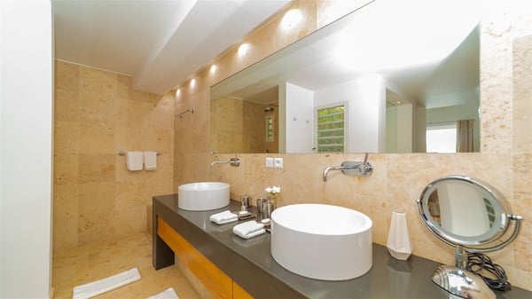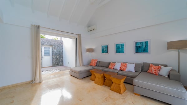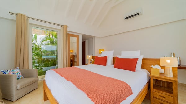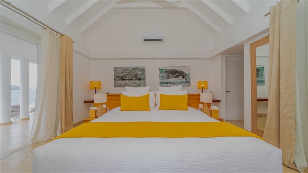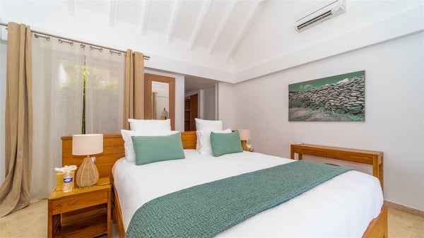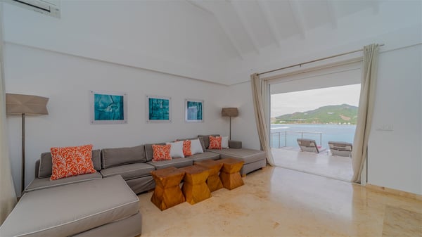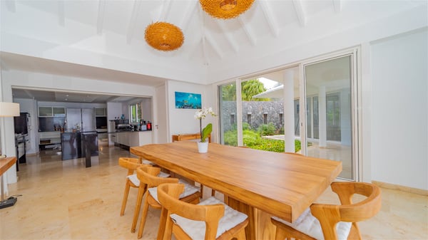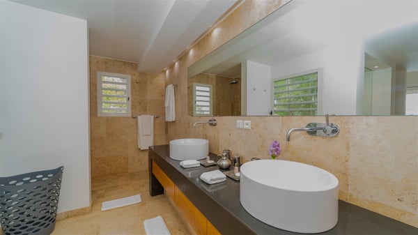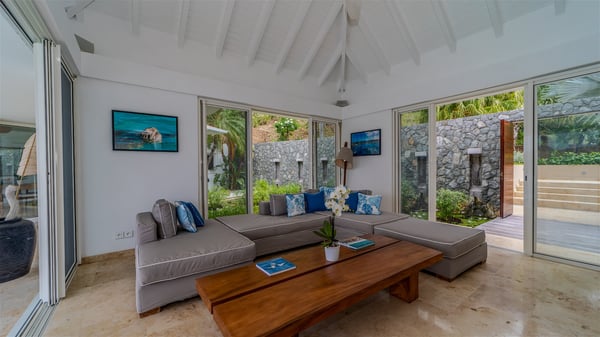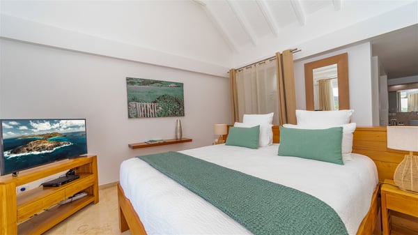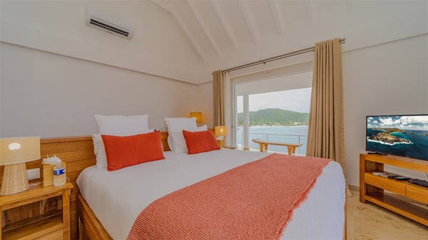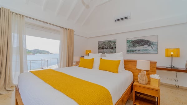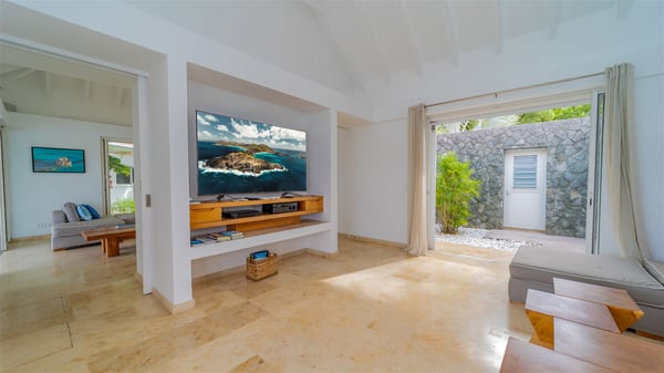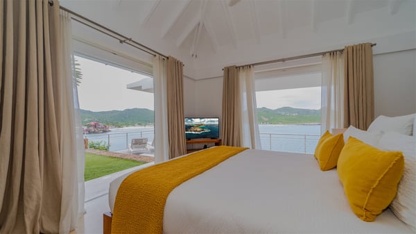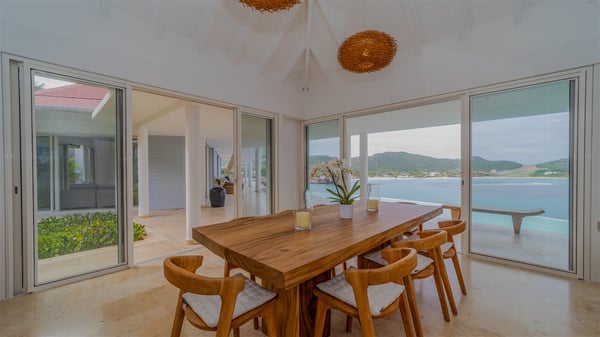 Nestled on a hillside at the quietest and farthest end of St.Jean Bay, the luxurious rental villa Reef Point is a superb property located in a private and very quiet domain. Built on a single level, Reef Point offers one of the most beautiful panoramic ocean views day and night, as you marvel at the Saint-Barth’s glorious sunsets. Tastefully decorated in a modern and sleek style, the vacation property Reef Point is a true private paradise in addition to the marvellous perspective. Its large and airy living room features two adjoining spaces opening onto the ocean and the back of the house, for a soft, natural ventilation. With comfortable sofas, cushions, benches and coffee tables, this space is very cozy and welcoming, between ocean and lush vegetation. Clean lines, neutral tones, and exotic furnishings create a contemporary atmosphere, also complemented by beautiful art photographs of the “old St-Barths”, giving a nice touch of authenticity to the indoor spaces. At the back of the villa, fountains are flowing into a pretty pond with aquatic plants, bringing freshness and romance to it all. In the next building, the spacious and well-equipped kitchen opens onto the dining area which can accommodate up to eight guests around an expansive dining table and mirrors, under suspensions bringing a soft light in the evening. On the terrace, there is a superb heated infinity swimming pool, seemingly blending with the turquoise waters of St. Barths. This is an idyllic scenery for sunbathing sessions, around the outdoor rattan lounge and wooden benches sheltered under the covered terrace set with columns. In a driftwood decor, all is designed to bring calm, relaxation and serenity, facing the outstanding view over the St-Jean bay. The rental villa Reef Point in St-barths has three beautiful air-conditioned bedrooms for a dream vacation with family or friends. Under the whitewashed mansard ceilings, each room is spacious and has a king-size bed, an en-suite bathroom and breathtaking ocean views. The rooms provide easy access to the terrace and ocean views beyond, for a full enjoyment of the island’s beauty at any time of the day or night, under the St-Barths’ stars.