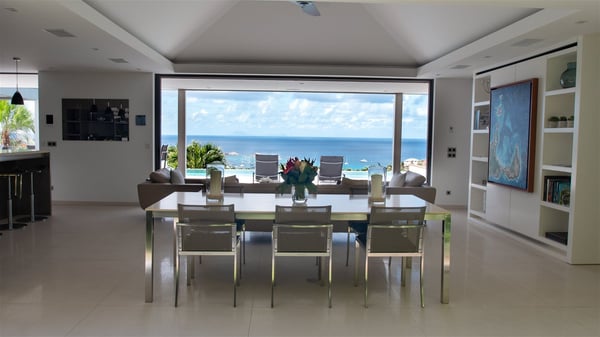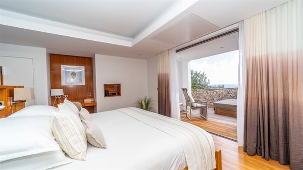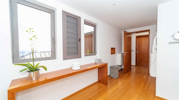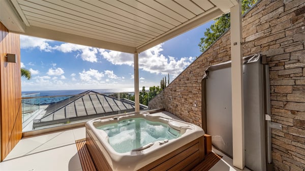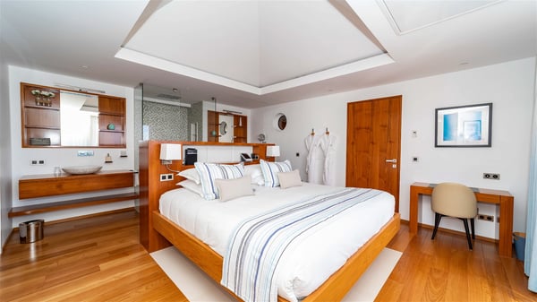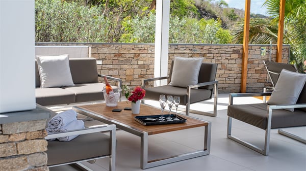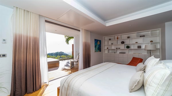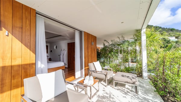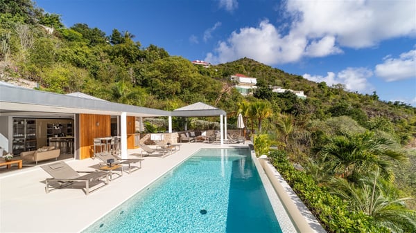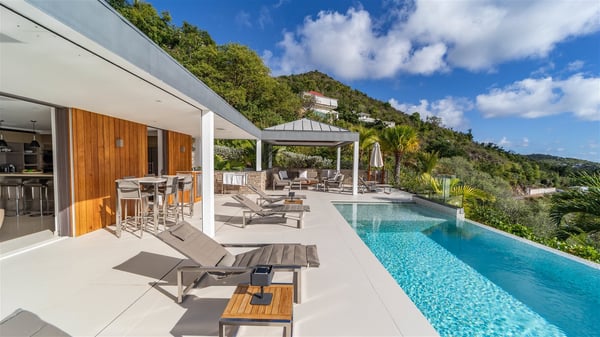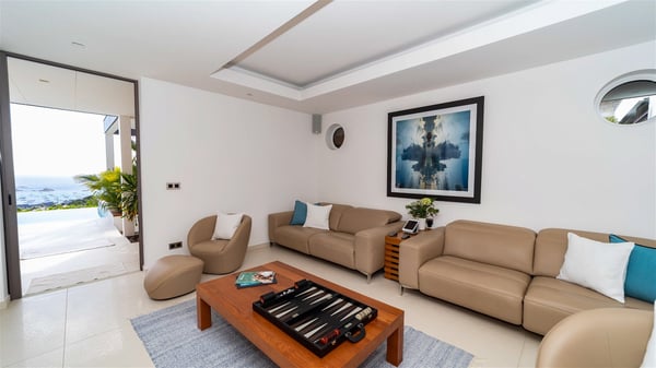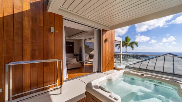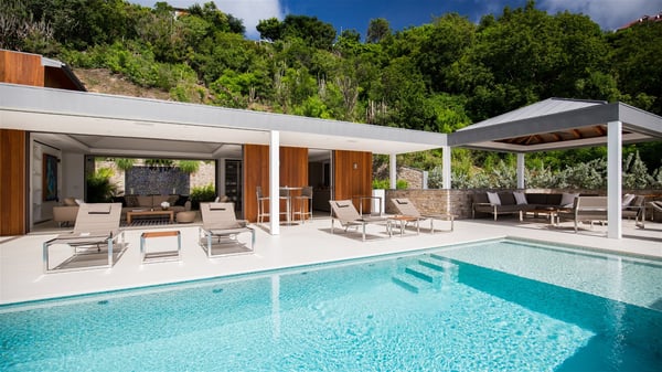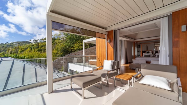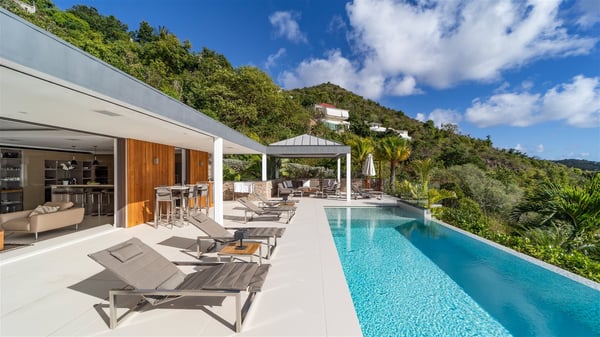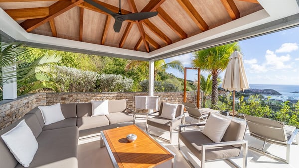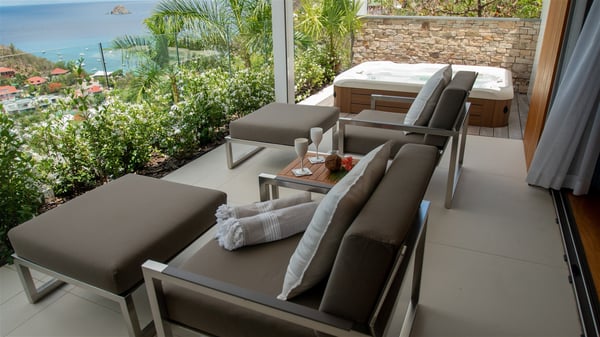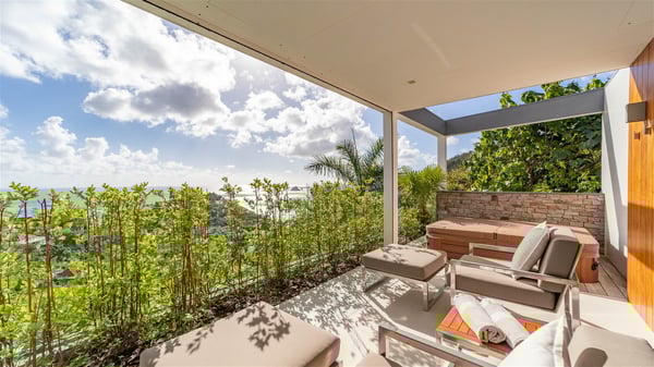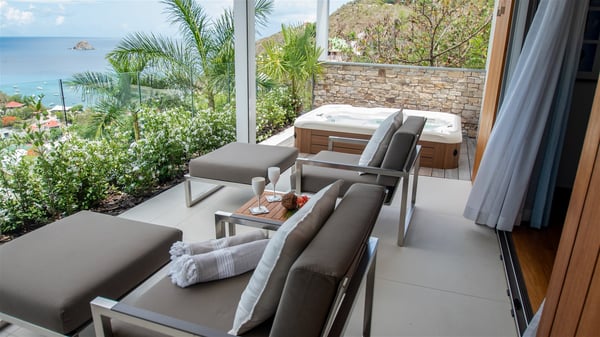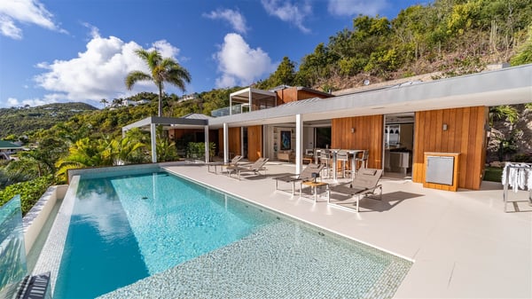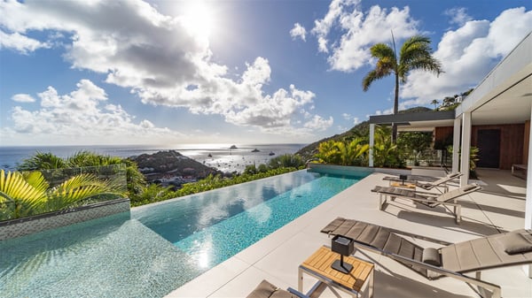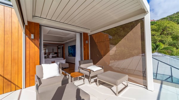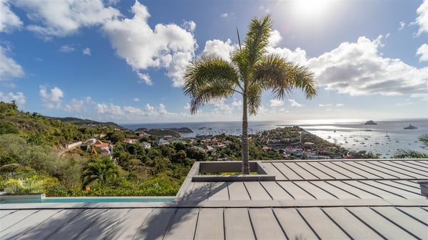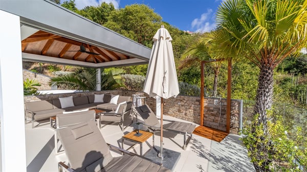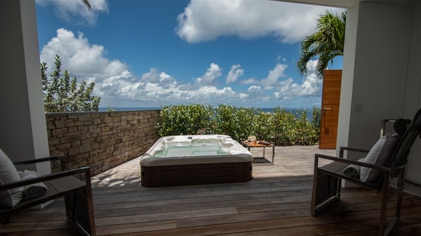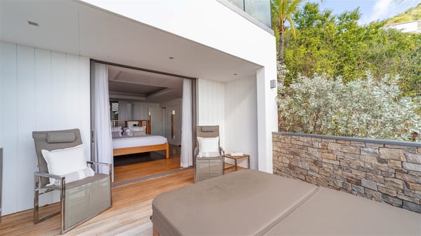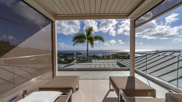 The luxurious rental villa Lao is located on the heights of Corossol, facing a breathtaking panorama over the ocean and the neighbouring islands. You will be amazed by the beauty of the glowing sunsets that can be enjoyed from the terrace. This three-bedroom holiday home is the ideal place for an unforgettable stay in St-Barths with family or friends. Built in a contemporary style, this three-level house opens onto an outstanding panorama, as the architects felt inspired by the exceptional beauty of the place. The modern and harmonious decoration is bright and soothing, coming with soft neutral tones for a most pleasant escape. Enter the splendid holiday villa Lao in Corossol, and get struck by the timeless beauty of its sleek and high-standard furniture. Sofas with soft fabrics, armchairs and cushions are there for times of relaxation, facing the terrace with a breathtaking view over the ocean. The dining room comes with a beautiful table that can accommodate up to six guests, for delicious moments enjoying the dishes prepared in the well-equipped kitchen with a breakfast bar. The relaxing white and taupe colours combined with the transparency of the glass elements create a pure and peaceful atmosphere. Close to the lounge area, you will find the TV corner, where you'll love enjoying movies in utmost privacy, comfortably seated on the sofas. At the back of the house, a water wall brings freshness and romance. At the front of the villa, the terrace features a splendid heated infinity swimming pool, perfect for relaxation, facing the azure horizon of the endless ocean. Sun loungers are arranged around the pool for delightful sunbathing sessions. Under the shaded gazebo, take time to chill on the very comfortable benches covered with cushions, lulled by the trade winds. In the lush tropical environment, you’ll marvel at the beauty of the island and the breathtaking sunsets when the evening comes. The luxurious holiday house Lao in St-Barths has three beautiful air-conditioned bedrooms, each of which is on a different level for utmost privacy. They all offer a beautiful view over the tropical environment and the ocean, and are furnished with king-size beds with warm, soft and comfortable textiles. All three rooms have an en-suite bathroom and access to a private terrace. For sports lovers, an air-conditioned fitness room and a jacuzzi are also available.