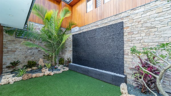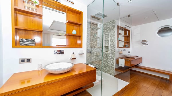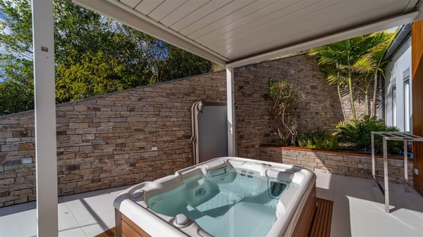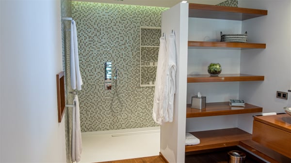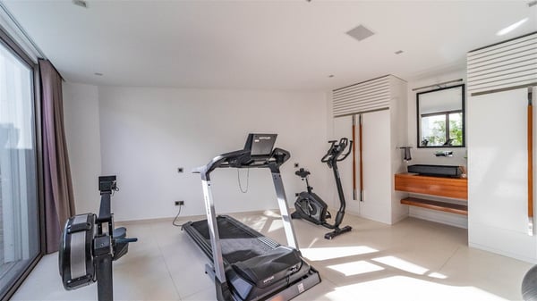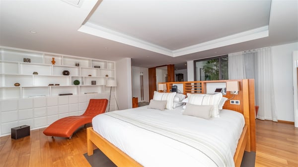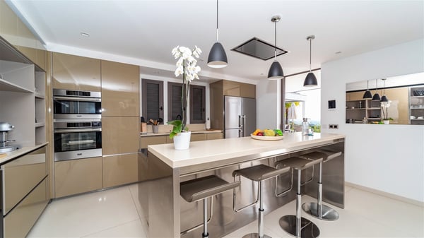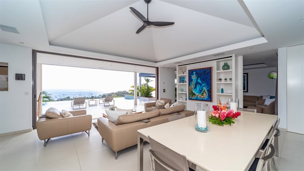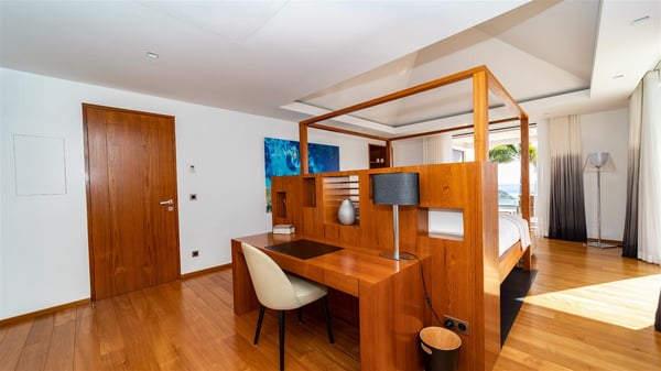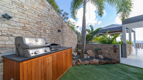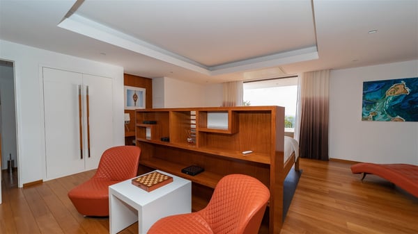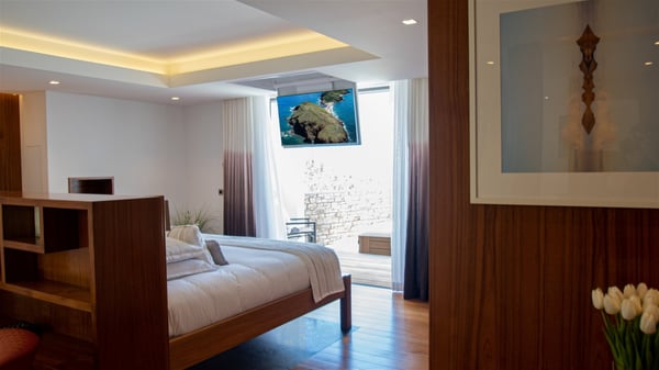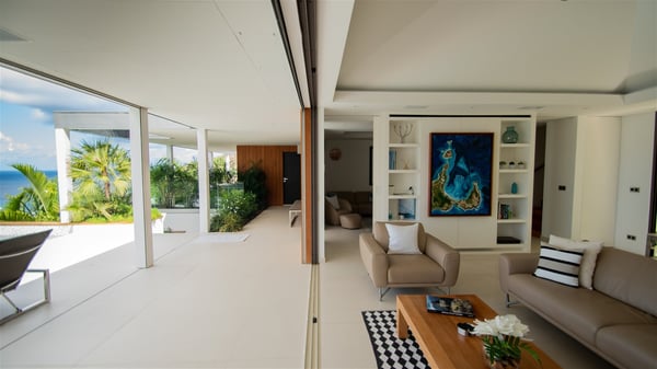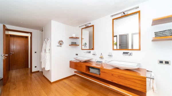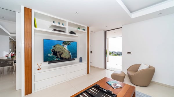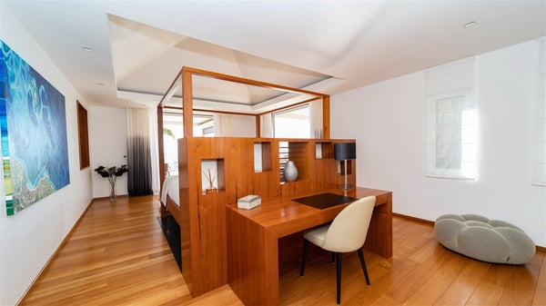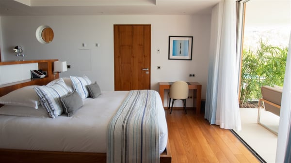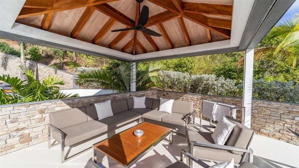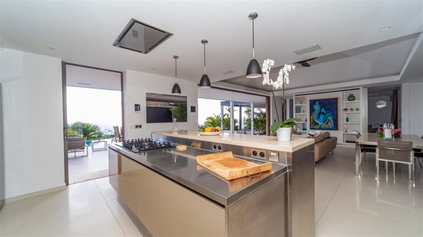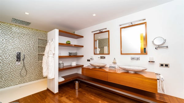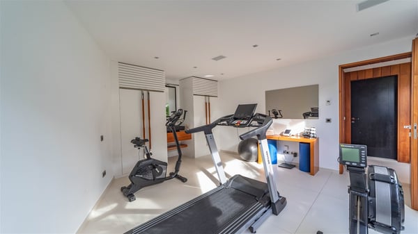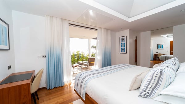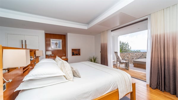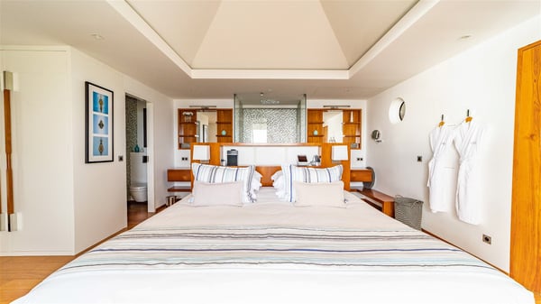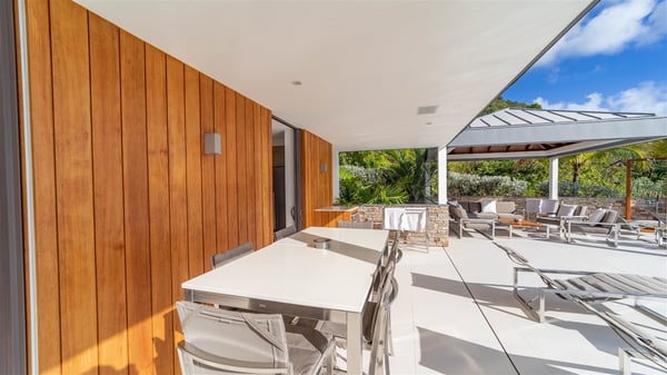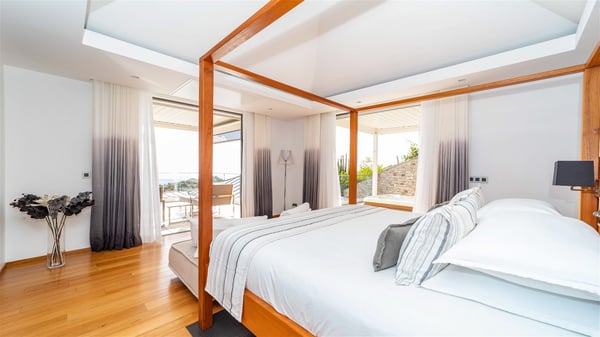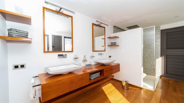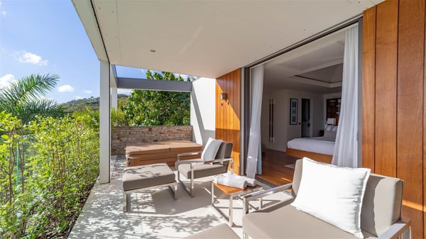 The luxurious rental villa Lao is located on the heights of Corossol, facing a breathtaking panorama over the ocean and the neighbouring islands. You will be amazed by the beauty of the glowing sunsets that can be enjoyed from the terrace. This three-bedroom holiday home is the ideal place for an unforgettable stay in St-Barths with family or friends. Built in a contemporary style, this three-level house opens onto an outstanding panorama, as the architects felt inspired by the exceptional beauty of the place. The modern and harmonious decoration is bright and soothing, coming with soft neutral tones for a most pleasant escape. Enter the splendid holiday villa Lao in Corossol, and get struck by the timeless beauty of its sleek and high-standard furniture. Sofas with soft fabrics, armchairs and cushions are there for times of relaxation, facing the terrace with a breathtaking view over the ocean. The dining room comes with a beautiful table that can accommodate up to six guests, for delicious moments enjoying the dishes prepared in the well-equipped kitchen with a breakfast bar. The relaxing white and taupe colours combined with the transparency of the glass elements create a pure and peaceful atmosphere. Close to the lounge area, you will find the TV corner, where you'll love enjoying movies in utmost privacy, comfortably seated on the sofas. At the back of the house, a water wall brings freshness and romance. At the front of the villa, the terrace features a splendid heated infinity swimming pool, perfect for relaxation, facing the azure horizon of the endless ocean. Sun loungers are arranged around the pool for delightful sunbathing sessions. Under the shaded gazebo, take time to chill on the very comfortable benches covered with cushions, lulled by the trade winds. In the lush tropical environment, you’ll marvel at the beauty of the island and the breathtaking sunsets when the evening comes. The luxurious holiday house Lao in St-Barths has three beautiful air-conditioned bedrooms, each of which is on a different level for utmost privacy. They all offer a beautiful view over the tropical environment and the ocean, and are furnished with king-size beds with warm, soft and comfortable textiles. All three rooms have an en-suite bathroom and access to a private terrace. For sports lovers, an air-conditioned fitness room and a jacuzzi are also available.