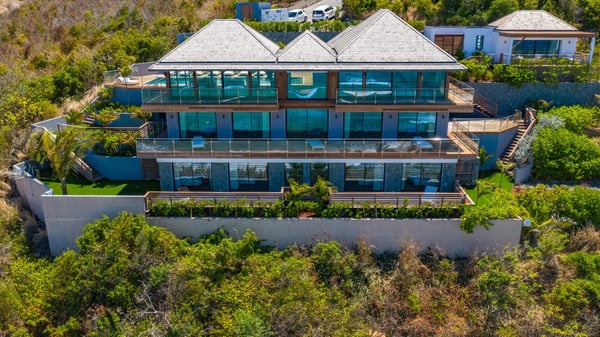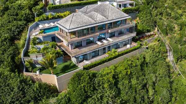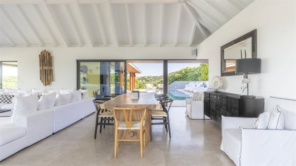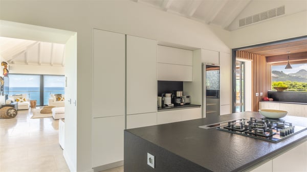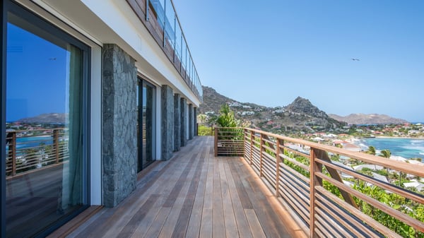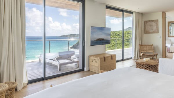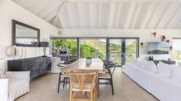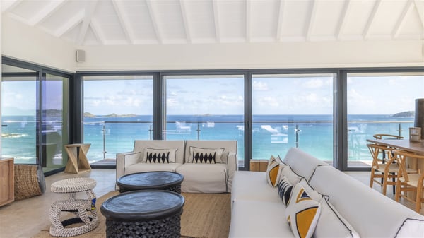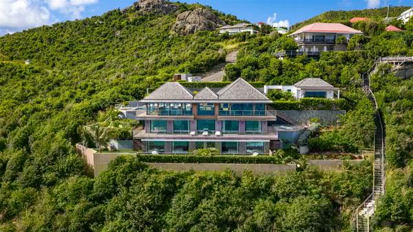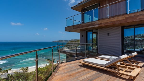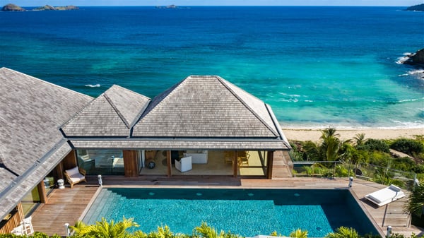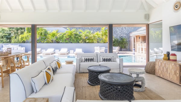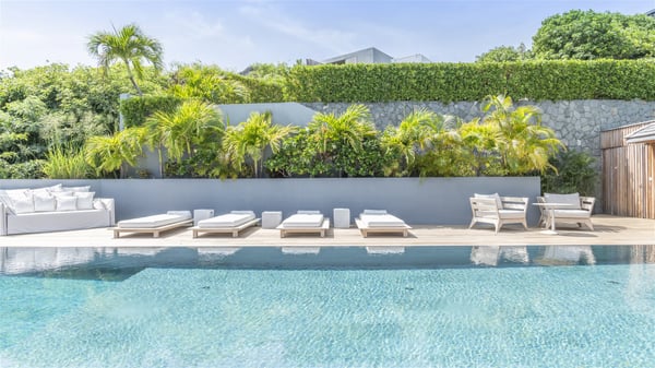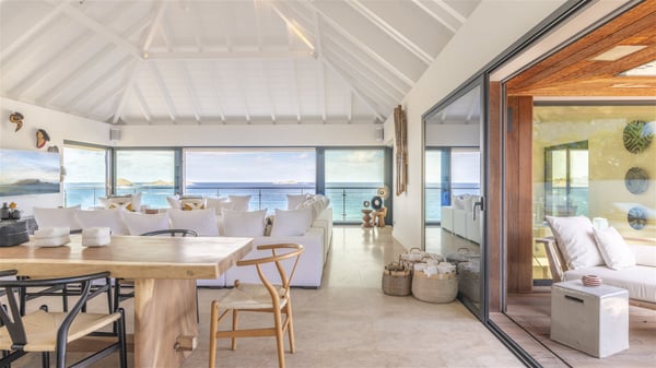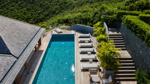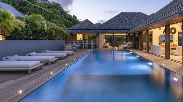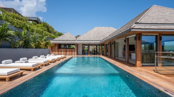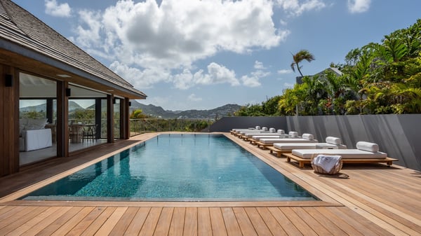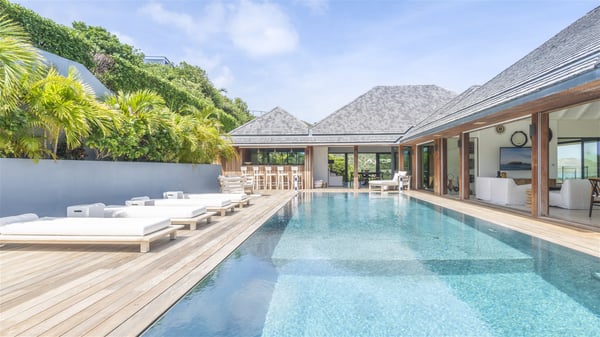 Nestled on a hillside overlooking the bay of Anse des Cayes, the luxurious villa Firefly is one of the most outstanding rental properties in St. Barths. Ideally located at the end of a private road, this quiet villa offers a spectacular panoramic view over the bay, the Atlantic Ocean and the beach of Anse des Cayes. Built on three levels, this large seven-bedroom house is the perfect haven of peace for large groups wishing to share a modern and luxurious property in St. Barthelemy. The contemporary, modern and splendid villa Firefly is built with noble materials such as soft fabrics, beautifully weathered wood and high-quality glass. The architecture is spacious, with many living spaces allowing to rest or entertain as you wish. In a refined interior design with a bohemian and chic style, there are two large living rooms on either side of an interior staircase leading to the lower levels. These two bright and airy living spaces feature comfortable sofas and large wooden dining tables. The sober decoration with white tones under the high wooden ceilings creates a fine atmosphere, with a stunning panoramic view through the large windows. These two living rooms open onto the terrace and the swimming pool, where an outdoor bar connects the gourmet kitchen perfect for a private chef. On the terrace, you’ll marvel at the large heated swimming pool with steps perfect for relaxing and enjoying the beauty of Saint-Barts. Comfortable loungers are set up for reading or sunbathing sessions in the heart of a lush tropical environment with palm trees and green lawns all around the property. Villa Firefly welcomes you in seven large air-conditioned rooms with en-suite bathrooms, panoramic ocean views and private terraces. The master bedroom is located in a separate pavilion at the top of the property, while the other six suites are spread over the two levels of the main building. Firefly is a true dream villa with upscale services for an unforgettable vacation in St. Barths with family or friends.