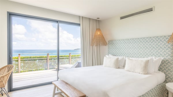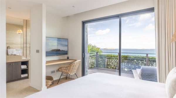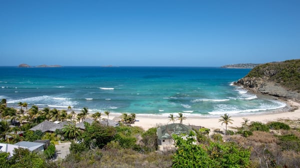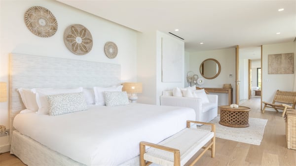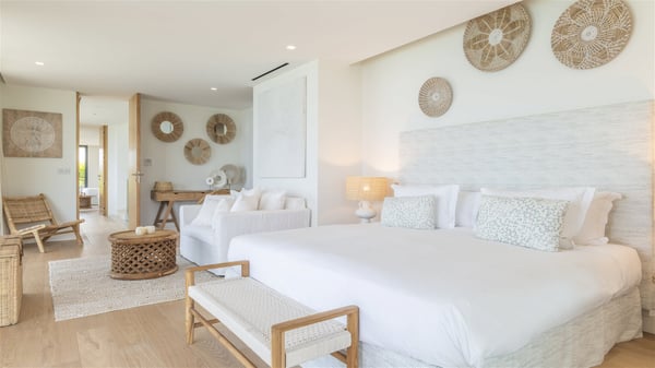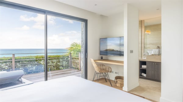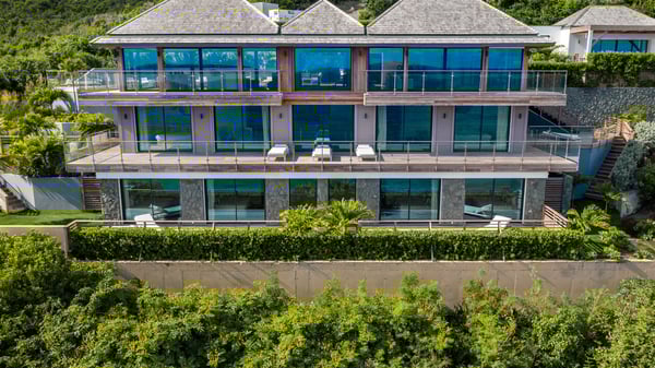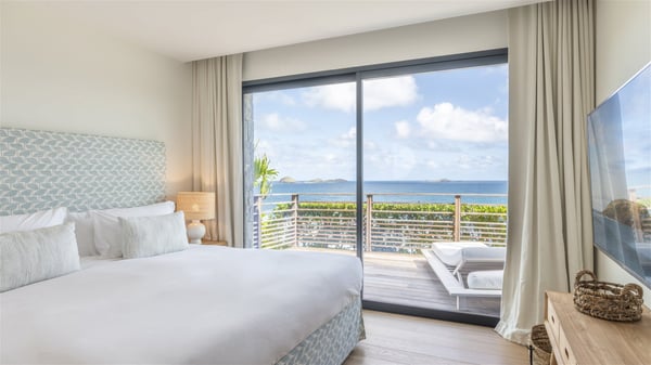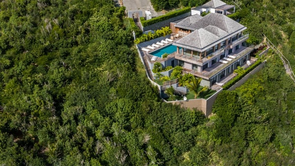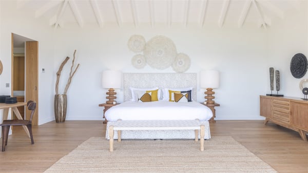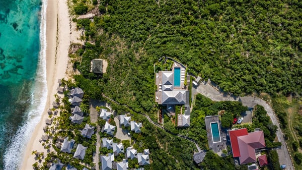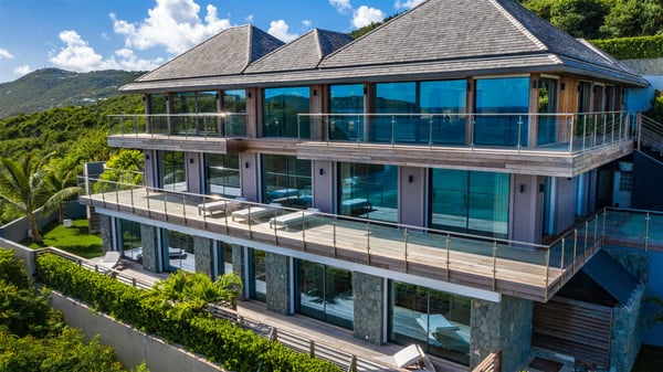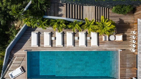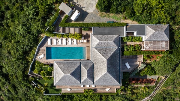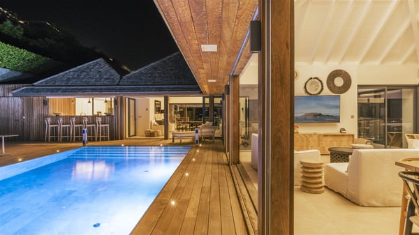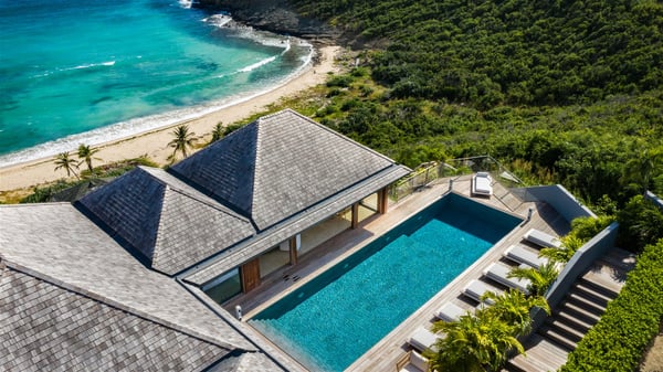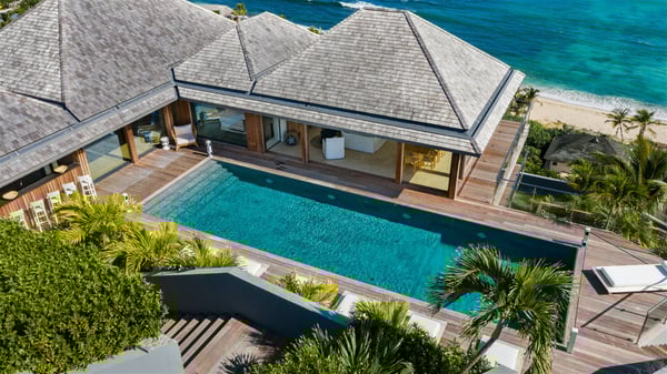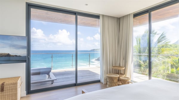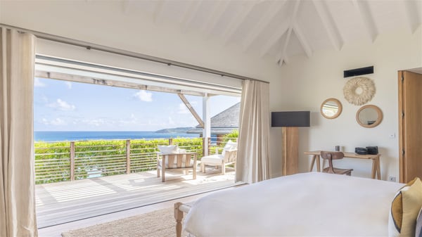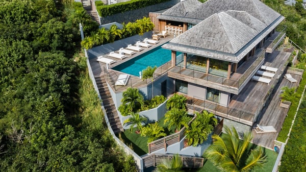 Nestled on a hillside overlooking the bay of Anse des Cayes, the luxurious villa Firefly is one of the most outstanding rental properties in St. Barths. Ideally located at the end of a private road, this quiet villa offers a spectacular panoramic view over the bay, the Atlantic Ocean and the beach of Anse des Cayes. Built on three levels, this large seven-bedroom house is the perfect haven of peace for large groups wishing to share a modern and luxurious property in St. Barthelemy. The contemporary, modern and splendid villa Firefly is built with noble materials such as soft fabrics, beautifully weathered wood and high-quality glass. The architecture is spacious, with many living spaces allowing to rest or entertain as you wish. In a refined interior design with a bohemian and chic style, there are two large living rooms on either side of an interior staircase leading to the lower levels. These two bright and airy living spaces feature comfortable sofas and large wooden dining tables. The sober decoration with white tones under the high wooden ceilings creates a fine atmosphere, with a stunning panoramic view through the large windows. These two living rooms open onto the terrace and the swimming pool, where an outdoor bar connects the gourmet kitchen perfect for a private chef. On the terrace, you’ll marvel at the large heated swimming pool with steps perfect for relaxing and enjoying the beauty of Saint-Barts. Comfortable loungers are set up for reading or sunbathing sessions in the heart of a lush tropical environment with palm trees and green lawns all around the property. Villa Firefly welcomes you in seven large air-conditioned rooms with en-suite bathrooms, panoramic ocean views and private terraces. The master bedroom is located in a separate pavilion at the top of the property, while the other six suites are spread over the two levels of the main building. Firefly is a true dream villa with upscale services for an unforgettable vacation in St. Barths with family or friends.
