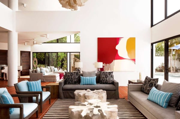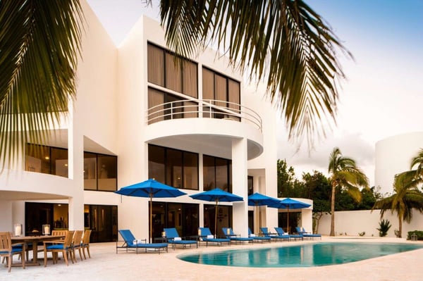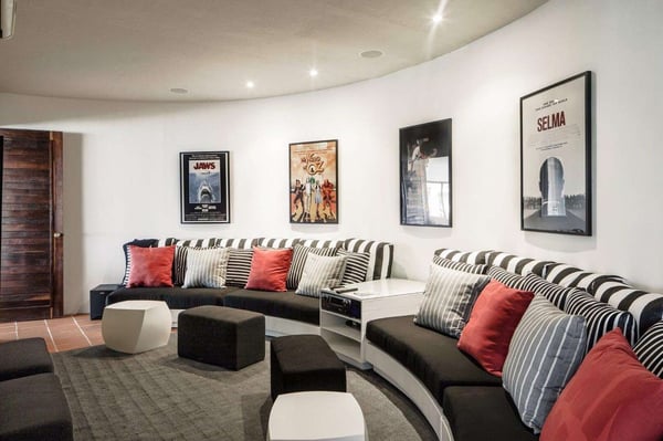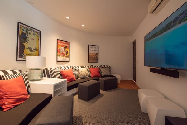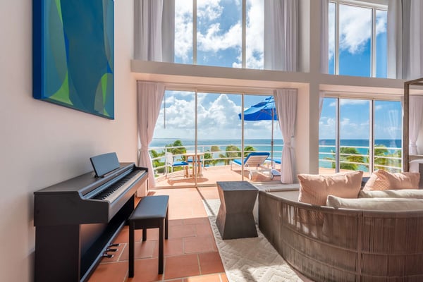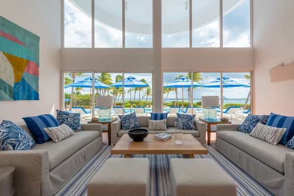 This 13,000 sq. ft. villa features new renovations that were finished in November 2021, one large principal bedroom suite, four additional guest bedrooms (all with king beds, TVs, and en-suite bathrooms), and one half-bedroom (with a day bed) for a total of 5.5 bedrooms. On the first floor, the magnificent common area features 21-foot high ceilings, floor-to-ceiling windows, a triangular, glass-topped dining table (with seating for up to fourteen people), and a custom-built semicircle bar that includes a cooktop, refrigerator, freezer, modern appliances, and wet bar – perfect for entertaining guests or hosting a night with one of our private chefs! The second floor features a fully-stocked entertainment room with a custom-made pool table, card tables, a ping pong table, a meditation room, and a stunning ocean view. The third floor features a private fitness center (with free weights, yoga mats, a bench, treadmill, and spin bike), one small half-bedroom, four guest bedrooms, and one palatial principal bedroom suite with a lofted office area and private terrace. The outdoor area features a heated, private swimming pool, hot tub (for up to 12 people), shaded dining table, and multiple lounge/sitting areas. The villa also features a modern elevator for seamless transportation to all floors. Blue Diamond’s unique flower-shaped design is perfect for large groups because all three levels have a central common area surrounded by smaller rooms in the “petals,” or alcoves. All rooms feature SONOS Bluetooth speakers that can be controlled by the guests.