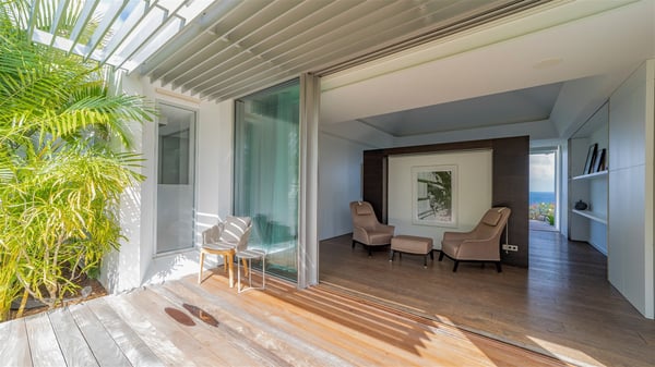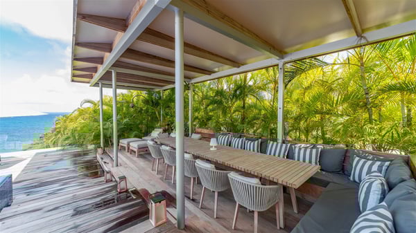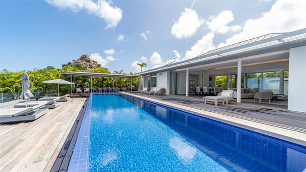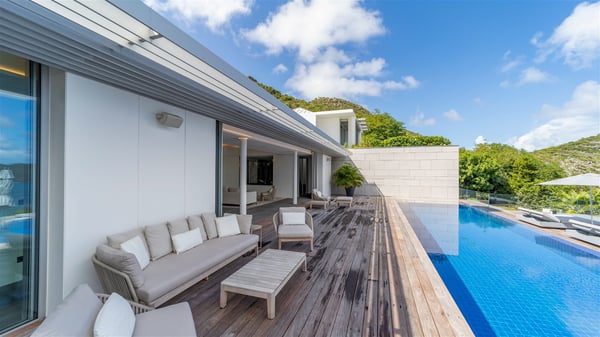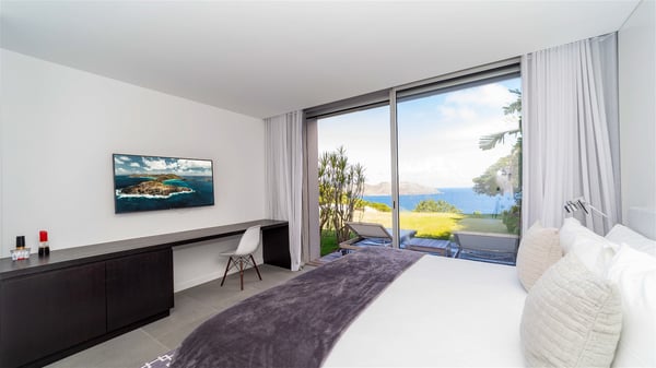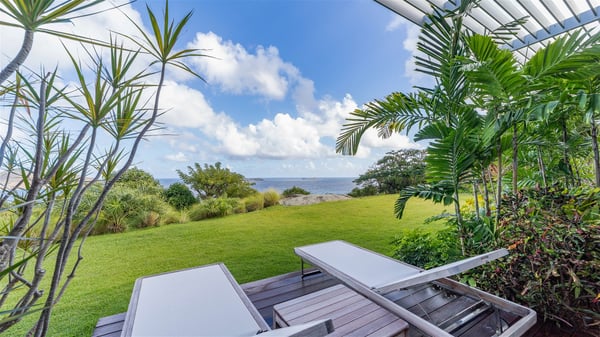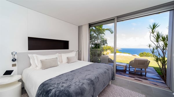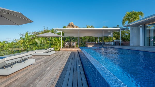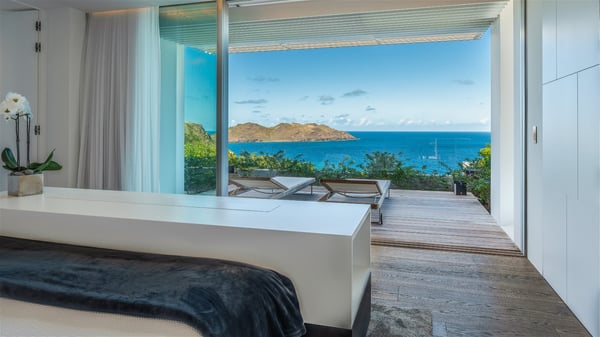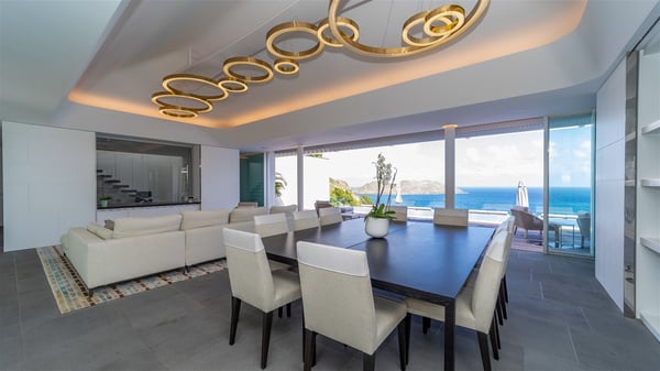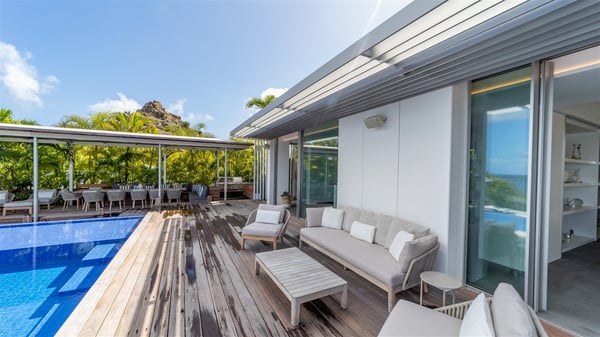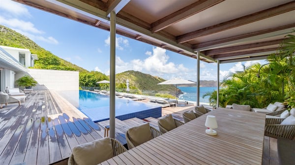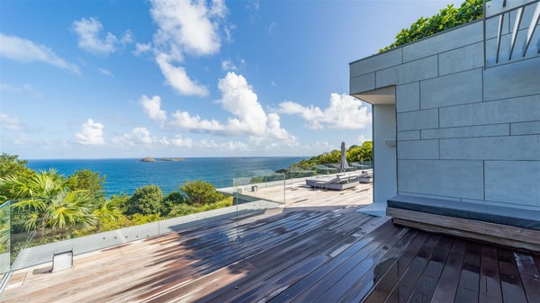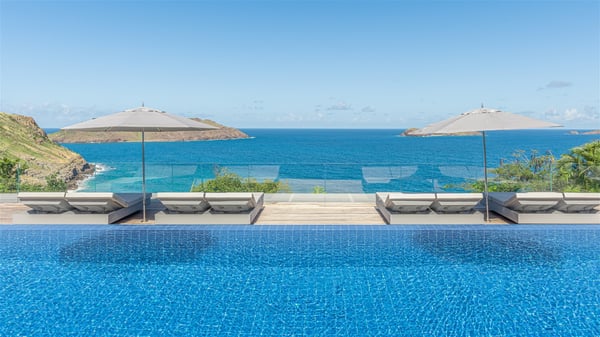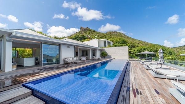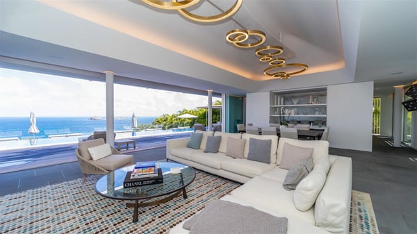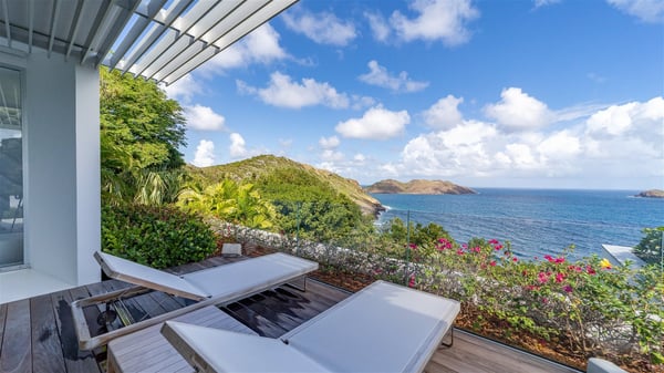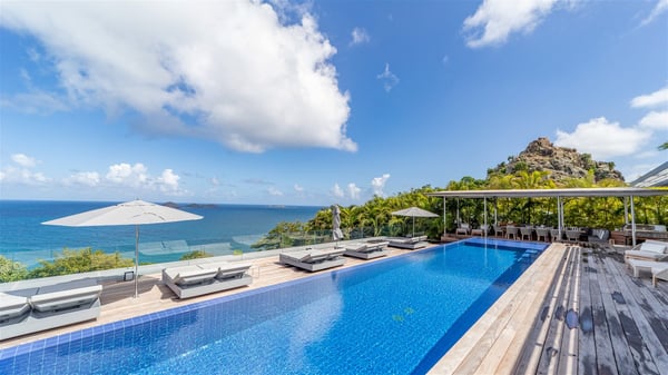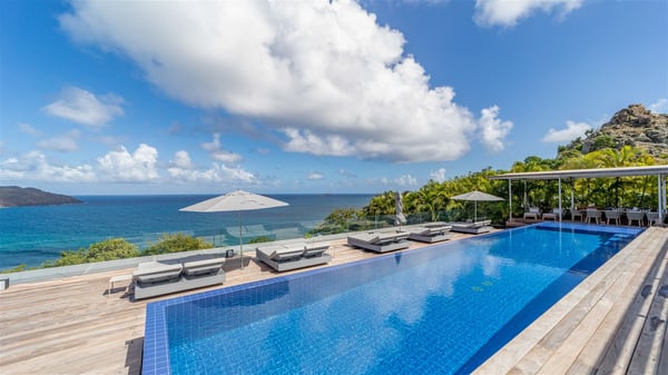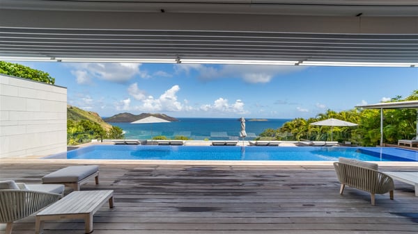 Villa Ciel D'Azur is a luxurious property located in Anse des Cayes with a fantastic view over the ocean and the tropical vegetation. As it features high-quality amenities, including an infinity swimming pool, a jacuzzi and fitness, TV, game and massage rooms, this six-bedroom vacation home welcomes families or large groups of friends for an exceptional stay in St. Barths. The vacation rental villa Ciel D'Azur was built in a very contemporary style over several levels mixing spaces and natural light that comes in through large bay windows. The living space opens on one side onto the deep blue ocean, and on the other side onto the tropical garden. The air-conditioned living room is comfortably furnished with a large L-shaped sofa close to the dining room for ten guests, and the striking white, fully-equipped kitchen with a breakfast bar and stools perfect to chat over a coffee. In front of the view over Anse des Cayes, the atmosphere is truly peaceful and relaxing, a wonderful scenery to marvel at. The front terrace of villa Ciel D'Azur is breathtakingly beautiful as it faces the ocean. There is a heated infinity swimming pool surrounded by lounge chairs and sunbeds under large umbrellas for pleasant sunbathing or reading sessions. Sheltered by a pergola, a comfortable outdoor lounge with a dining table is set up on the side of the terrace close to the barbecue for delicious al fresco meals under the Caribbean stars. The atmosphere is heavenly on this terrace furnished with fine sofas, soft lights and lovely cushions in an idyllic scenery of palm trees and flowering shrubs. Perfect for a large family or couples of friends, villa Ciel D'Azur consists of six beautiful air-conditioned bedrooms over several levels. Very private, spacious and bright, they have en-suite bathrooms and offer splendid ocean views. All the bedrooms are furnished with king-size beds, except one which features bunk beds, a perfect set up for children. A fitness room with a jacuzzi, a massage room and an air-conditioned TV space are also at your disposal, to make your stay in St. Barths a truly enchanted and unforgettable one.