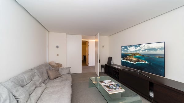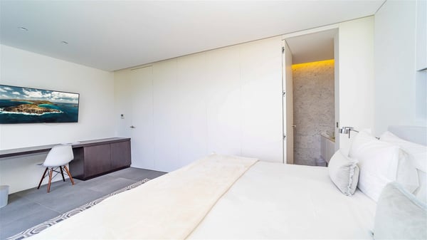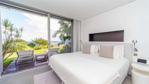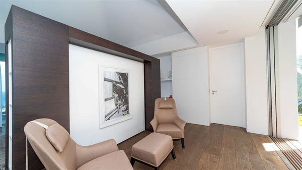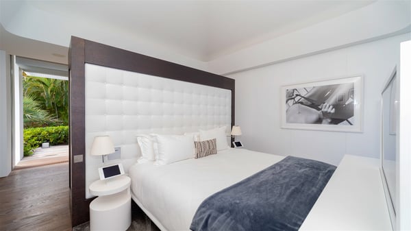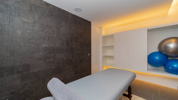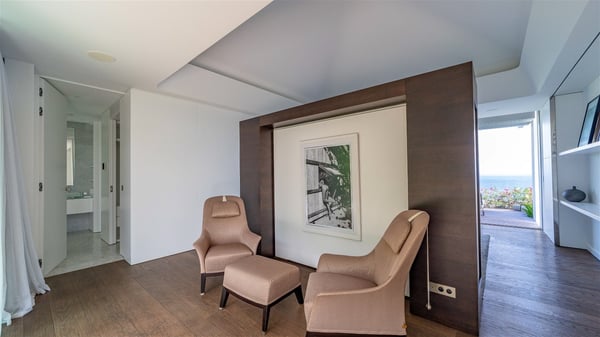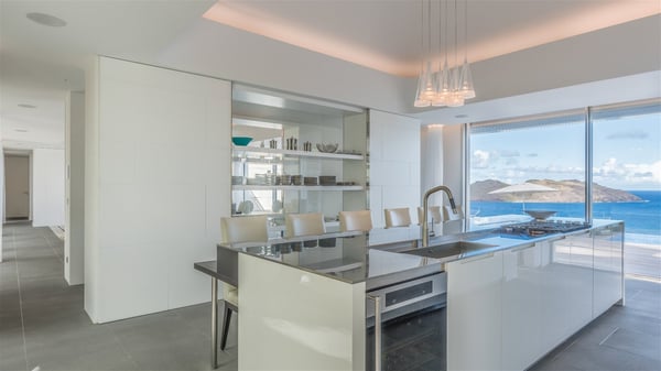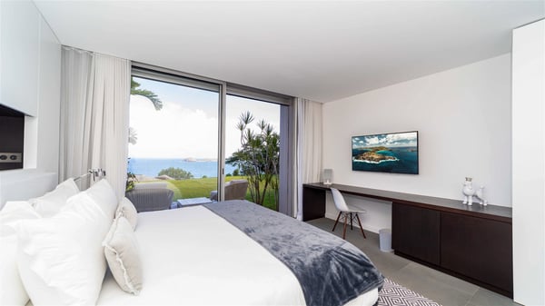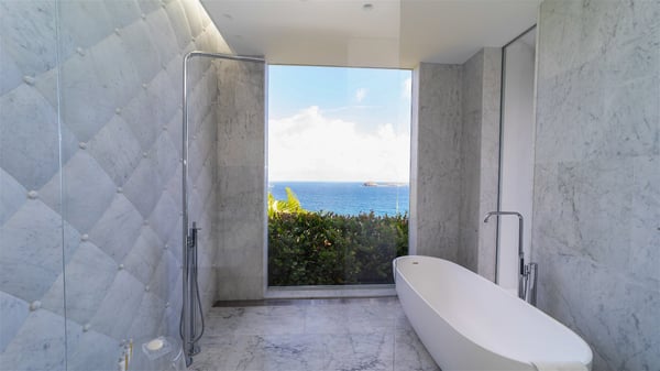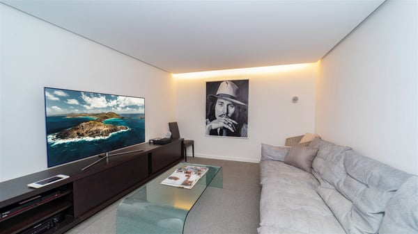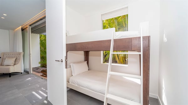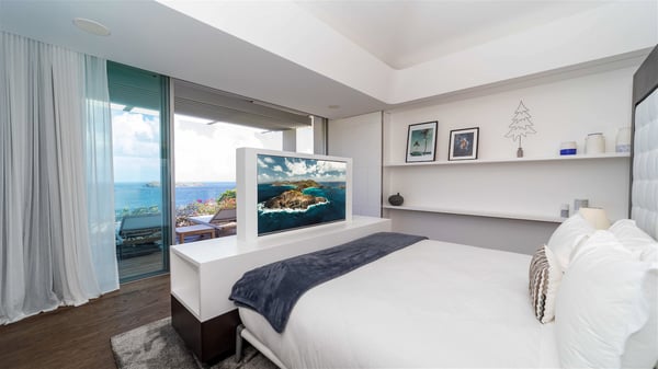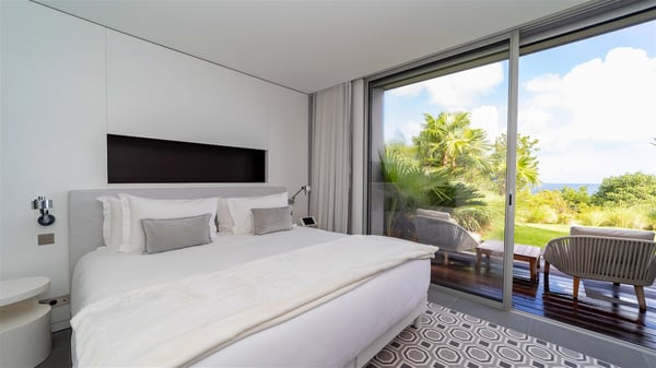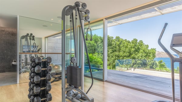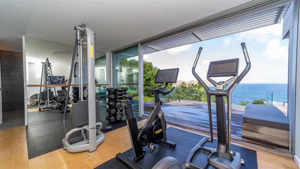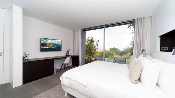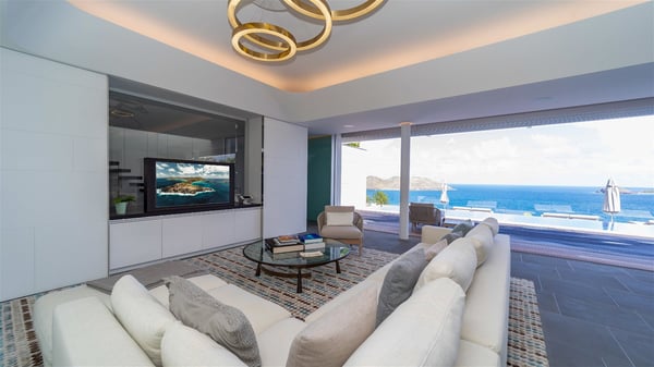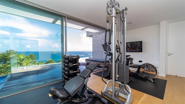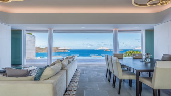 Villa Ciel D'Azur is a luxurious property located in Anse des Cayes with a fantastic view over the ocean and the tropical vegetation. As it features high-quality amenities, including an infinity swimming pool, a jacuzzi and fitness, TV, game and massage rooms, this six-bedroom vacation home welcomes families or large groups of friends for an exceptional stay in St. Barths. The vacation rental villa Ciel D'Azur was built in a very contemporary style over several levels mixing spaces and natural light that comes in through large bay windows. The living space opens on one side onto the deep blue ocean, and on the other side onto the tropical garden. The air-conditioned living room is comfortably furnished with a large L-shaped sofa close to the dining room for ten guests, and the striking white, fully-equipped kitchen with a breakfast bar and stools perfect to chat over a coffee. In front of the view over Anse des Cayes, the atmosphere is truly peaceful and relaxing, a wonderful scenery to marvel at. The front terrace of villa Ciel D'Azur is breathtakingly beautiful as it faces the ocean. There is a heated infinity swimming pool surrounded by lounge chairs and sunbeds under large umbrellas for pleasant sunbathing or reading sessions. Sheltered by a pergola, a comfortable outdoor lounge with a dining table is set up on the side of the terrace close to the barbecue for delicious al fresco meals under the Caribbean stars. The atmosphere is heavenly on this terrace furnished with fine sofas, soft lights and lovely cushions in an idyllic scenery of palm trees and flowering shrubs. Perfect for a large family or couples of friends, villa Ciel D'Azur consists of six beautiful air-conditioned bedrooms over several levels. Very private, spacious and bright, they have en-suite bathrooms and offer splendid ocean views. All the bedrooms are furnished with king-size beds, except one which features bunk beds, a perfect set up for children. A fitness room with a jacuzzi, a massage room and an air-conditioned TV space are also at your disposal, to make your stay in St. Barths a truly enchanted and unforgettable one.